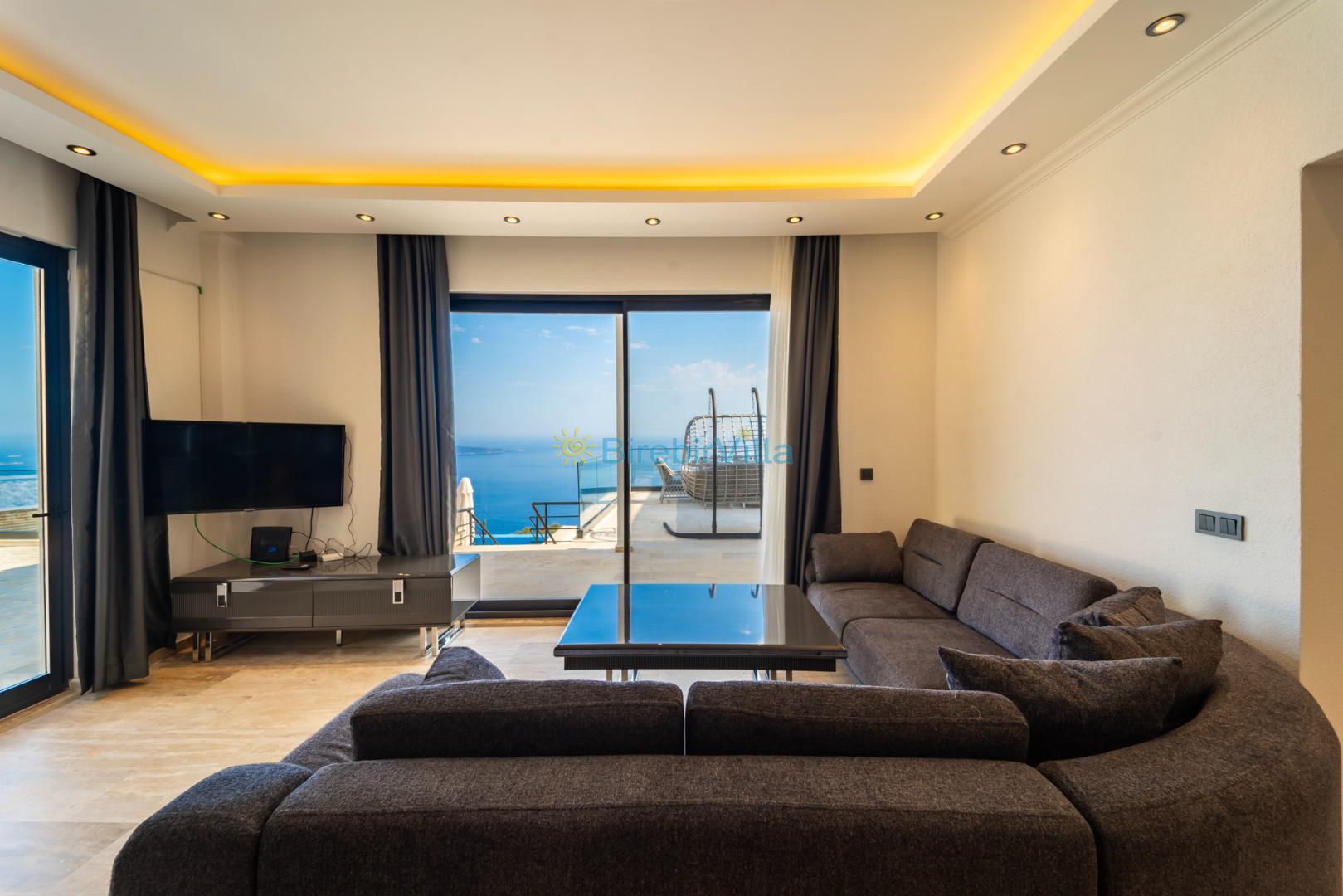 Salon: Özenle döşenmiş muhteşem deniz manzaralı açık mutfaklı salon, klima, modern koltuklar ve havuz-teras alanına çıkışı bulunmaktadır.
