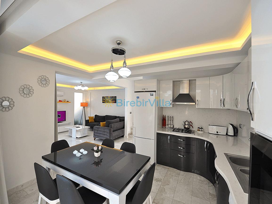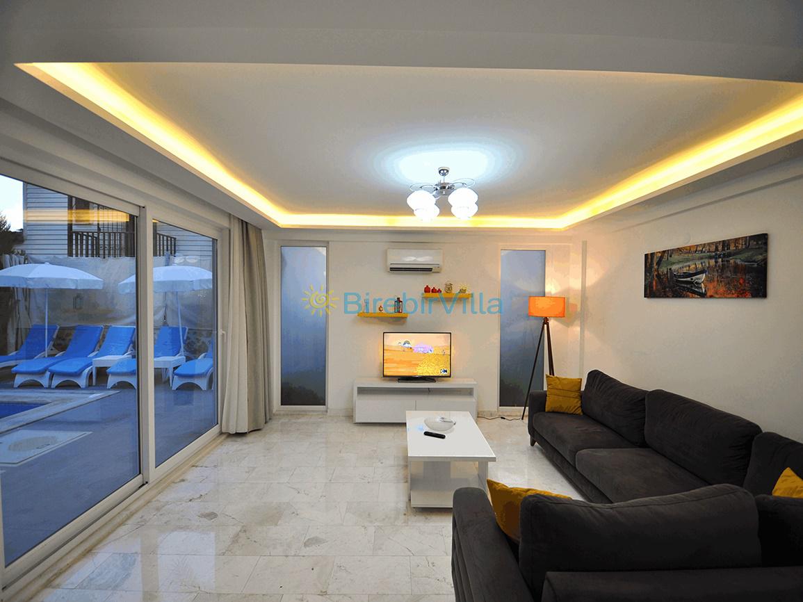 Salon: Özenle döşenmiş muhteşem açık mutfaklı salon, koltuklar, Lcd tv, uydu alıcısı, şömine ve klima bulunmaktadır.