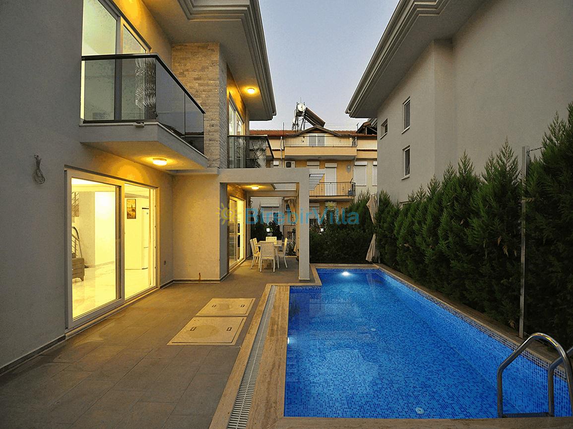Villa Aydın, Fethiye merkezde yer alan, 4 yatak odalı ve 8 kişi konaklama kapasiteli özel havuzlu lüks kiralık tatil villasıdır. Geniş yaşam alanları ve modern mimarisiyle öne çıkan villa, kalabalık aileler ve arkadaş grupları için konforlu bir tatil imkânı sunmaktadır. Fethiye villa kiralama, Fethiye özel havuzlu villa ve 8 kişilik kiralık villa arayışında olan misafirler için ideal bir seçenek olan Villa Aydın, sakin konumu sayesinde huzurlu bir konaklama deneyimi yaşatır. Özel yüzme havuzu ve ferah bahçe alanı, tatilin keyfini doyasıya çıkarmanıza olanak tanır.