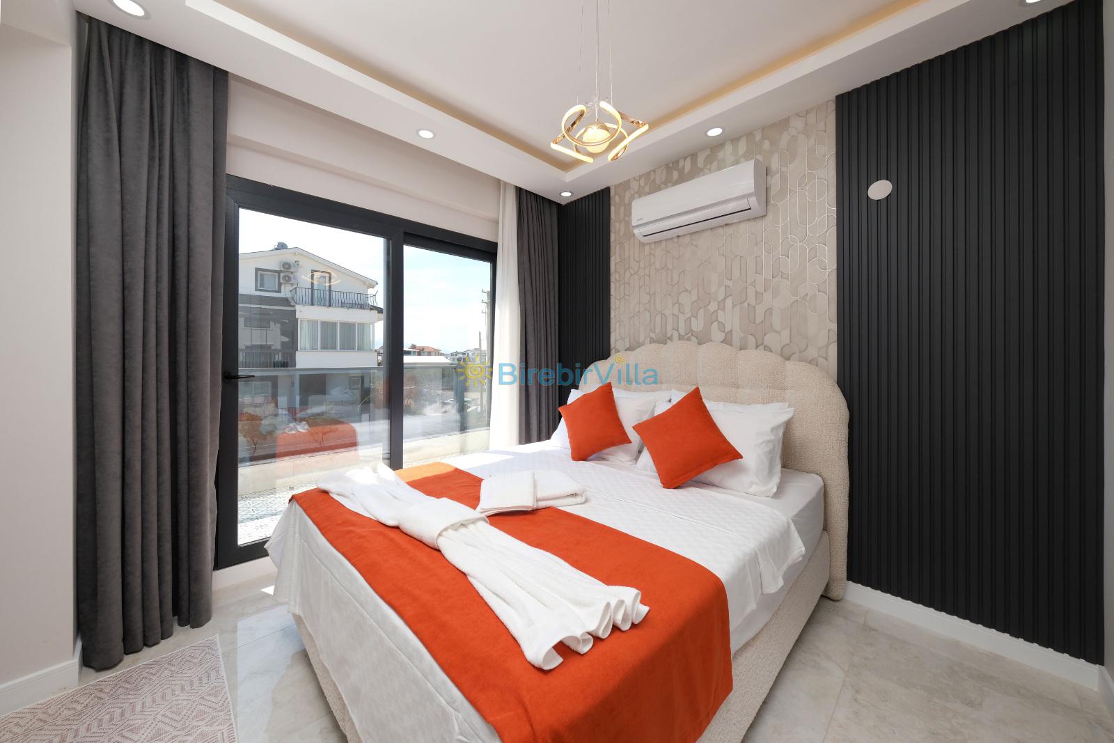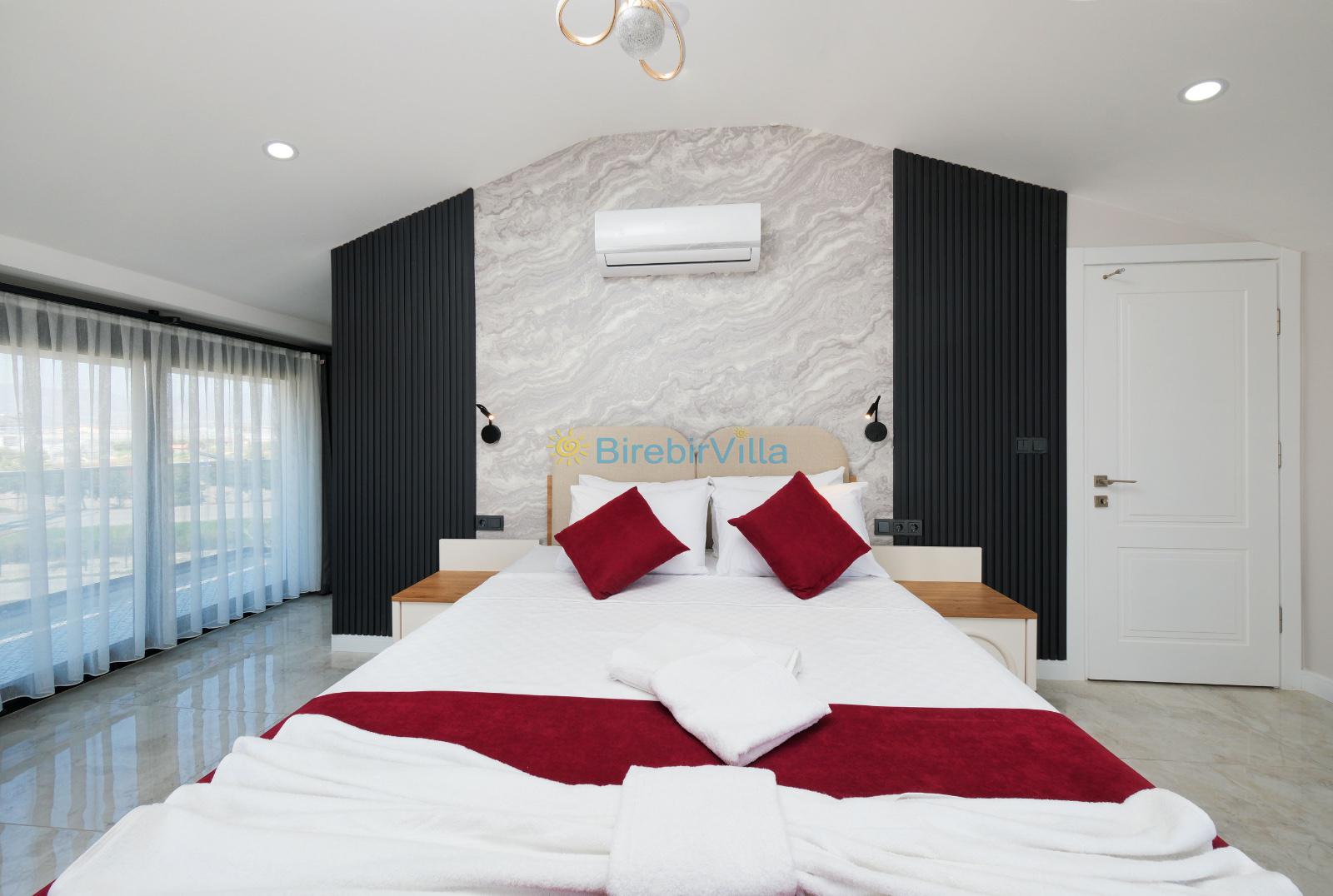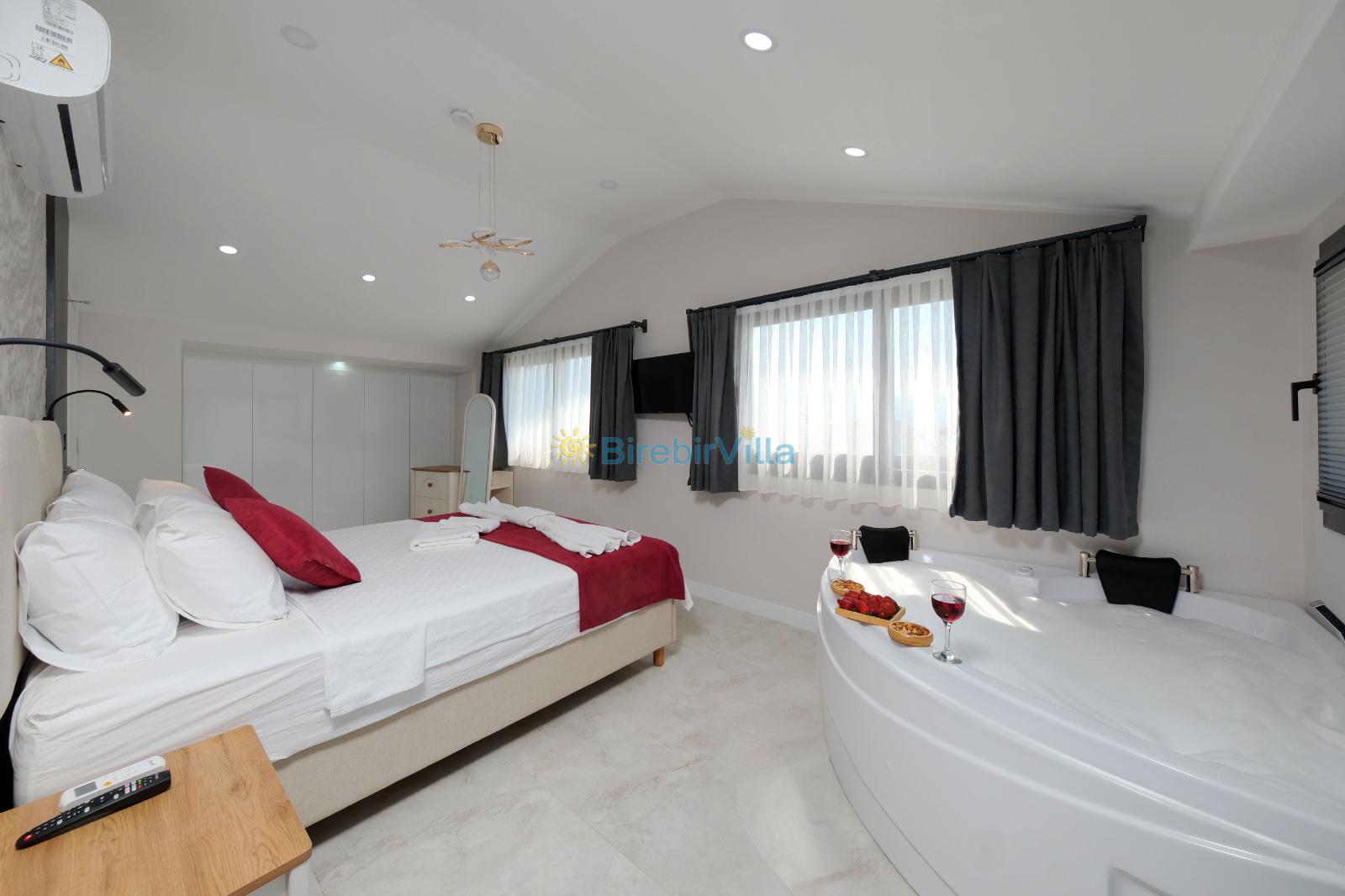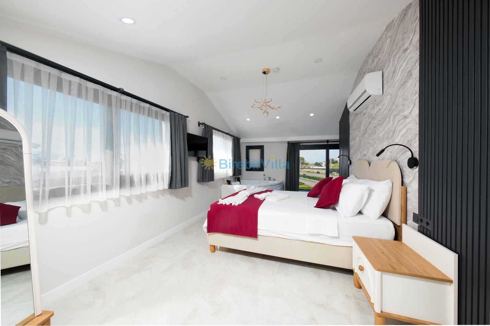 1.Yatak odası: Çift kişilik yatak, klima, ebeveyn banyosu, jakuzi, televizyon, komodin, elbise dolabı ve balkon bulunmaktadır.