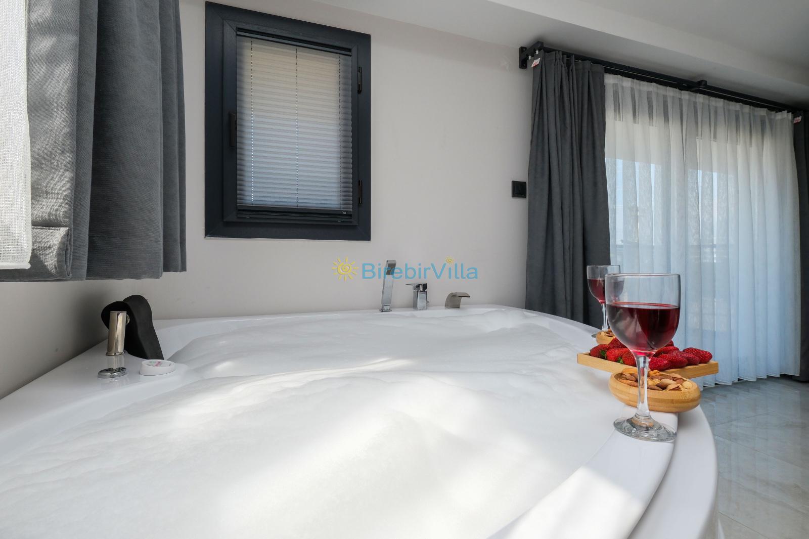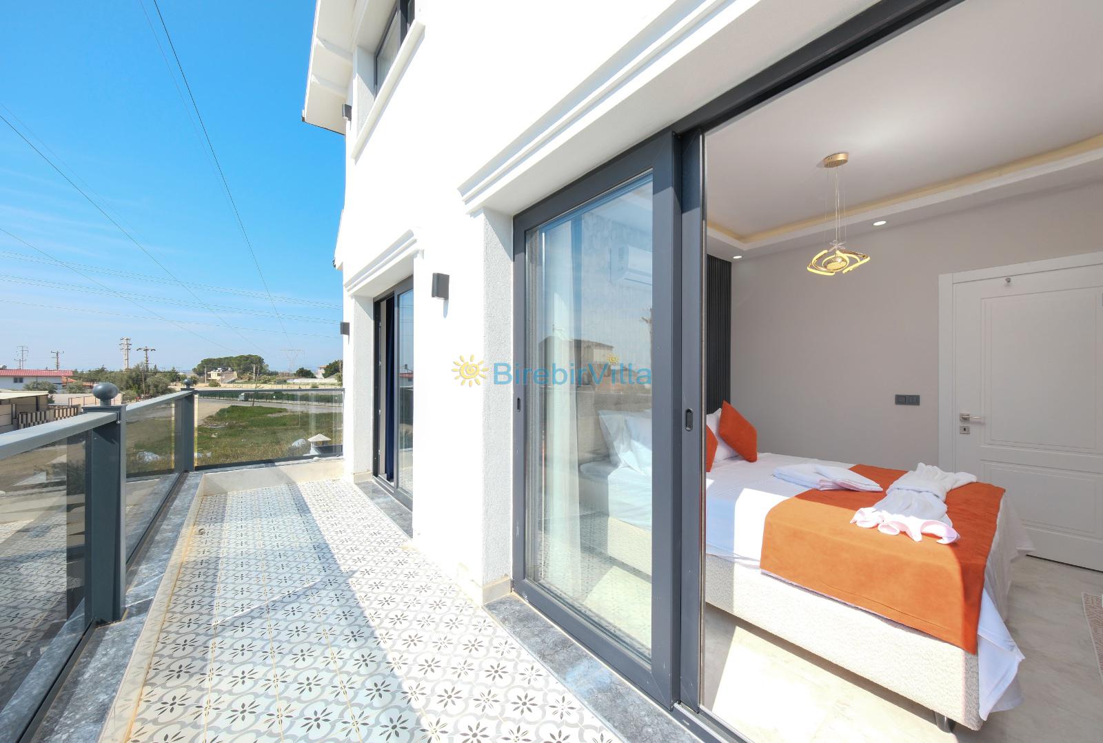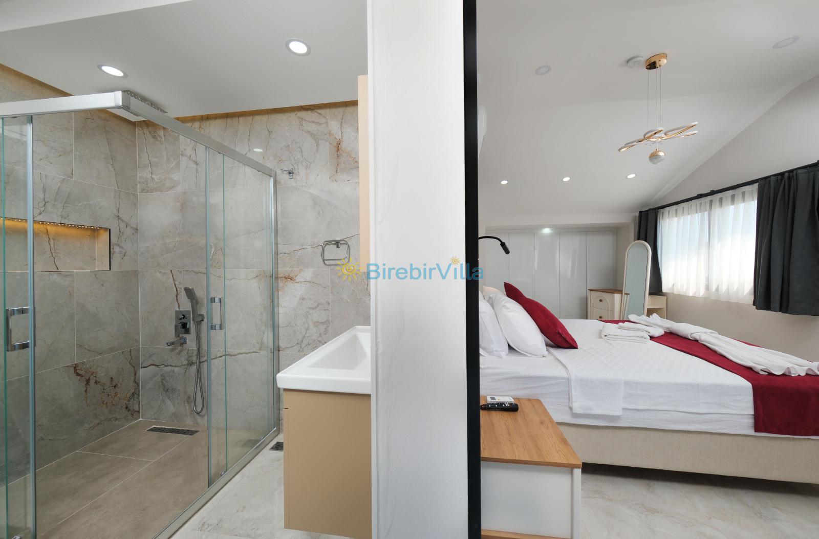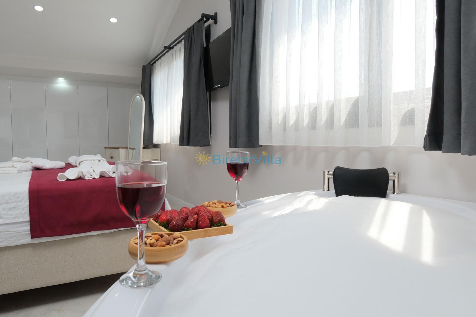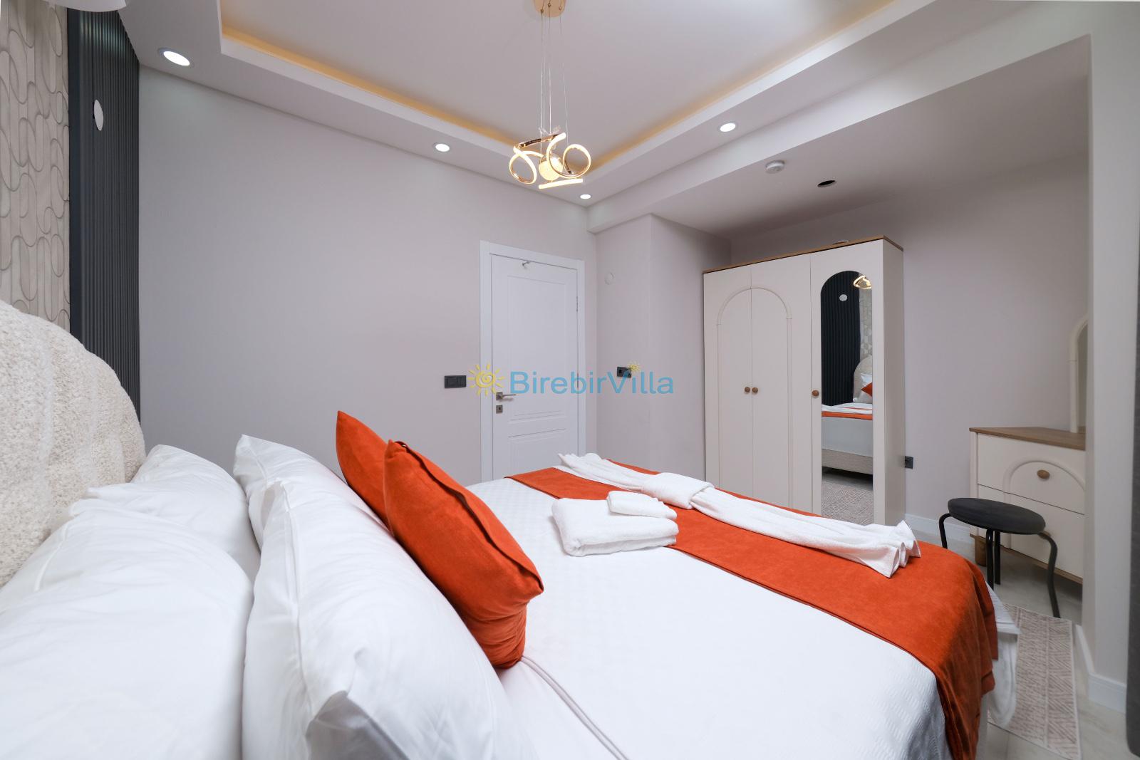 1.Yatak odası: Çift kişilik yatak, klima, ebeveyn banyosu, jakuzi, televizyon, komodin, elbise dolabı ve balkon bulunmaktadır.
