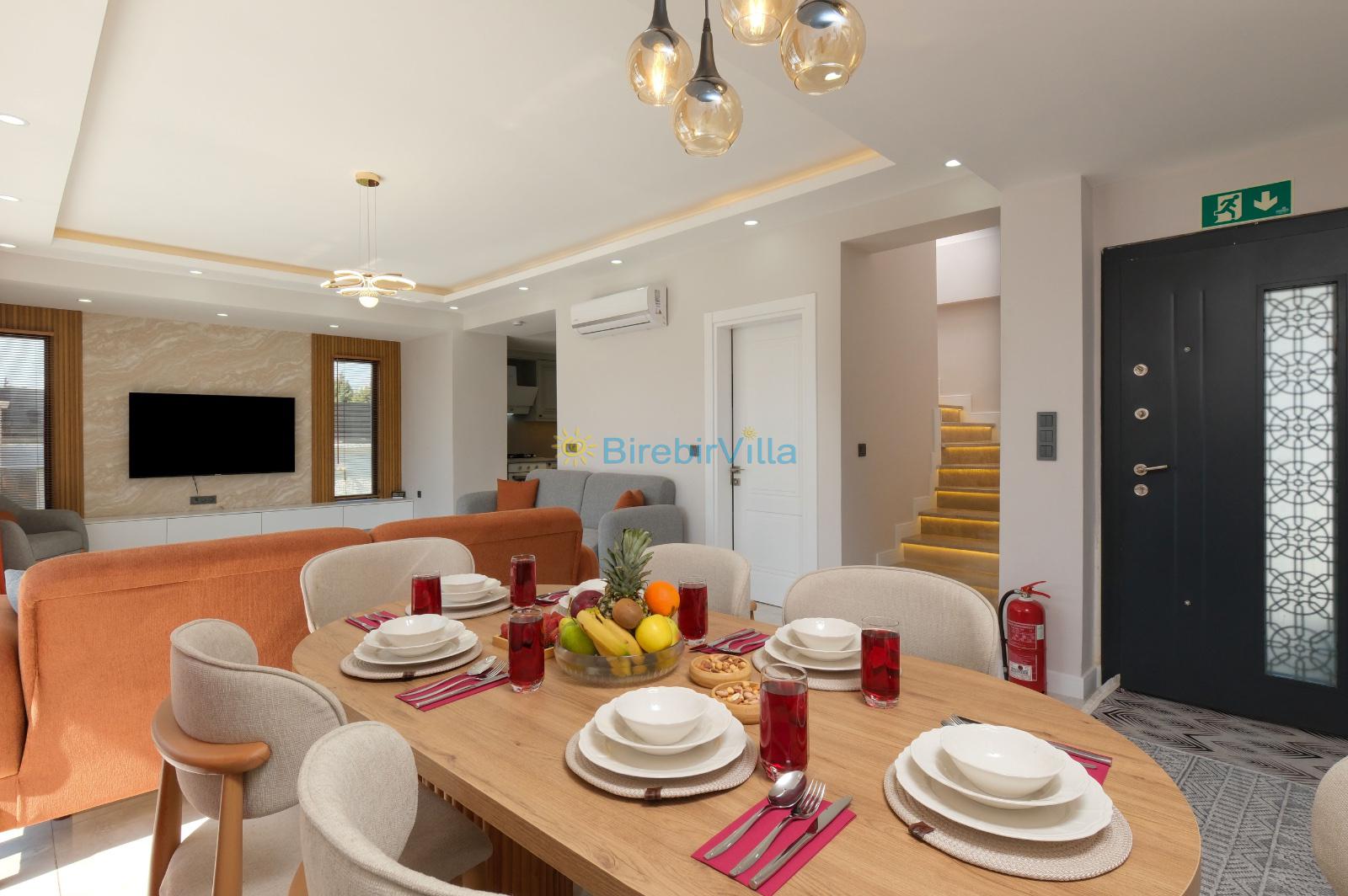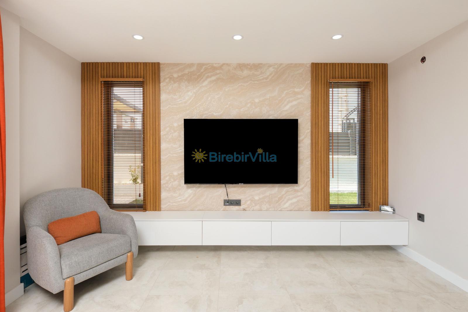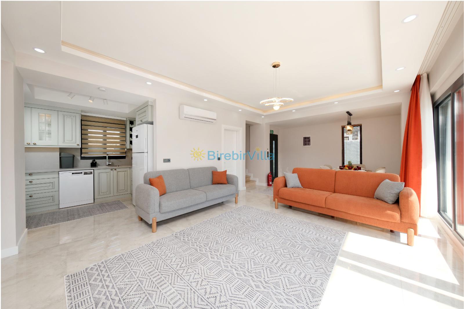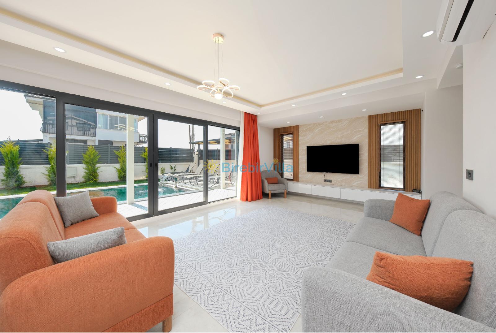 Salon: Açık mutfaklı salon, şömine, modern koltuklar, Lcd tv, uydu alıcısı ve klima bulunmaktadır. Salondan havuz ve bahçeye açılan kapısı mevcuttur.