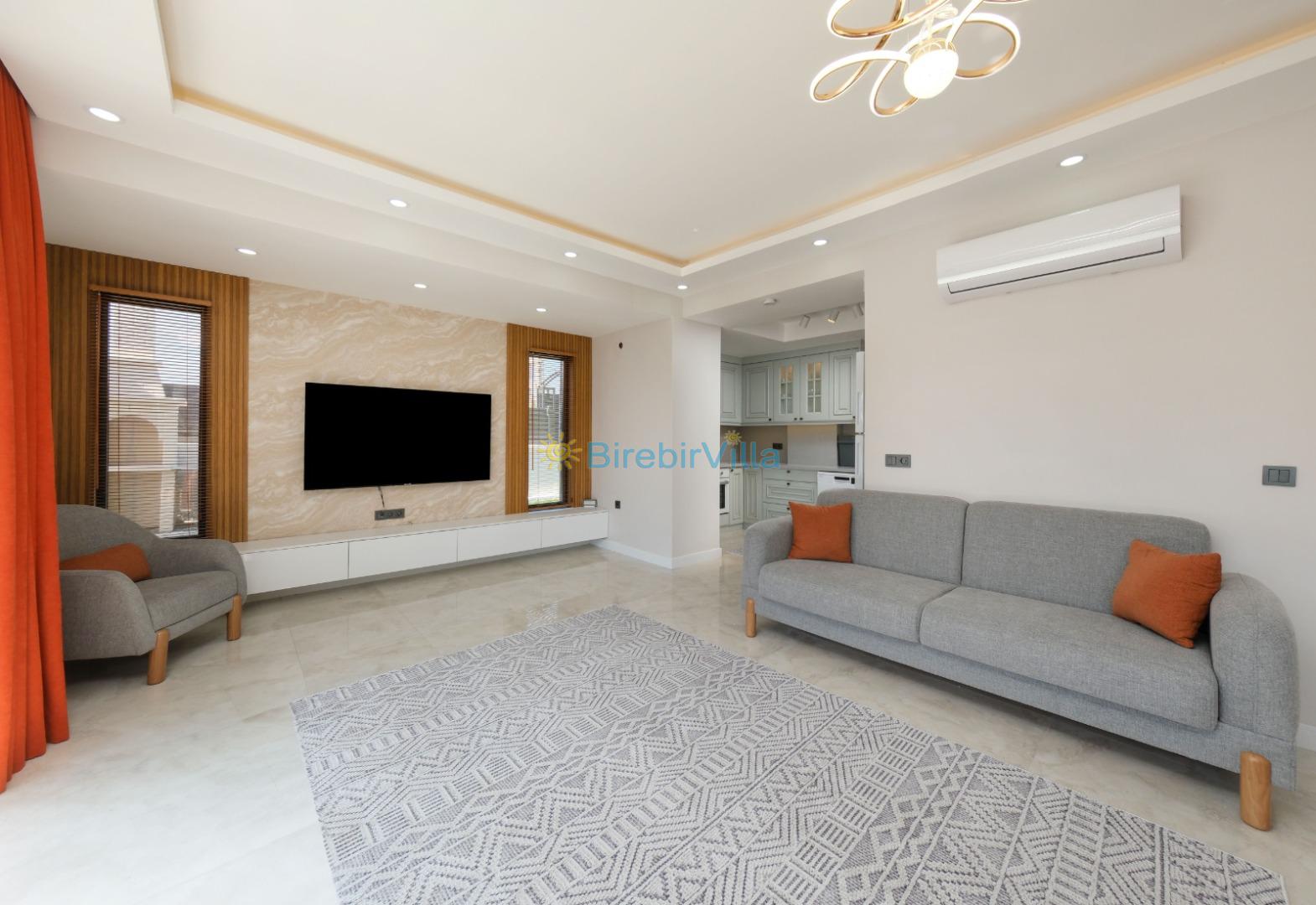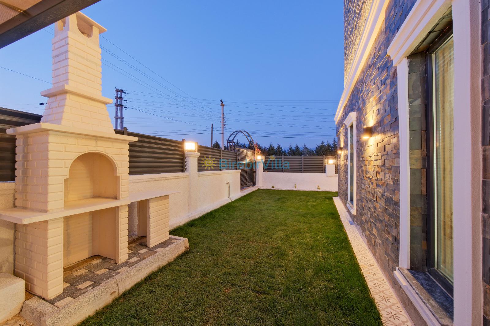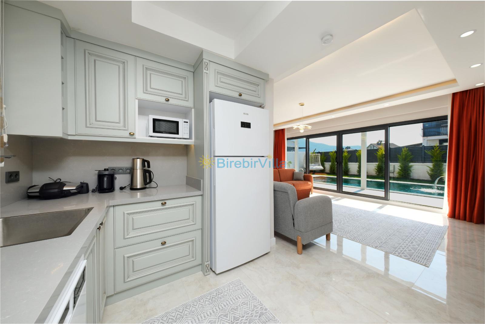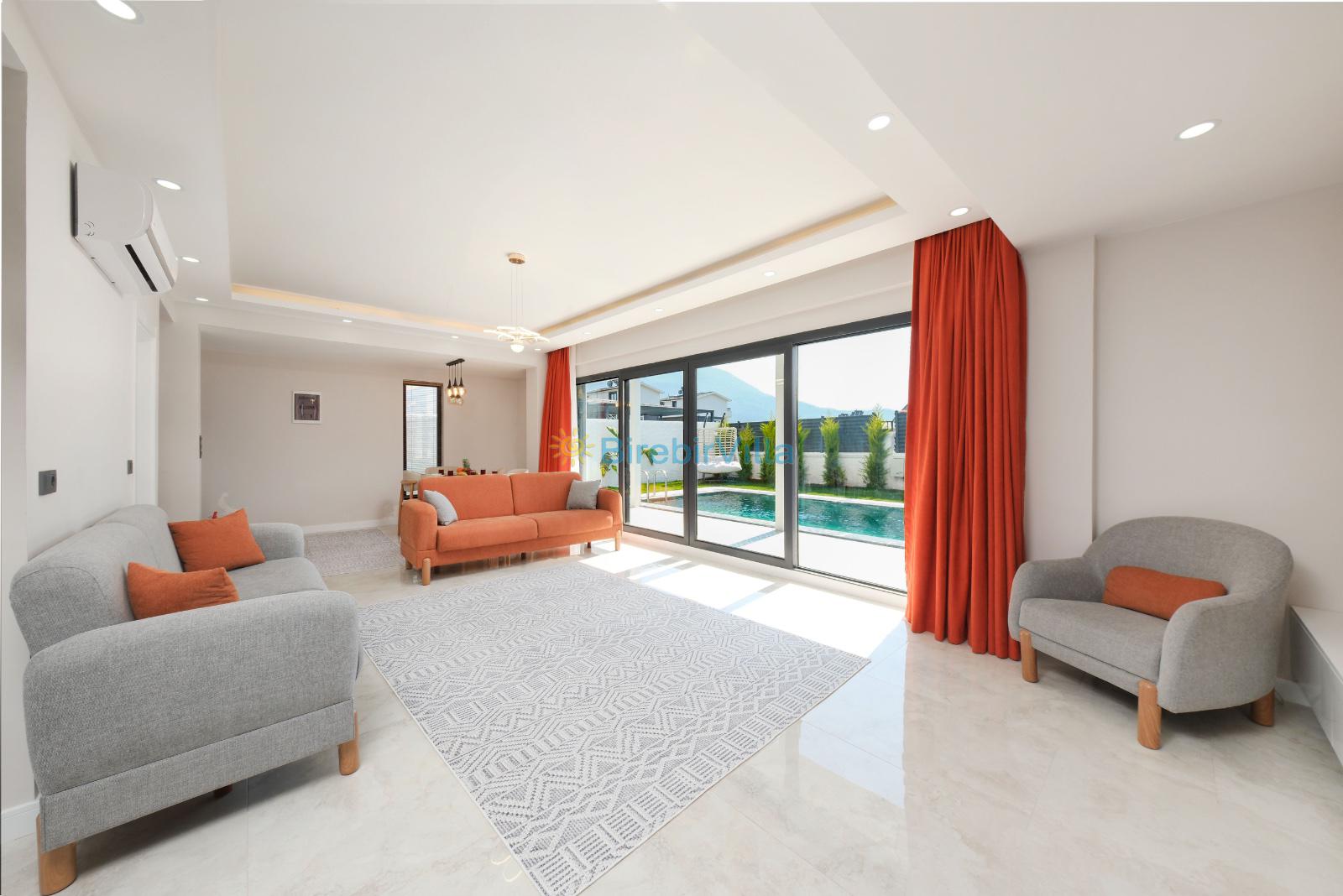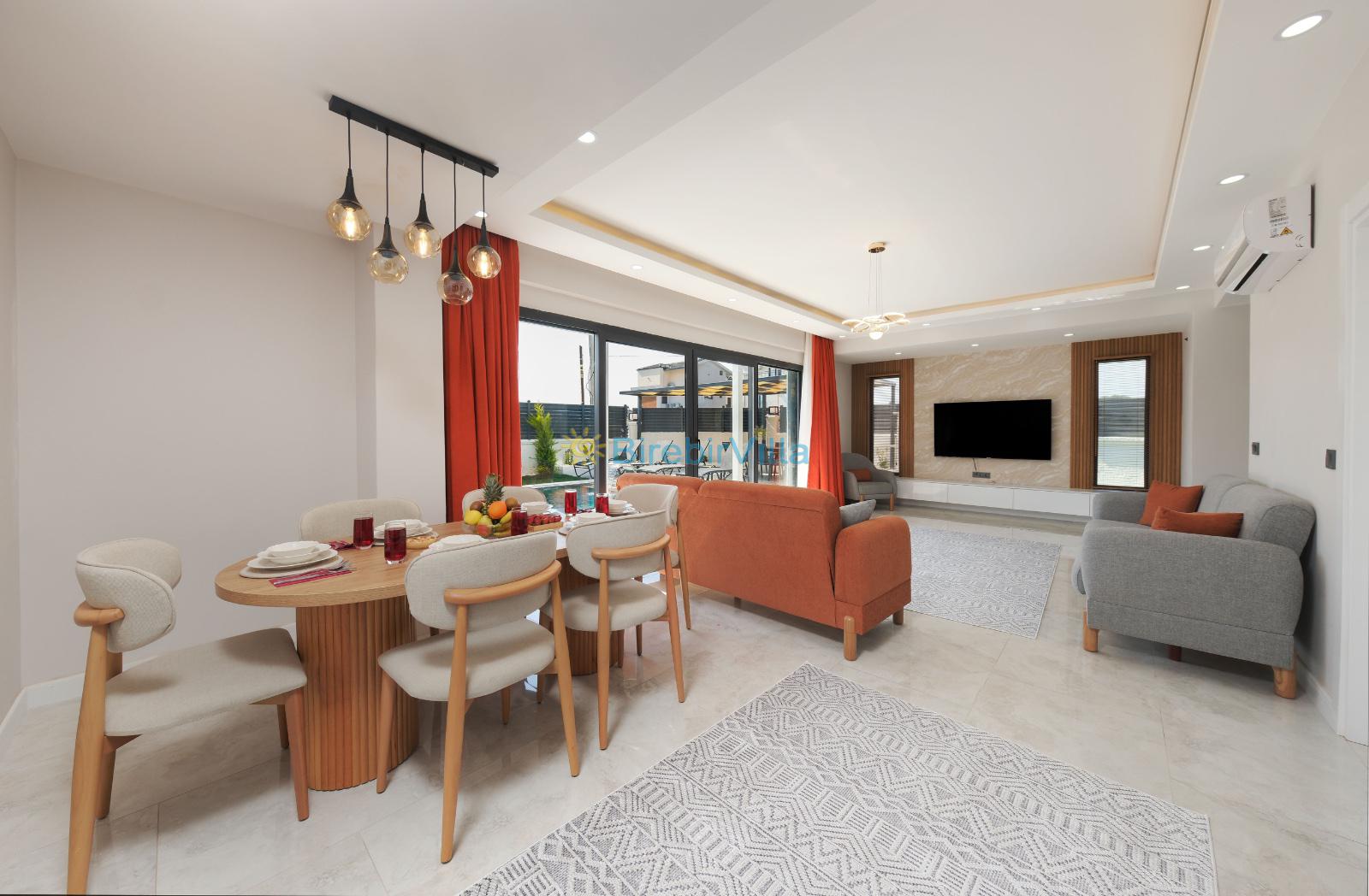 Salon: Açık mutfaklı salon, şömine, modern koltuklar, Lcd tv, uydu alıcısı ve klima bulunmaktadır. Salondan havuz ve bahçeye açılan kapısı mevcuttur.