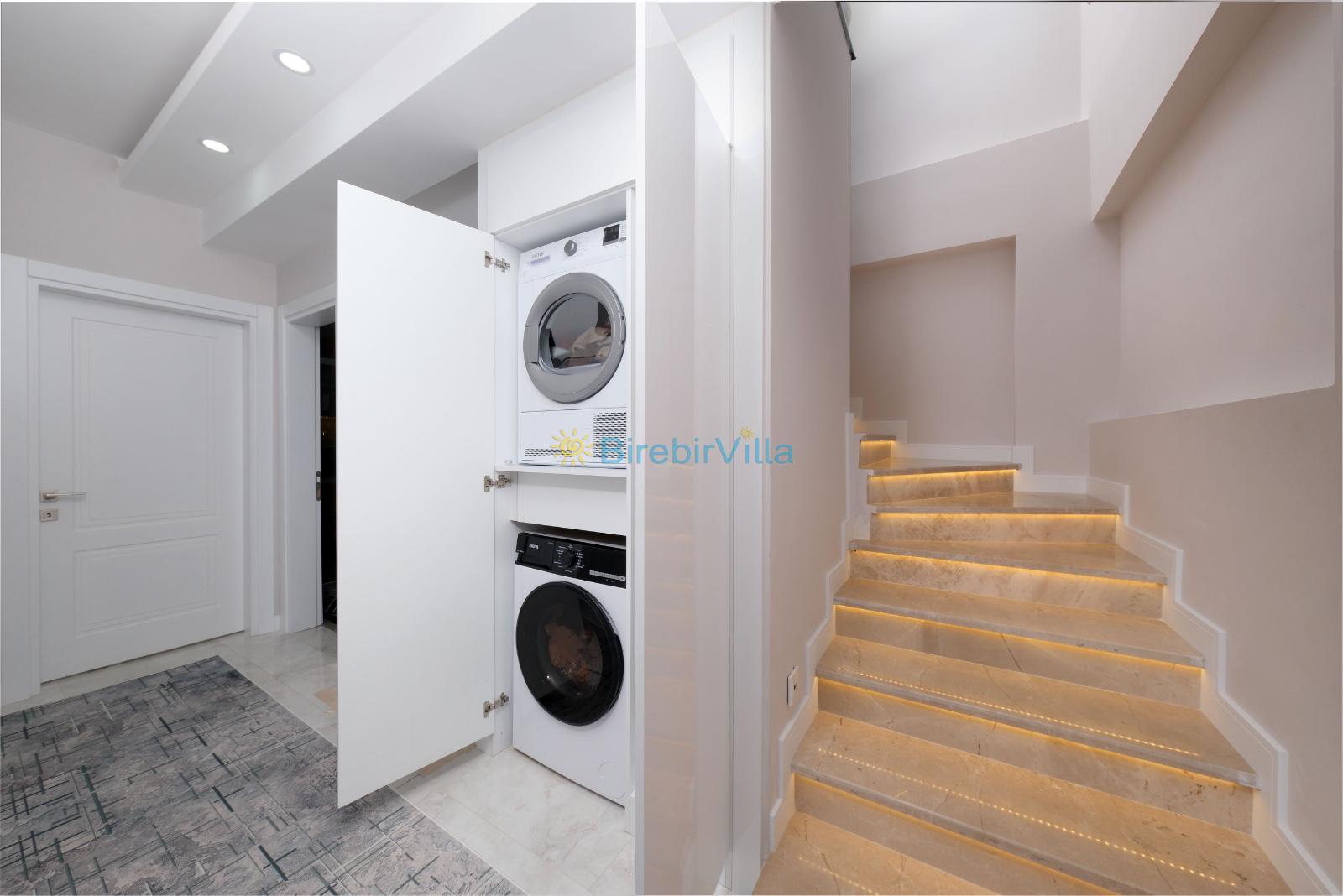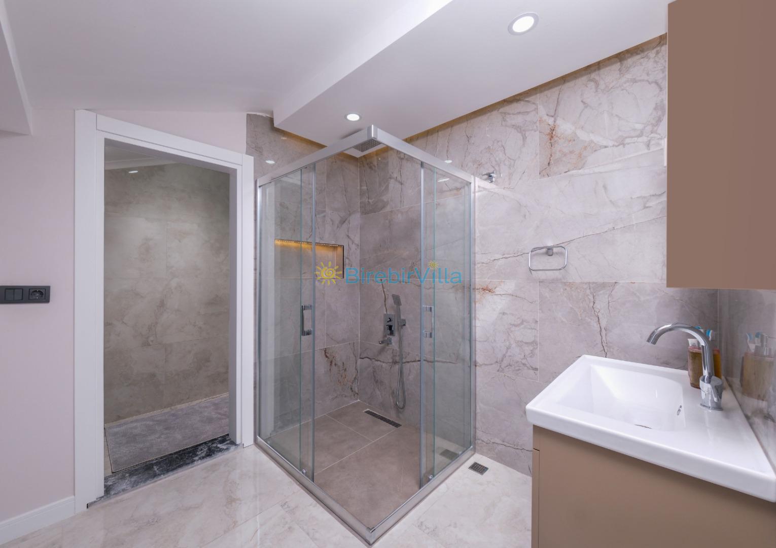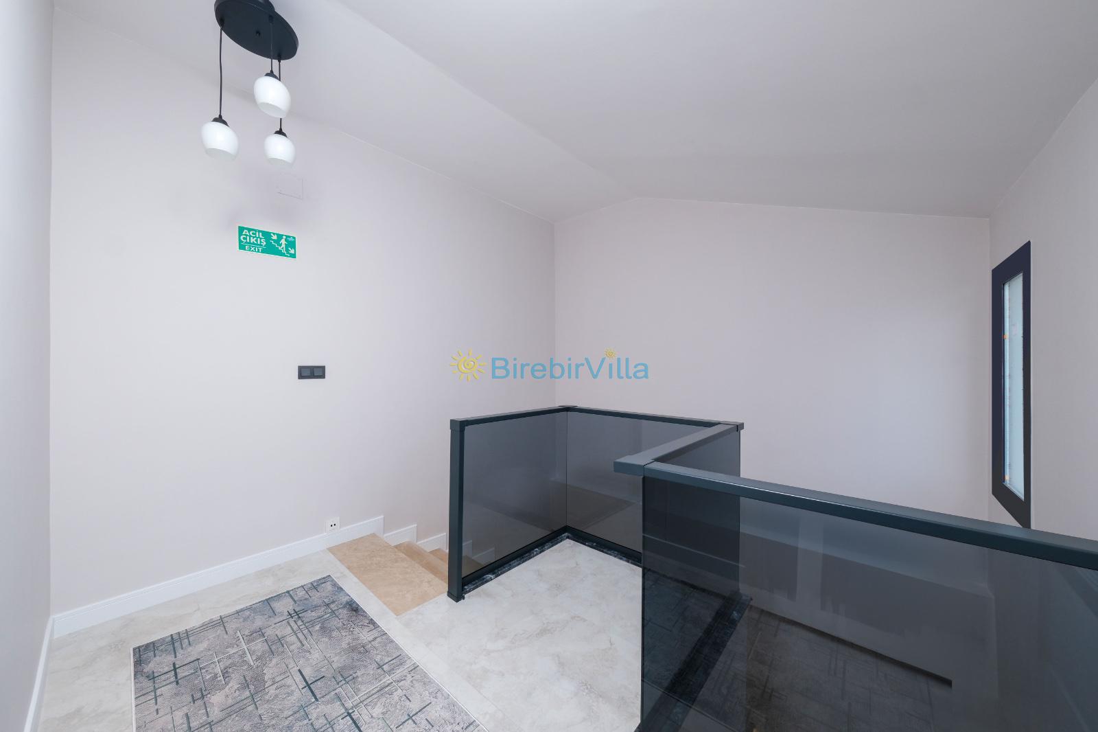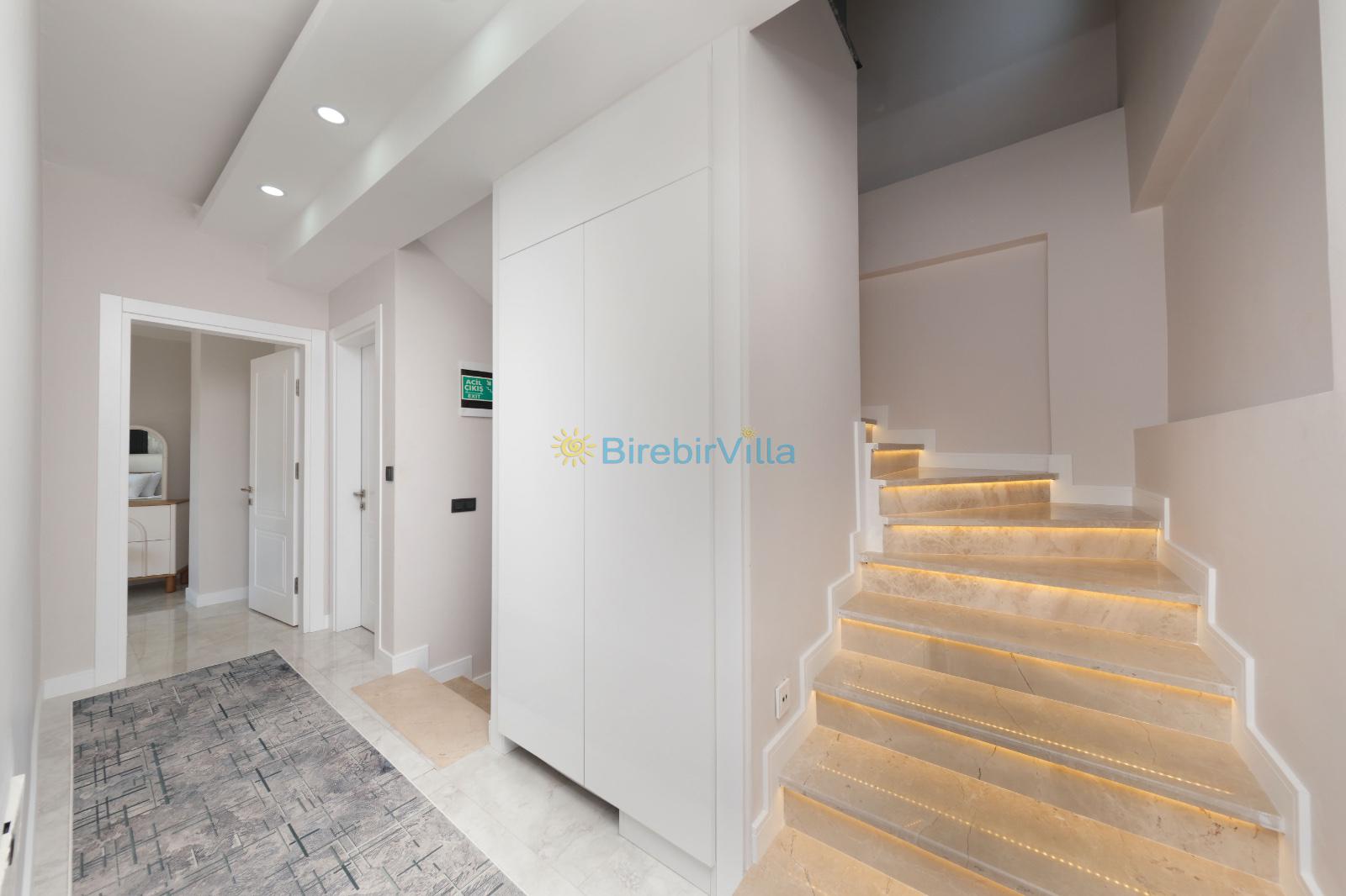 Salon: Açık mutfaklı salon, şömine, modern koltuklar, Lcd tv, uydu alıcısı ve klima bulunmaktadır. Salondan havuz ve bahçeye açılan kapısı mevcuttur.