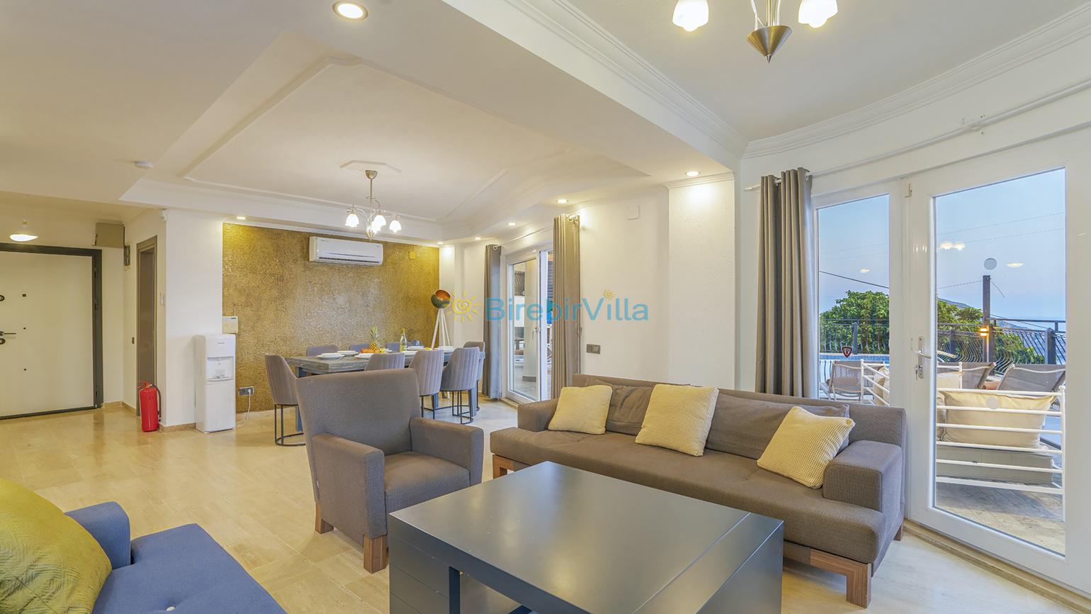 Salon: Özenle döşenmiş salon, modern koltuklar, yemek masası, Lcd tv, uydu alıcısı, dvd player ve klima bulunmaktadır.