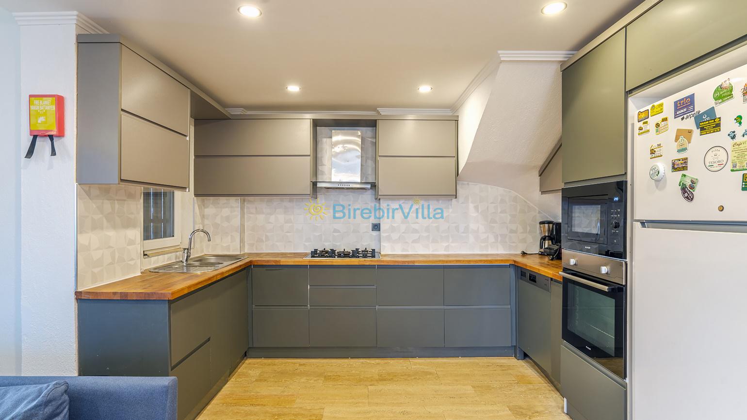 Mutfak: Açık planlı mutfak, 10 kişi ve daha fazla kişiye yetecek kadar mutfak malzemeleri, çamaşır makinesi, bulaşık makinesi, fırın, ocak, buzdolabı, mikrodalga fırın, tost makinesi, çaydanlık ve kettle bulunmaktadır.