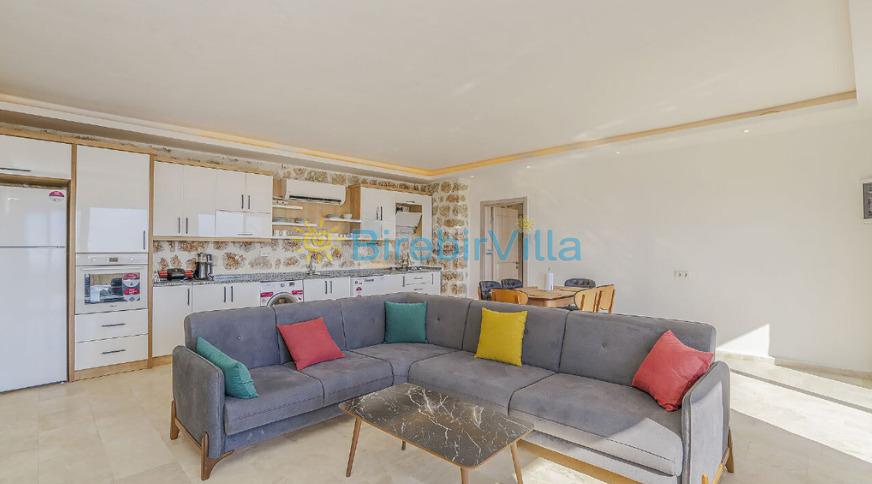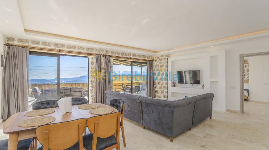 Salon: Açık planlı salon, modern oturma grubu, klima, Lcd tv, uydu alıcı ve 6 kişilik yemek masası bulunmaktadır. Salondan havuza açılan çıkış kapısı bulunmaktadır.