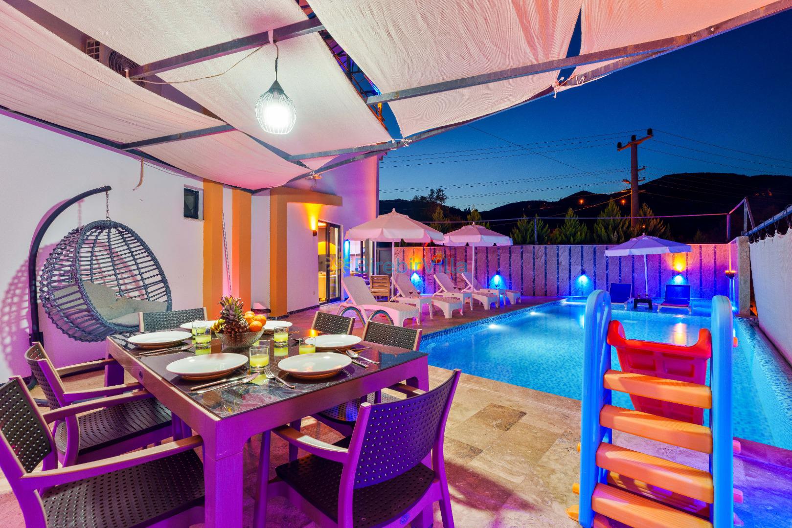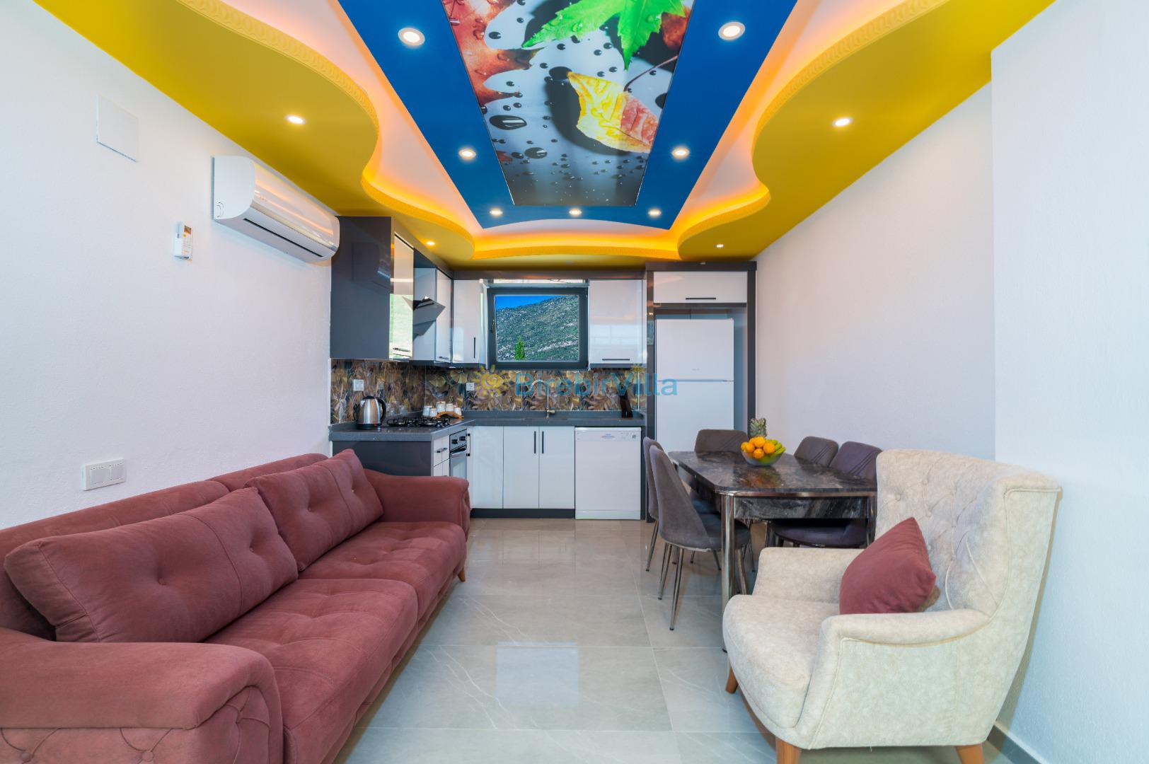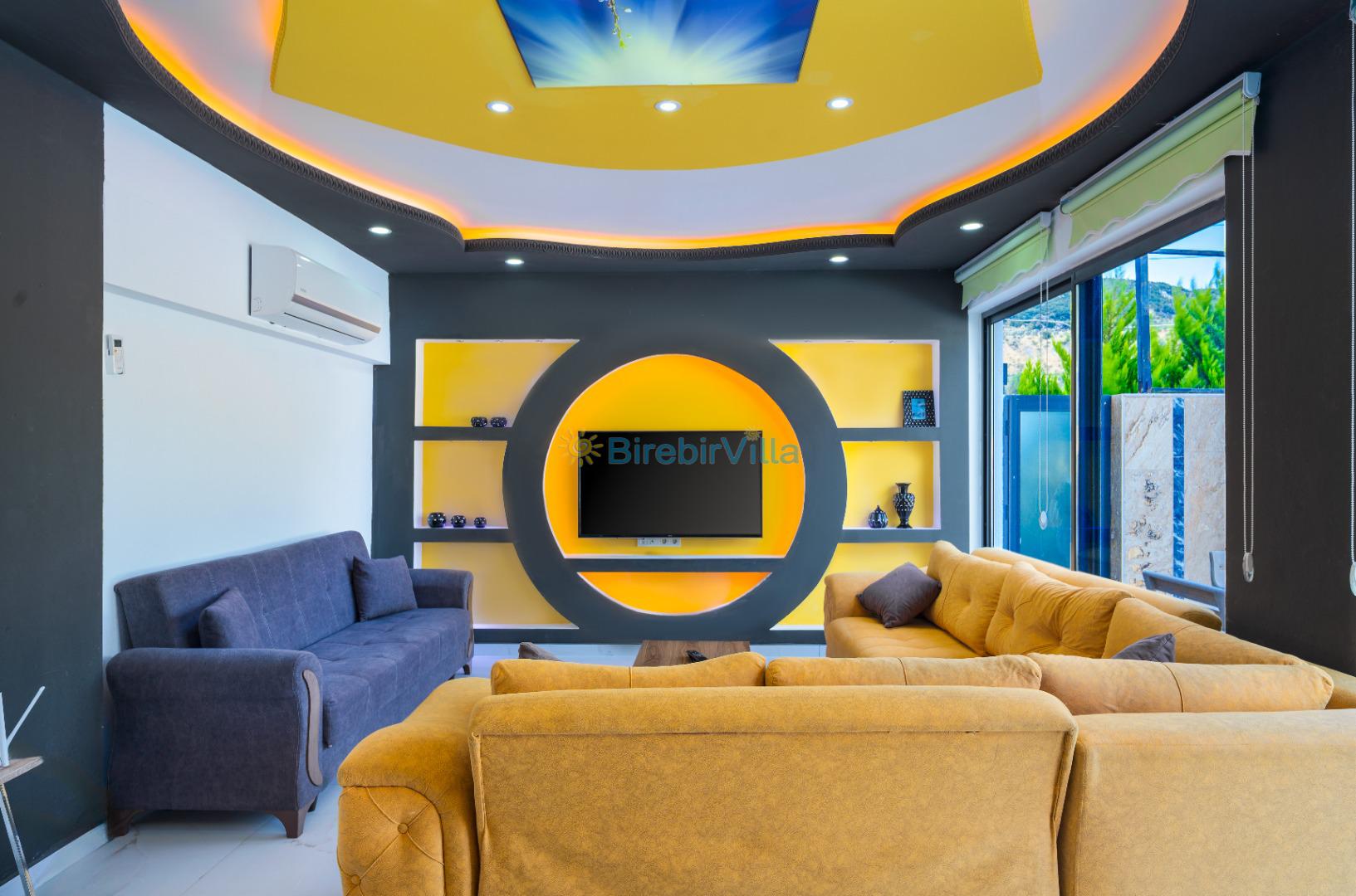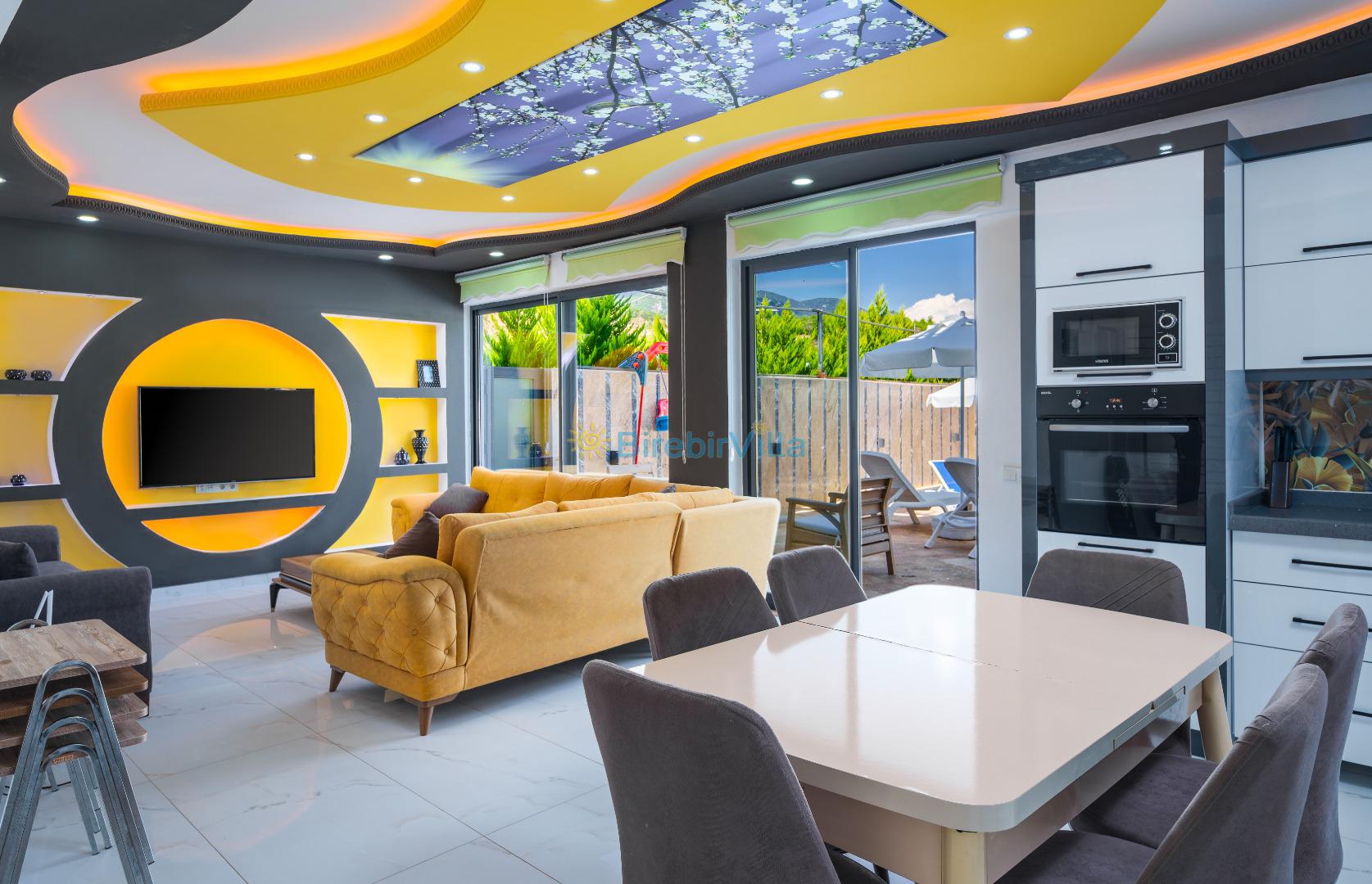 Salon: Açık mutfaklı salon, koltuklar, klima, Lcd tv, internet, uydu alıcı, oturma grubu ve yemek masası bulunmaktadır. Salondan havuza açılan bir çıkışımız mevcuttur.