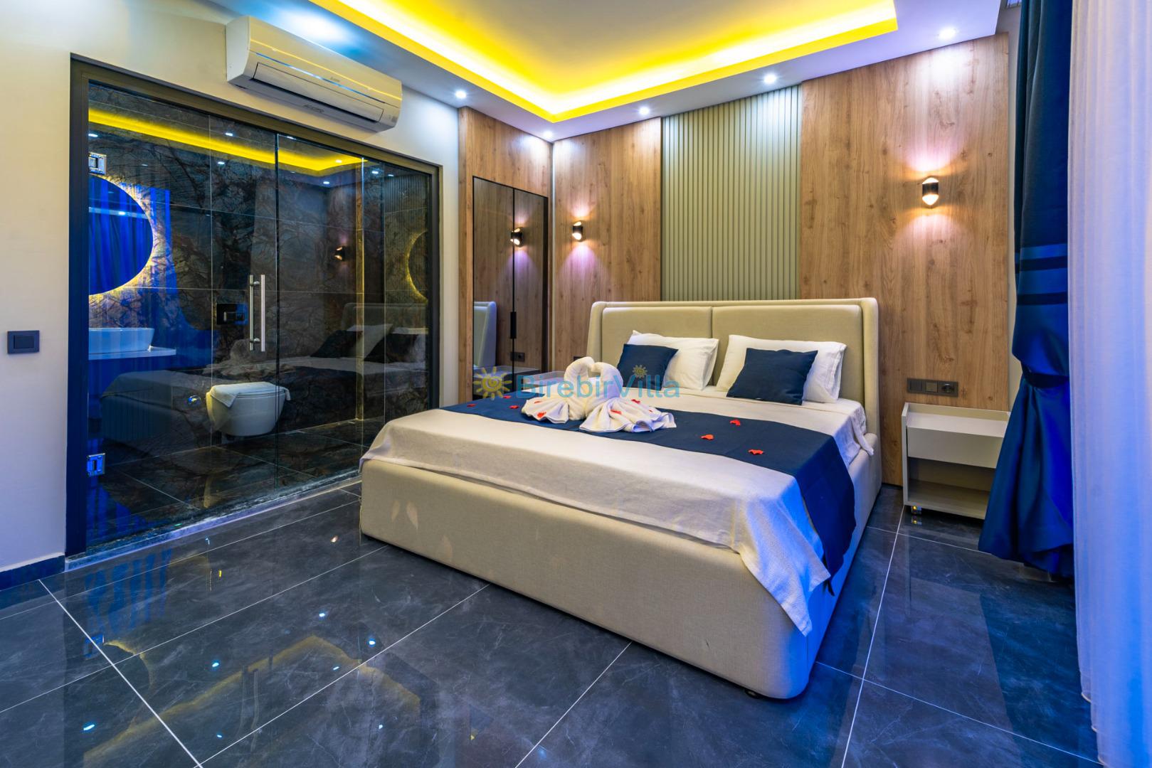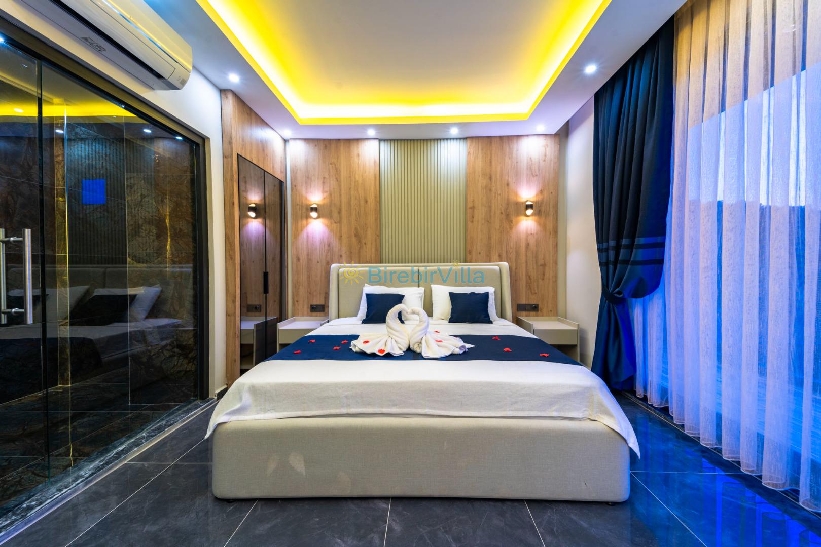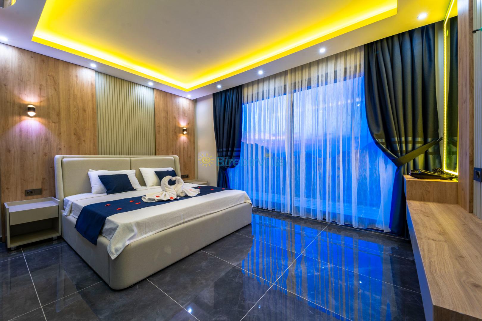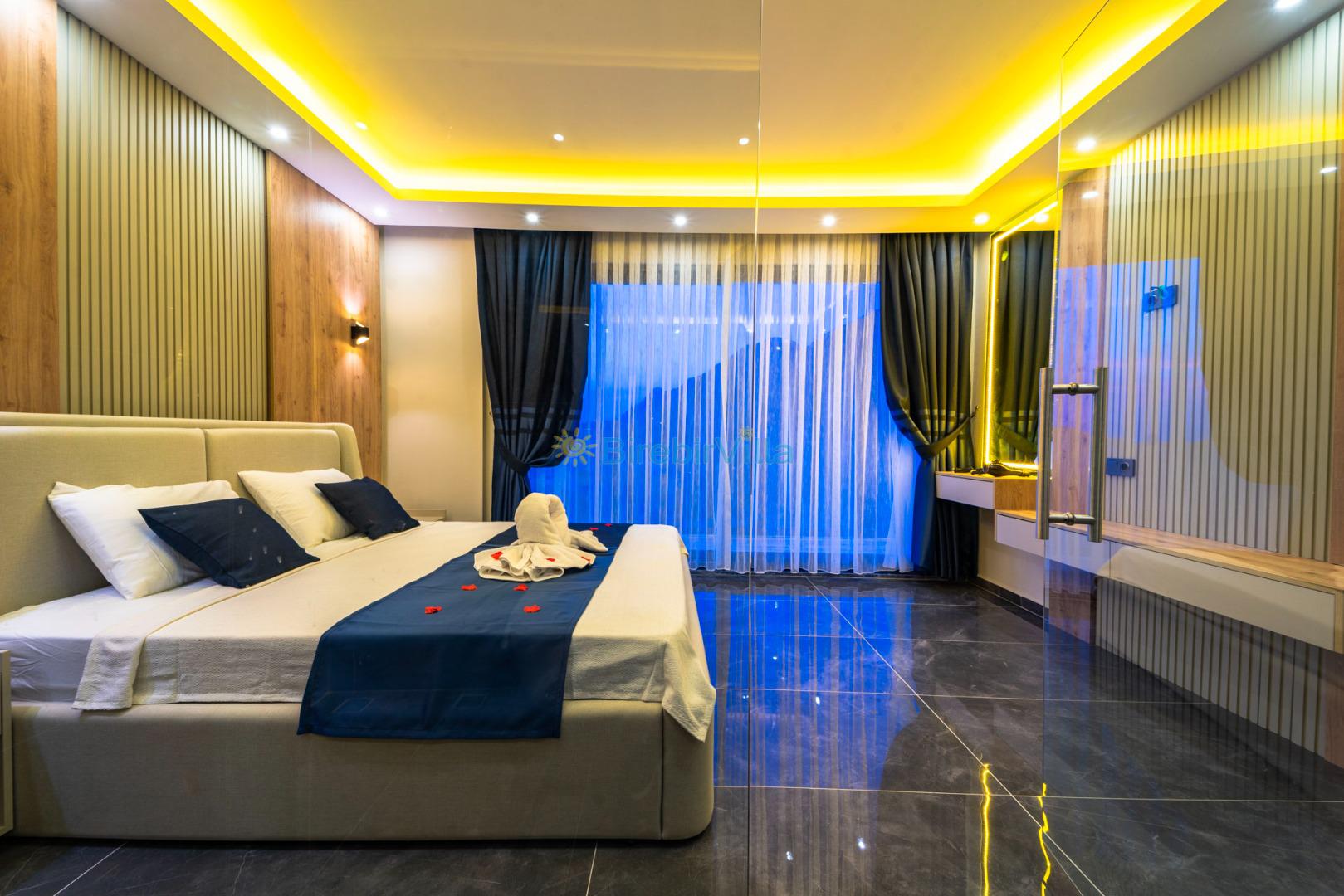 1.Yatak odası: Çift kişilik yatak, klima, makyaj masası, komodin, ebeveyn banyosu, elbise dolabı ve deniz manzaralı balkon bulunmaktadır.