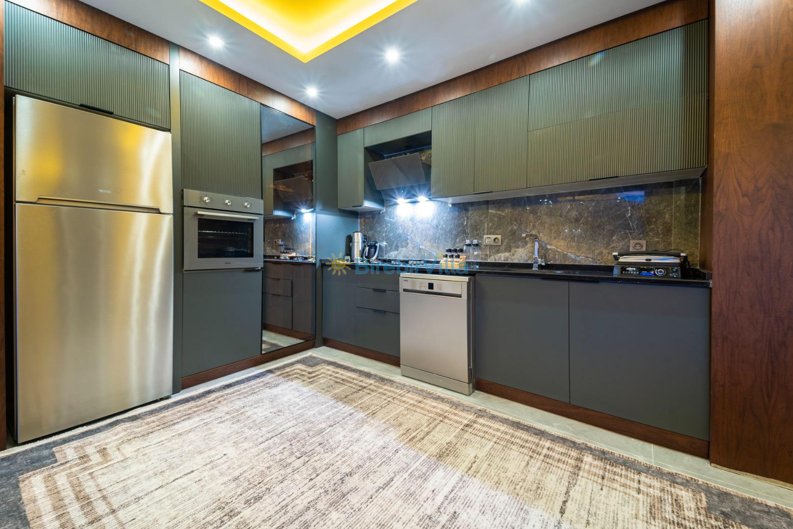 Mutfak: 6 kişi ve fazla kişiye yetecek kadar mutfak malzemesi, çamaşır makinesi, bulaşık makinesi,tost makinesi, türk kahvesi makinesi, fırın, ocak, buzdolabı, çaydanlık ve kettle bulunmaktadır.