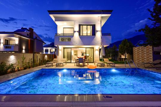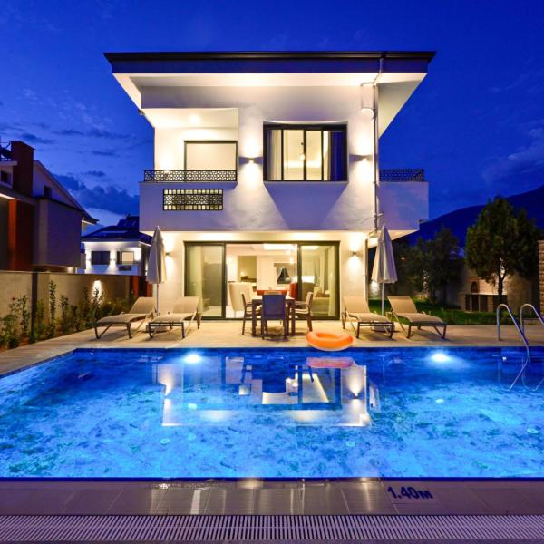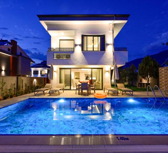 Villa Dorika C, Fethiye'nin Hisarönü bölgesinde bulunan 3 yatak odalı, 6 kişilik kapasiteli özel havuzlu ve saunalı lüks tatil villamızdır. Modern konsepte sahip olan villamız özenle seçilmiş malzemeler ile misafirlerimize konforlu bir tatil imkanı sunmaktadır. Geniş bahçe ve havuz alanına sahip olan villamız içerisinde eğlenceli zamanlar geçirebilirsiniz. Ayrıca villamızın konumu itibari ile Alışveriş mağazaları, eğlence mekanları ve lunaparkın bulunduğu Hisarönü'ne 1.50 km mesafede bulunmaktadır. Ölüdeniz plajına 5 km mesafededir. Villamızda misafirler için her türlü araç gereç hazır halde bulunmaktadır. Villamızın hemen yanında aynı yapıya sahip 8 villa daha bulunmaktadır. Yanyana villa kiralamak isteyenler için ideal bir seçenektir.