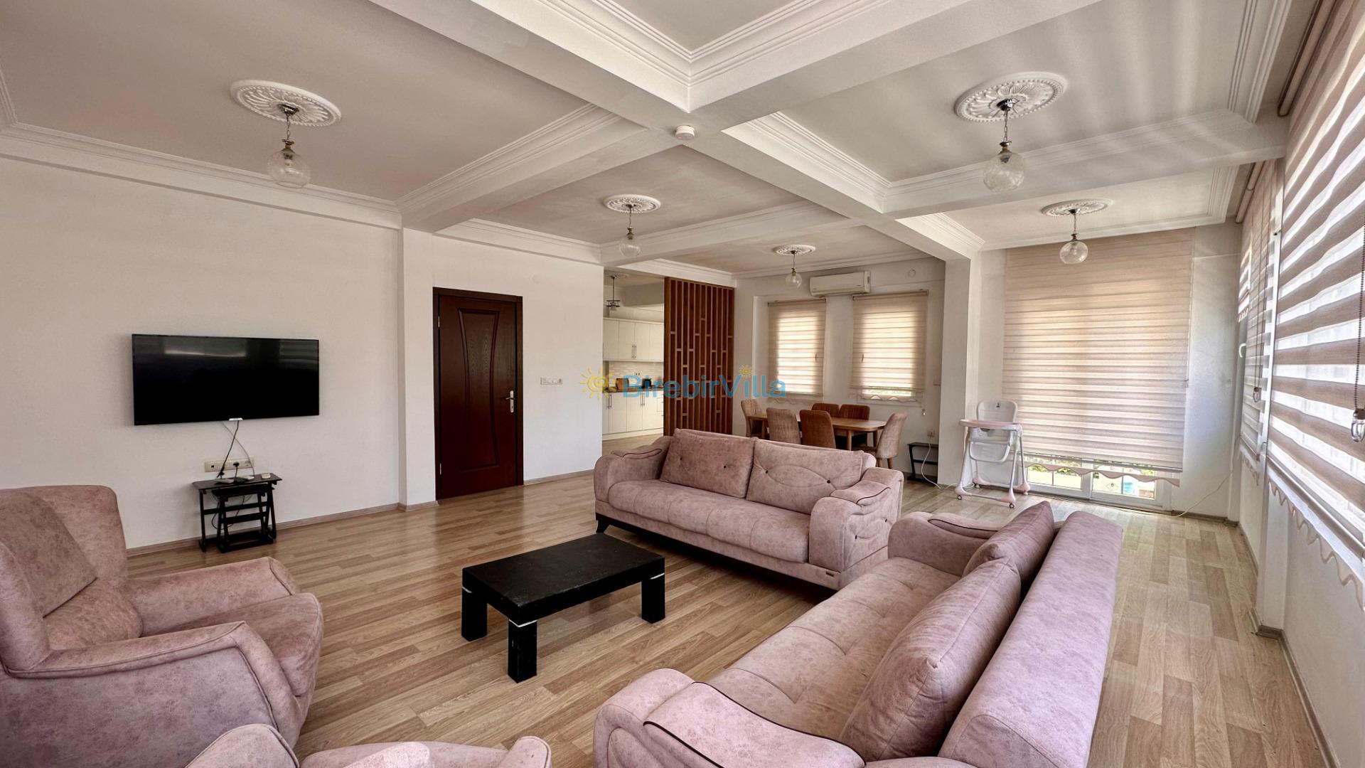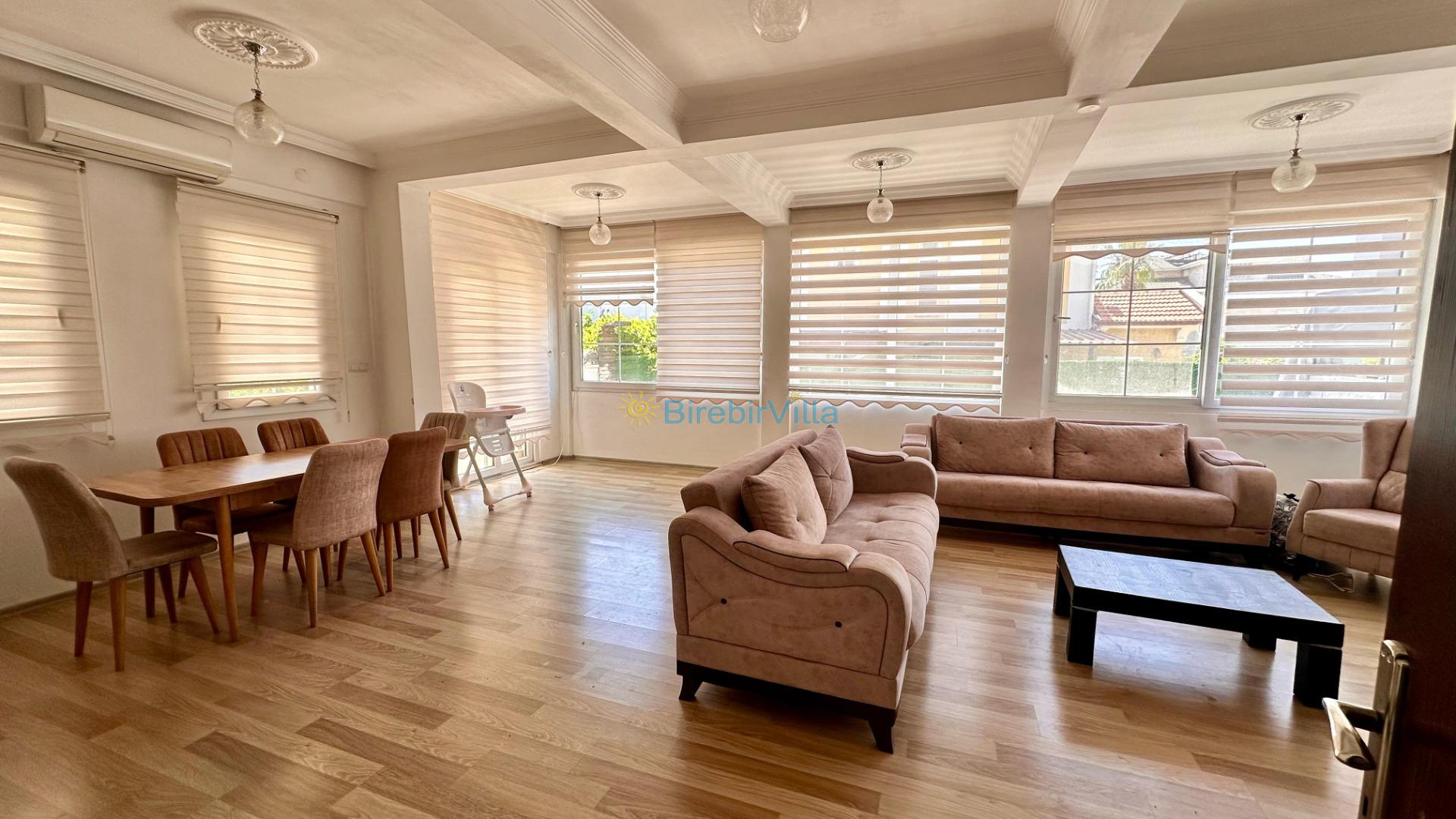Salon: Özenle döşenmiş açık mutfaklı salon, modern koltuklar, 6 kişilik yemek masası, mama sandalyesi, soba, Led tv, uydu alıcısı ve klima bulunmaktadır. Havuza çıkış kapısı mevcuttur.