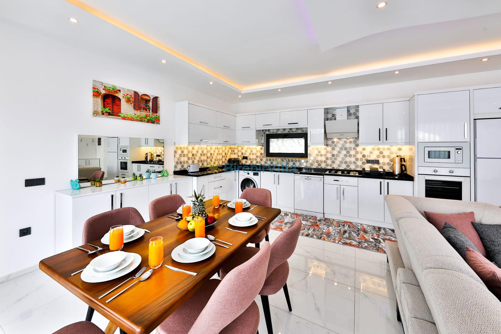 Mutfak: Açık planlı mutfak, buzdolabı, bulaşık makinası, çamaşır makinası, tost makinesi, fırın, ocak, davlumbaz, mikrodalga fırın, çaydanlık, kettle, 4 kişi ve daha fazla kişiye yetecek kadar mutfak malzemeleri bulunmaktadır.