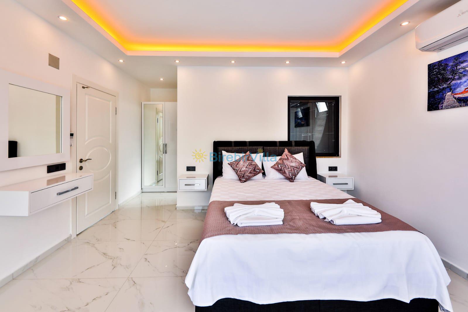 3.Yatak odası: Çift kişilik yatak, klima, komodin, makyaj masası, elbise dolabı ve ebeveyn banyo bulunmaktadır.