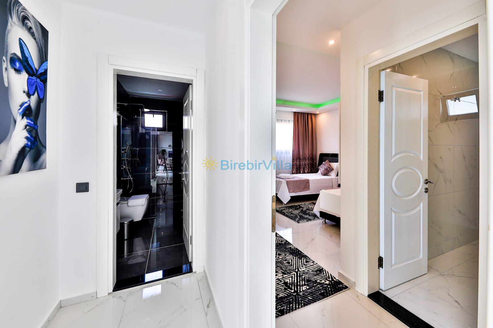 1.Yatak odası: Çift kişilik yatak, klima, komodin, makyaj masası, elbise dolabı, jakuzi ve ebeveyn banyo bulunmaktadır.