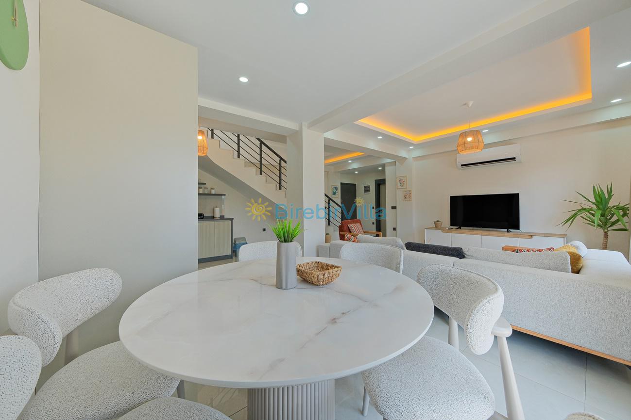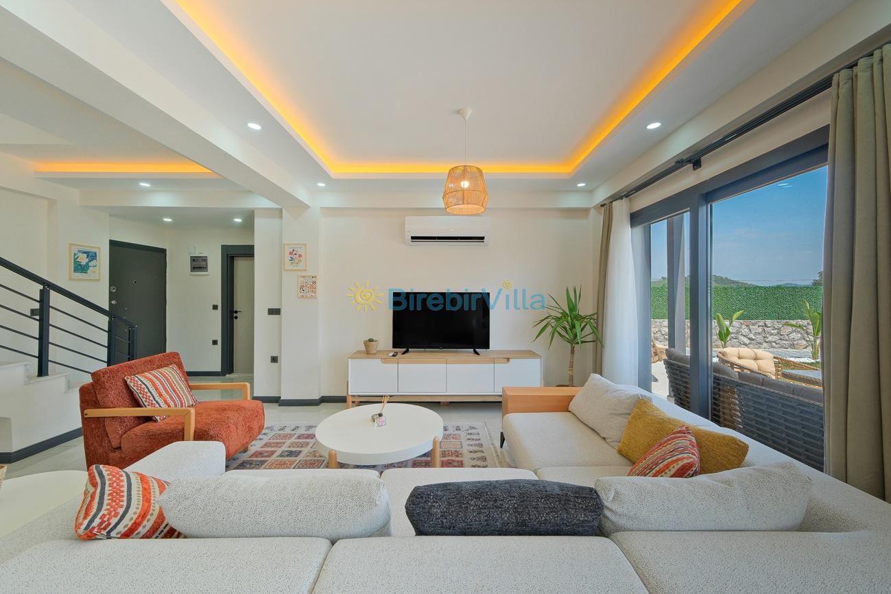 Salon: Özenle döşenmiş açık mutfaklı salon, klima, modern koltuklar, 6 kişilik yemek masası, Led tv, uydu alıcısı ve havuza açılan kapısı bulunmaktadır.