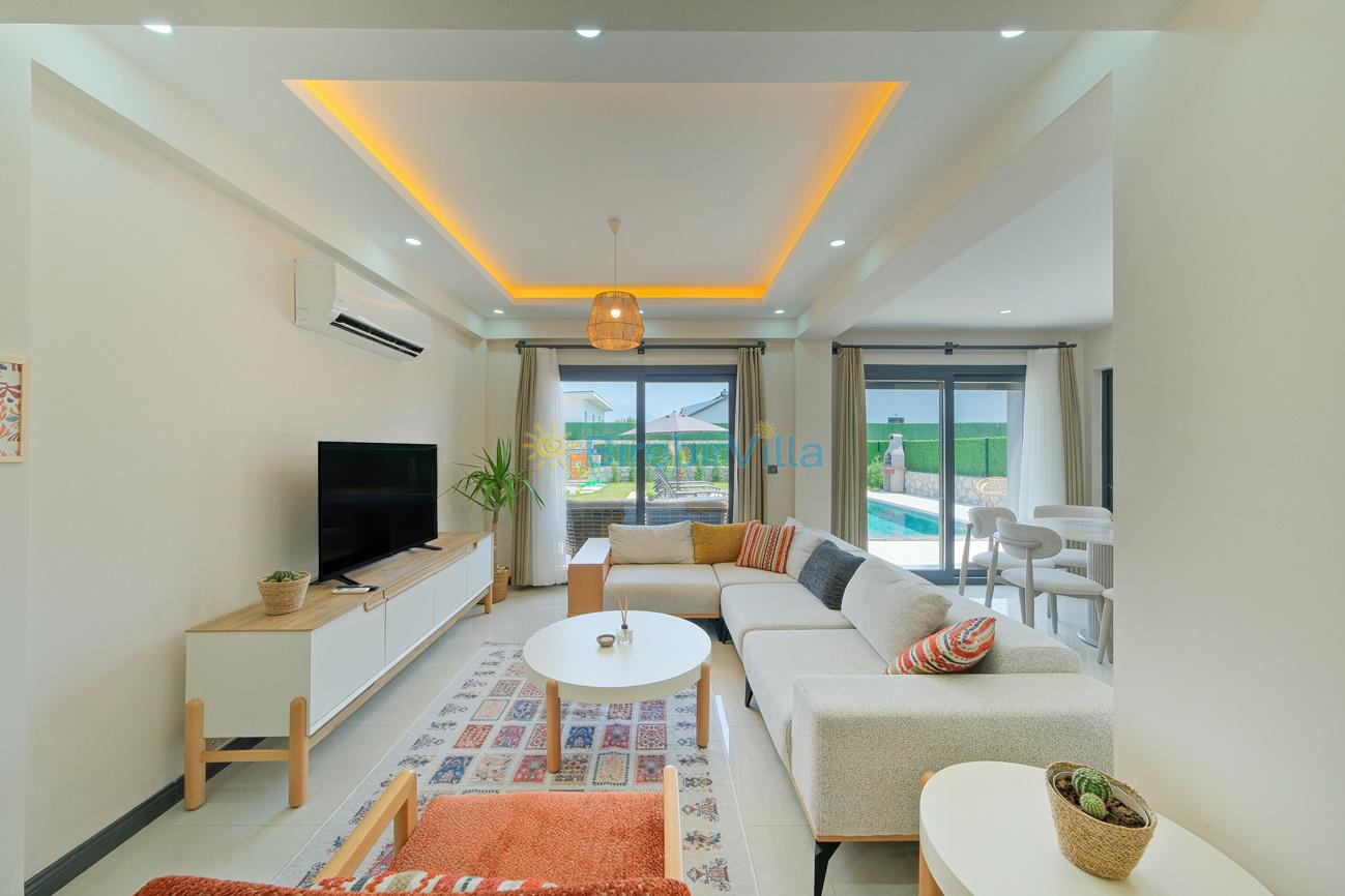 Salon: Özenle döşenmiş açık mutfaklı salon, klima, modern koltuklar, 6 kişilik yemek masası, Led tv, uydu alıcısı ve havuza açılan kapısı bulunmaktadır.