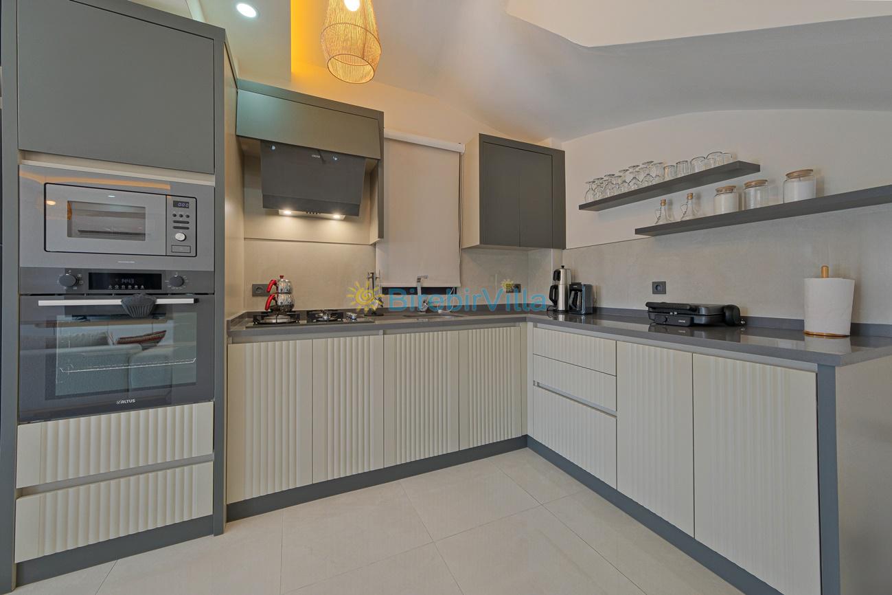 Mutfak: Açık planlı mutfak, 6 kişi ve daha fazla kişiye yetecek kadar mutfak malzemeleri, bulaşık makinesi, çamaşır makinesi, fırın, ocak, buzdolabı, çaycı, kahve makinesi , tost makinesi , mikrodalga fırın , çaydanlık ve kettle bulunmaktadır.