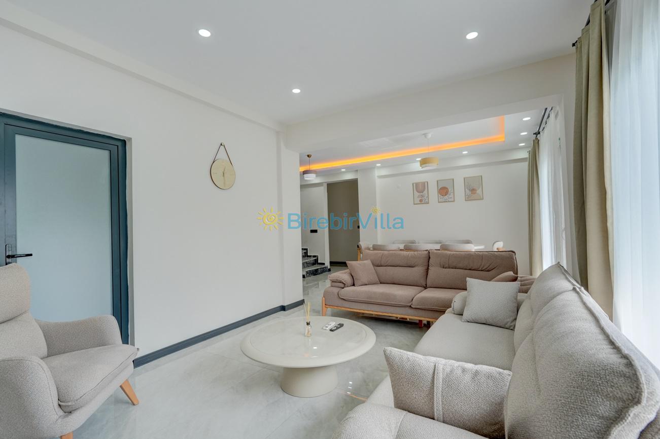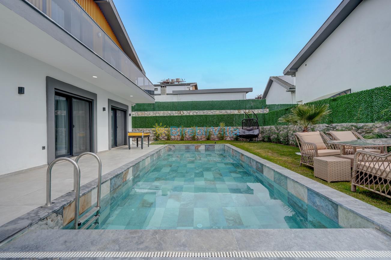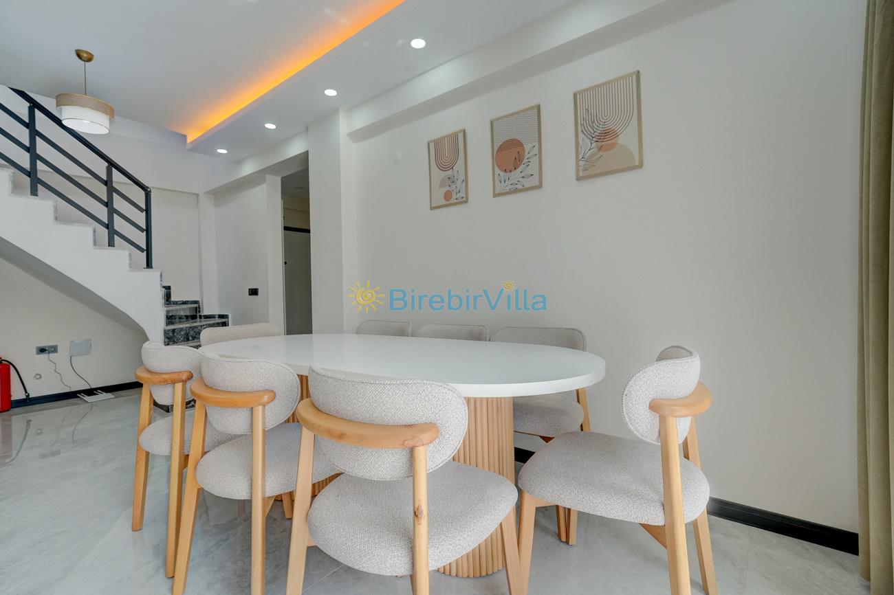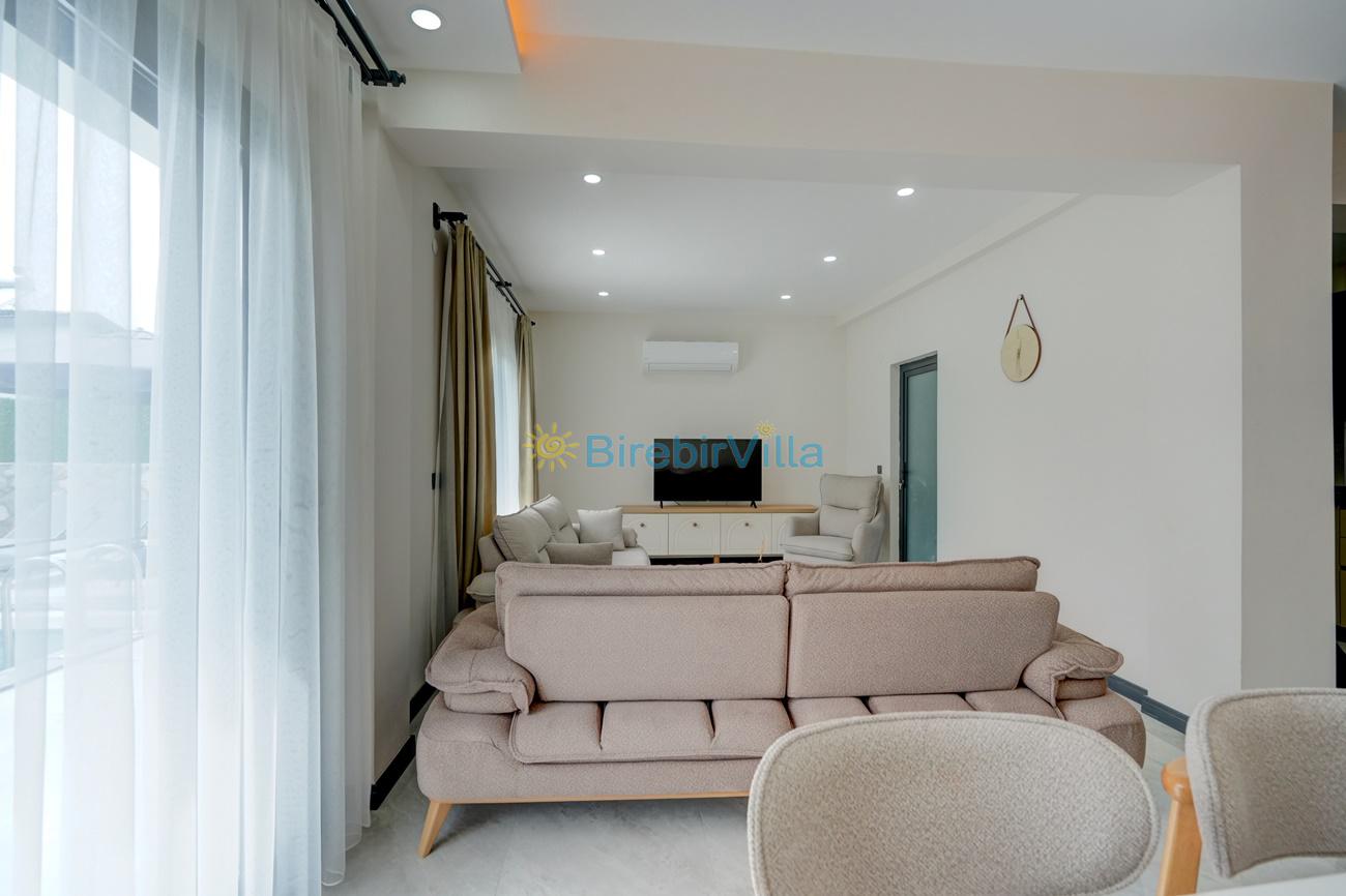 Salon: Özenle döşenmiş açık mutfaklı salon, klima, modern koltuklar, 6 kişilik yemek masası, Led tv, uydu alıcısı ve havuza açılan kapısı bulunmaktadır.