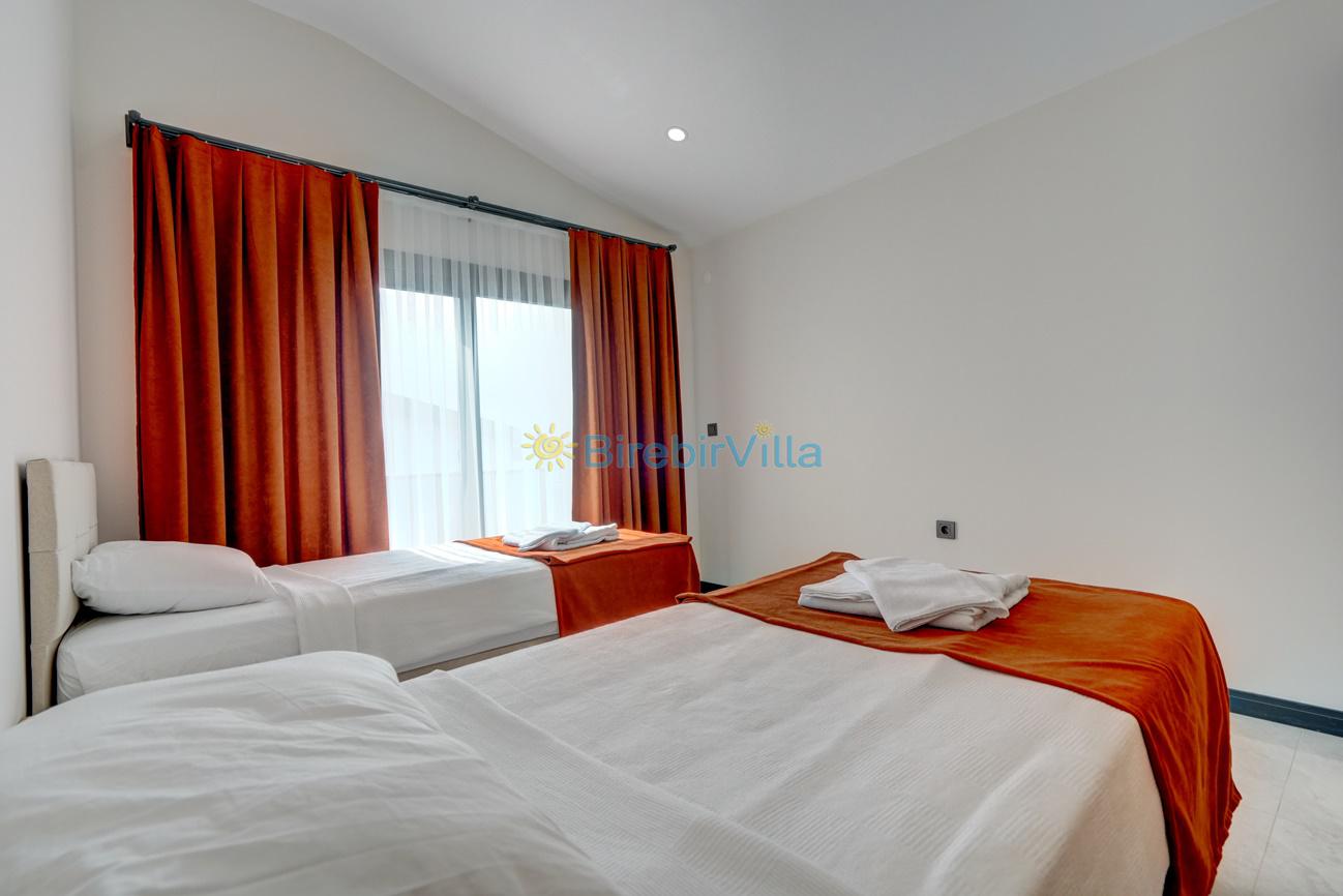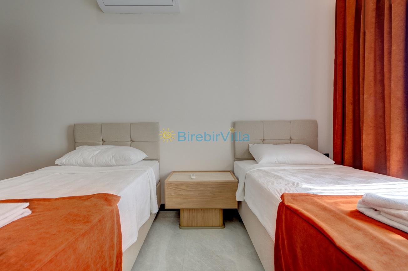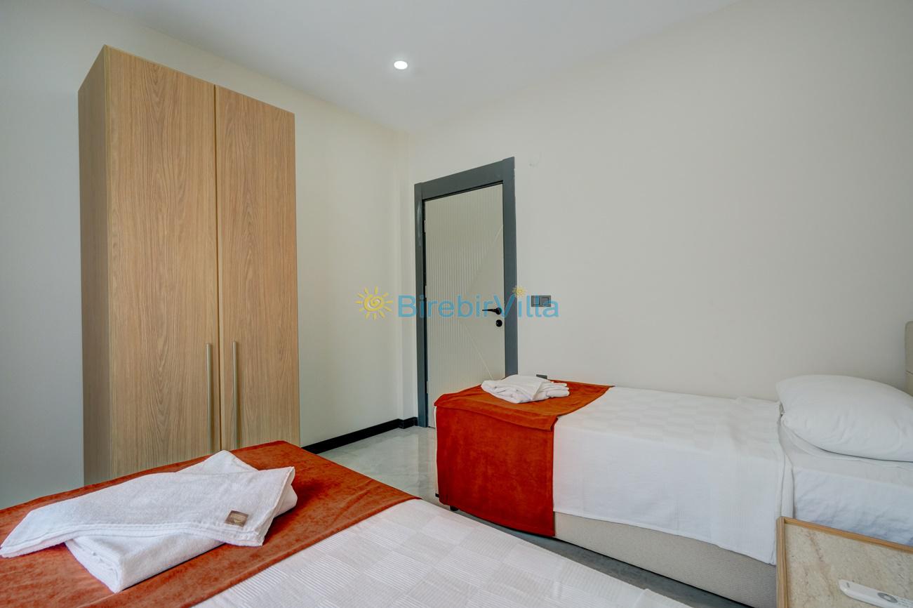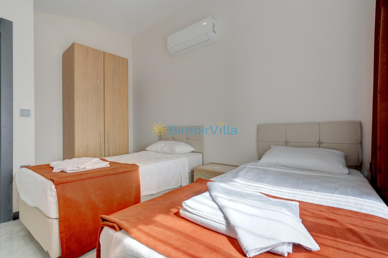 3.Yatak odası: Tek kişilik iki tane yatak, klima, komodin, elbise dolabı ve havuza açılan balkon kapısı bulunmaktadır.