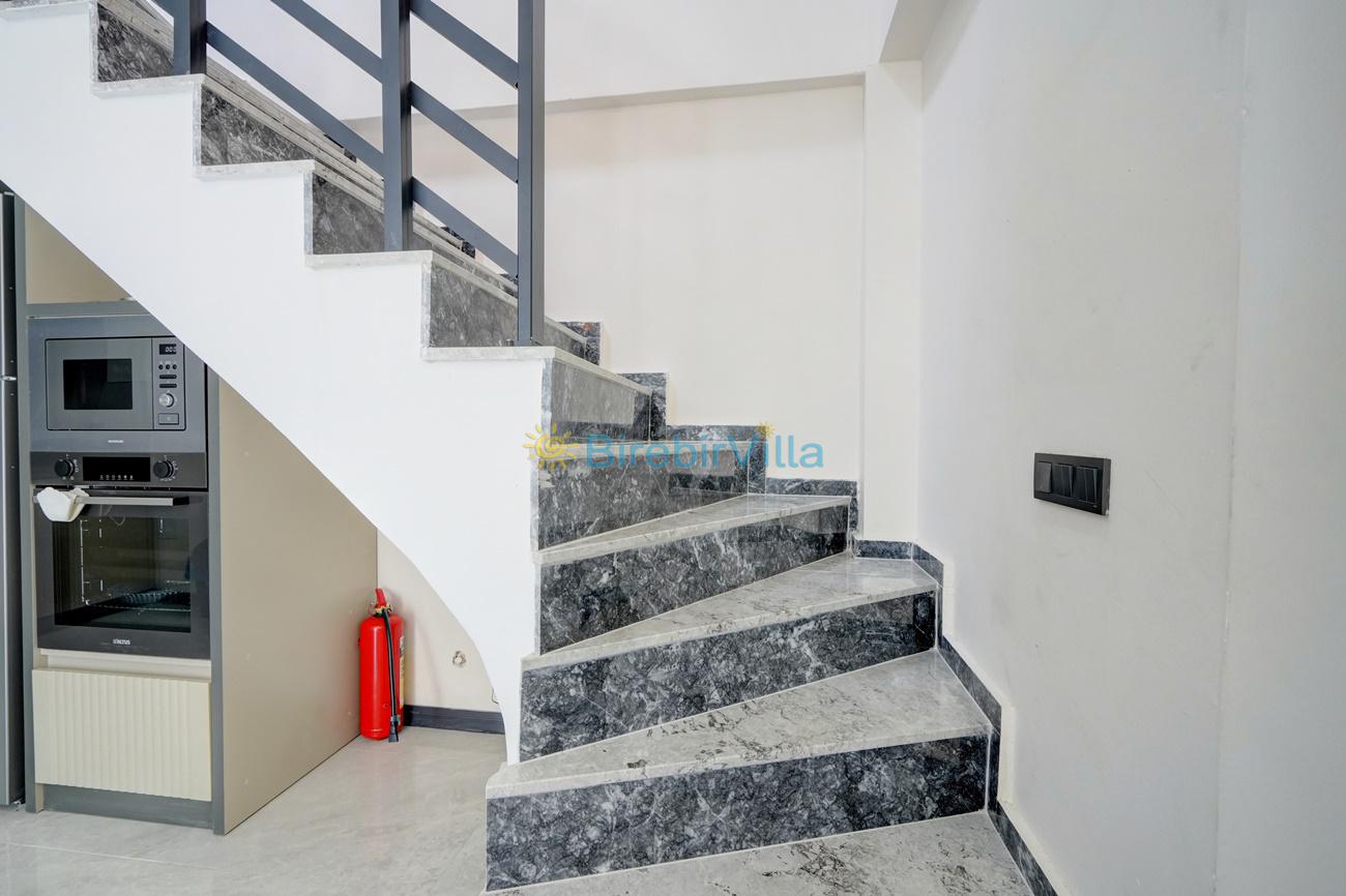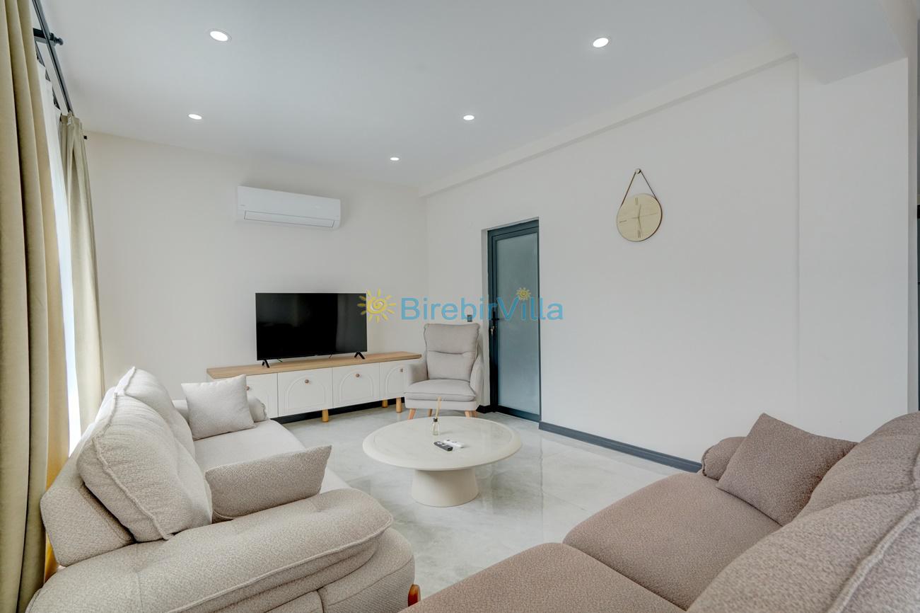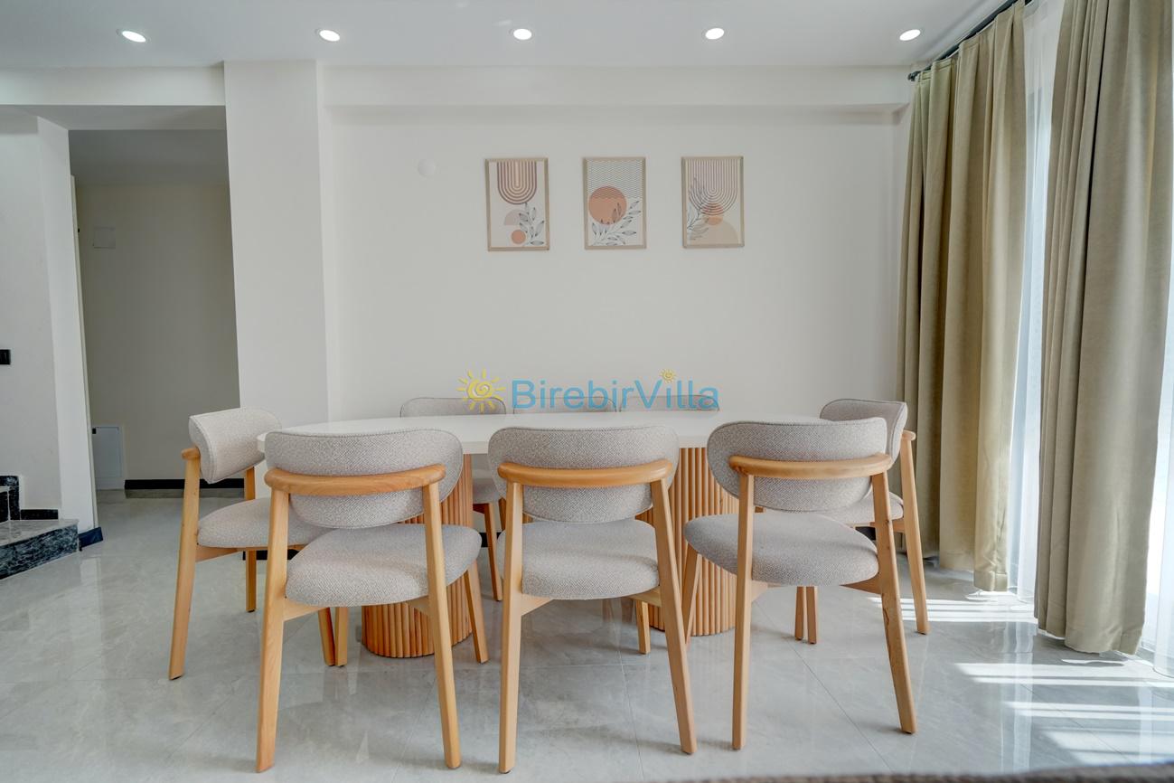 Salon: Özenle döşenmiş açık mutfaklı salon, klima, modern koltuklar, 6 kişilik yemek masası, Led tv, uydu alıcısı ve havuza açılan kapısı bulunmaktadır.