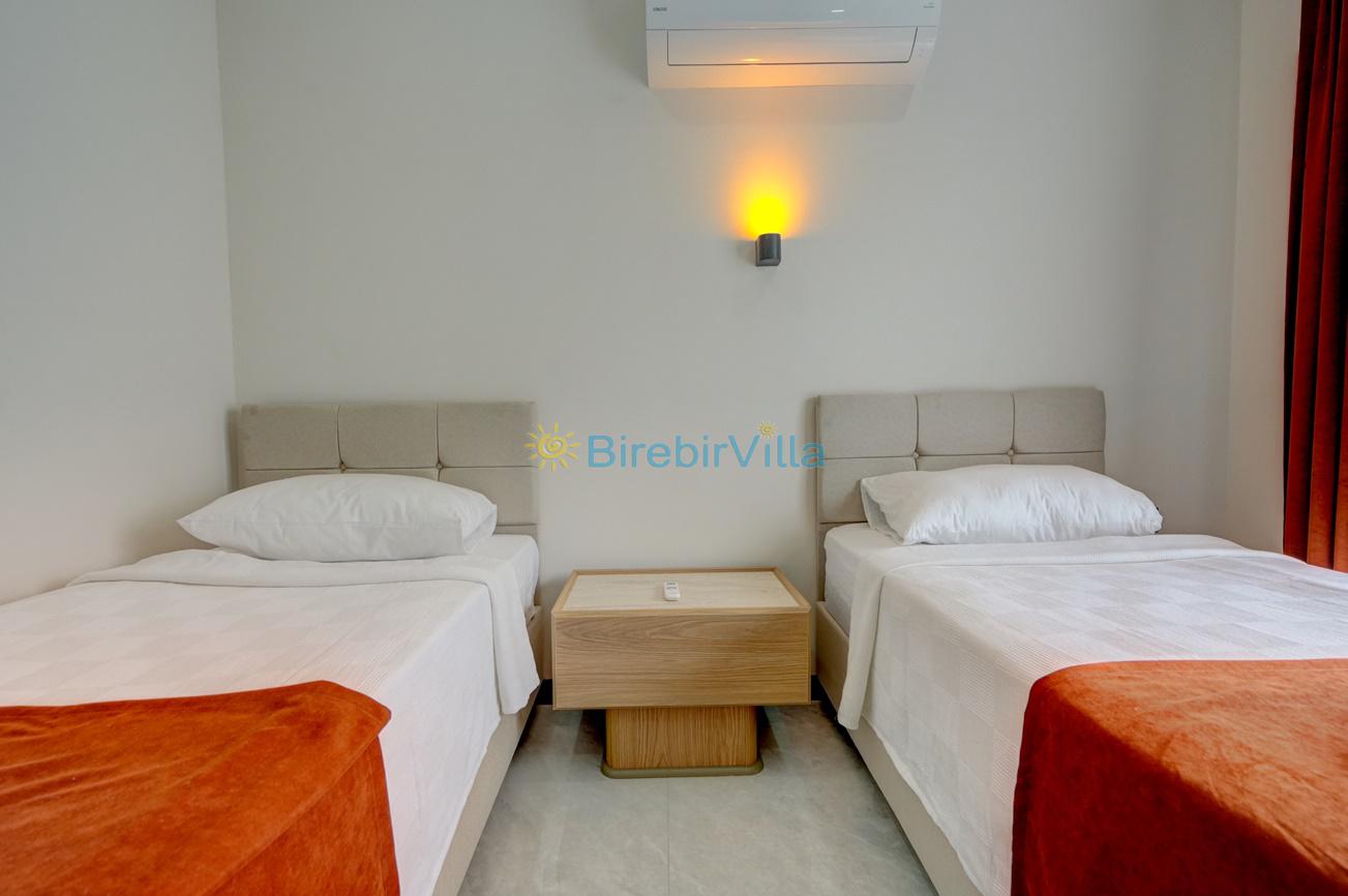 3.Yatak odası: Tek kişilik iki tane yatak, klima, komodin, elbise dolabı ve havuza açılan balkon kapısı bulunmaktadır.