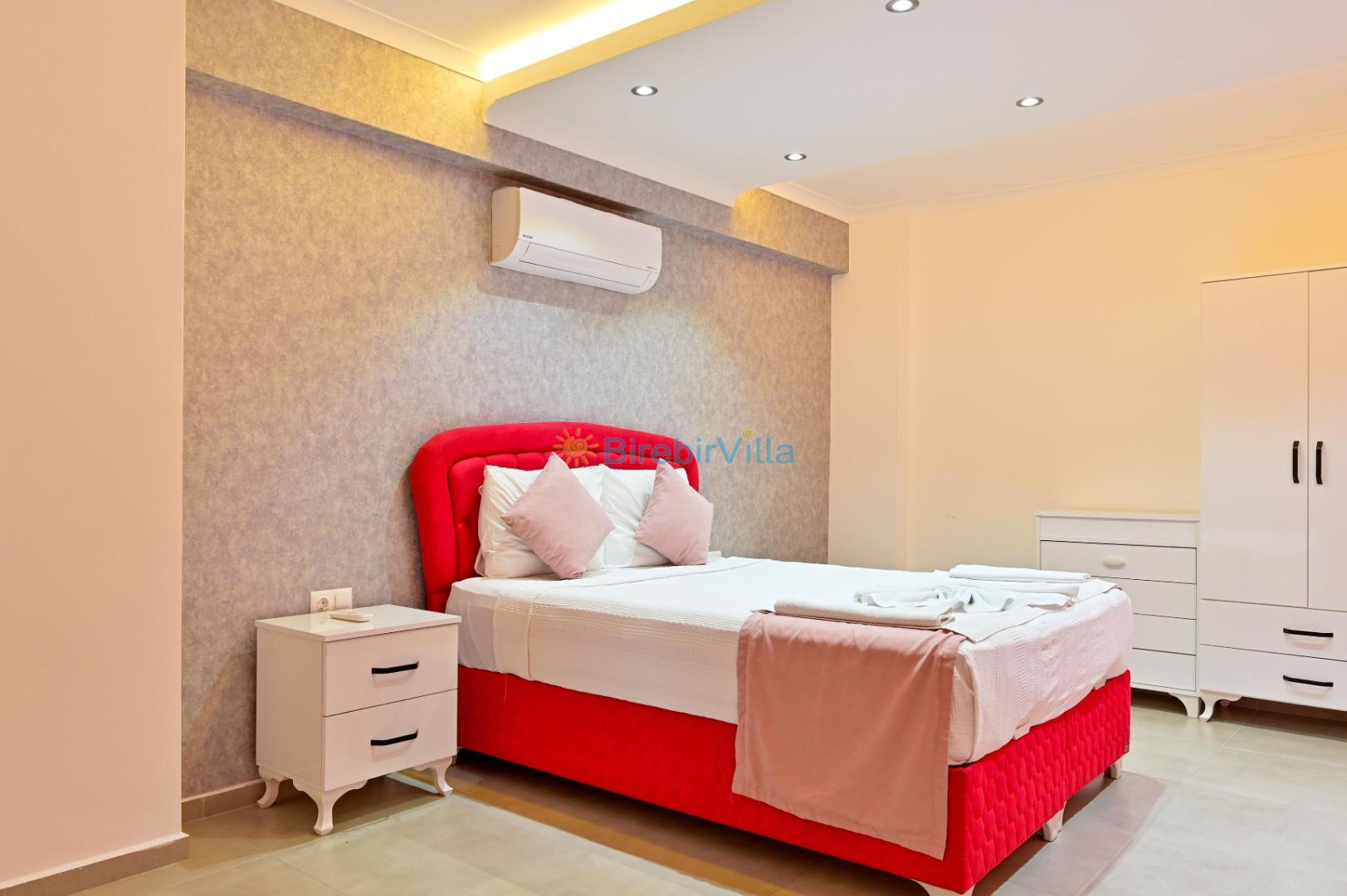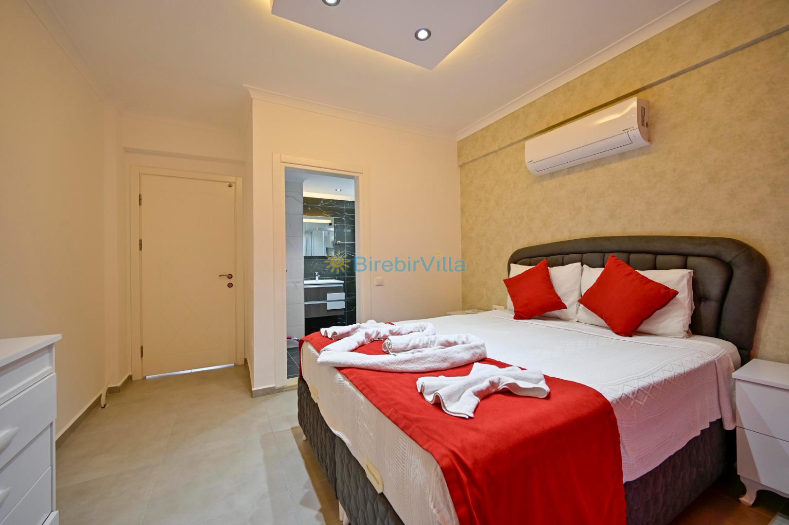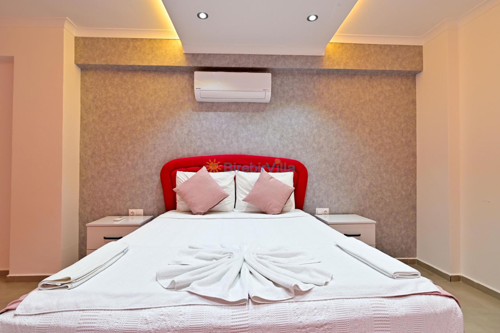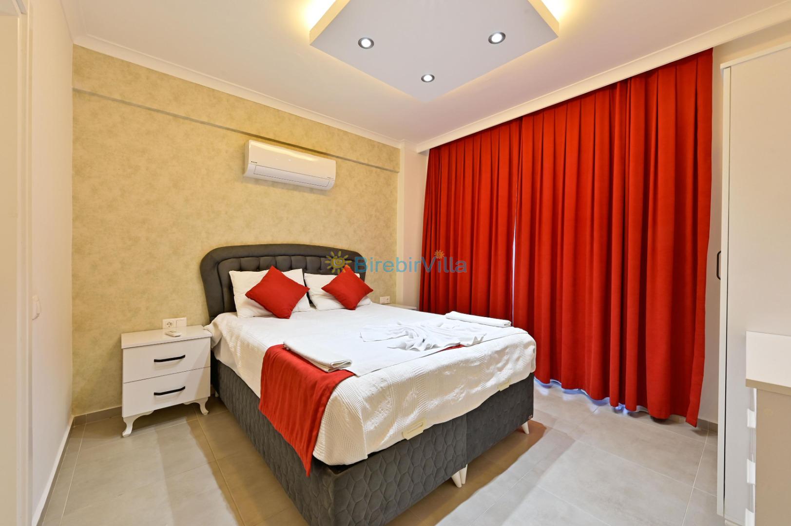 1. Yatak odası: Çift kişilik yatak, ebeveyn banyo, klima, elbise dolabı bulunmaktadır.