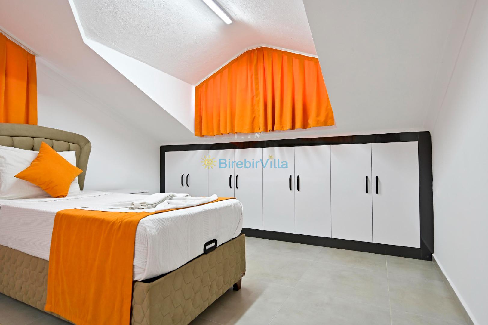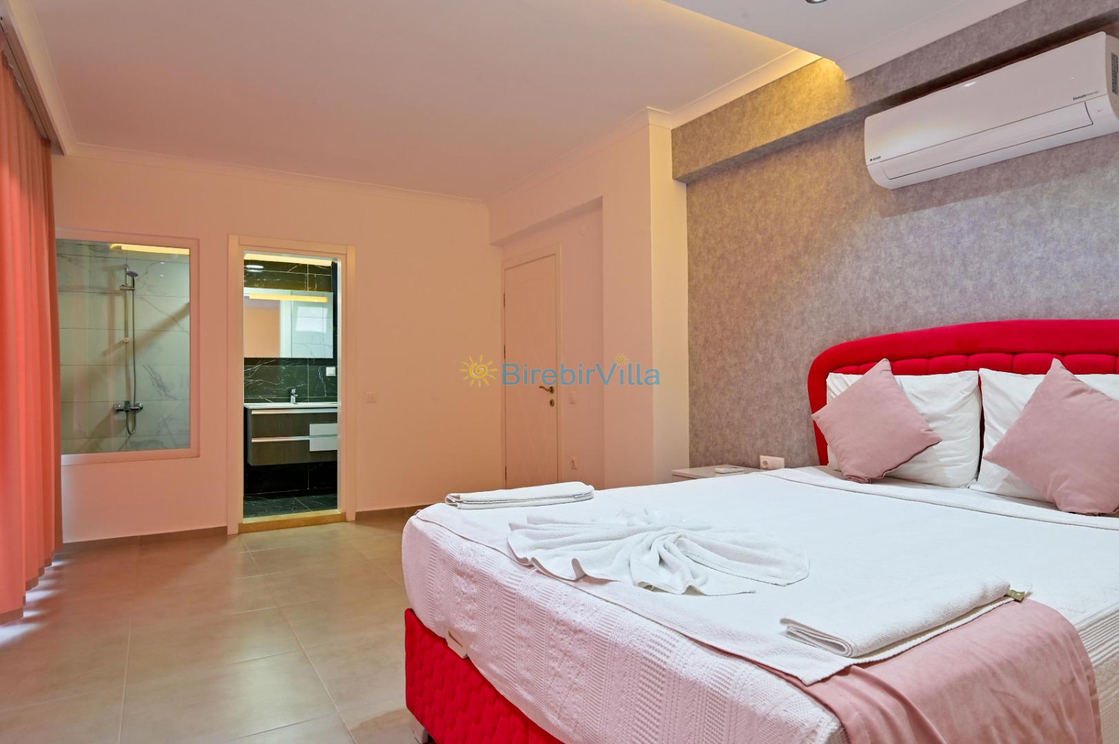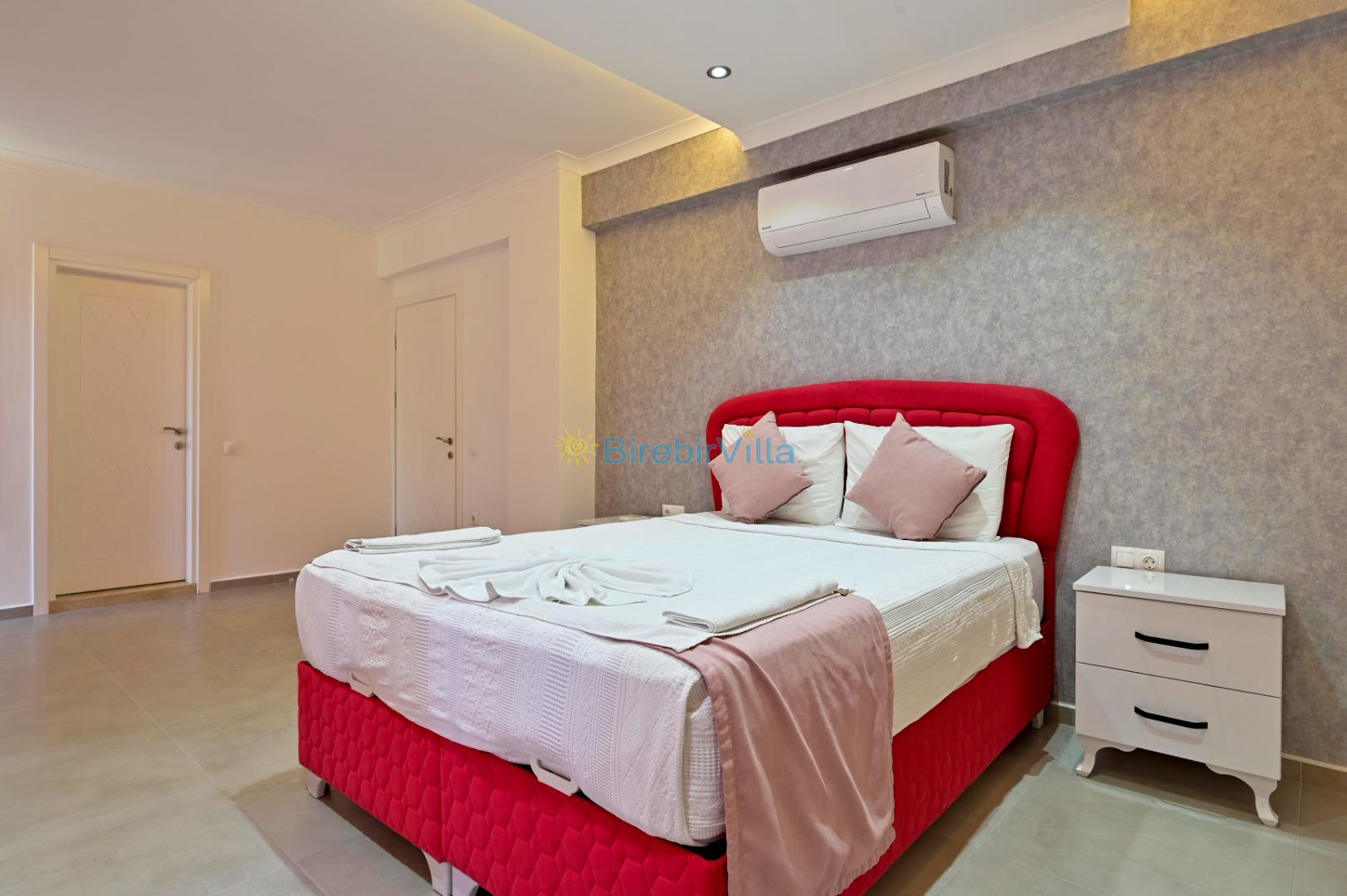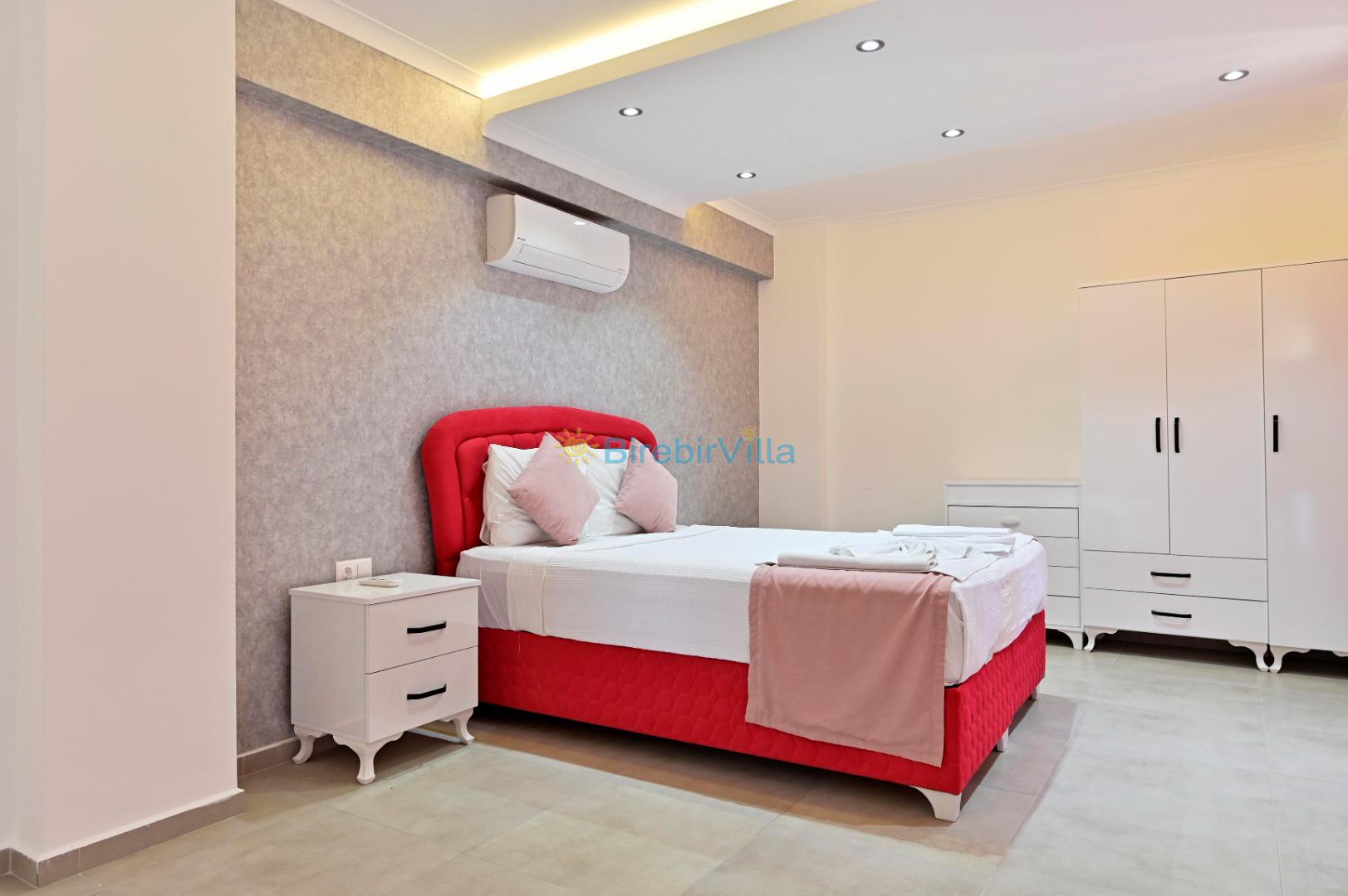 1. Yatak odası: Çift kişilik yatak, ebeveyn banyo, klima, elbise dolabı bulunmaktadır.