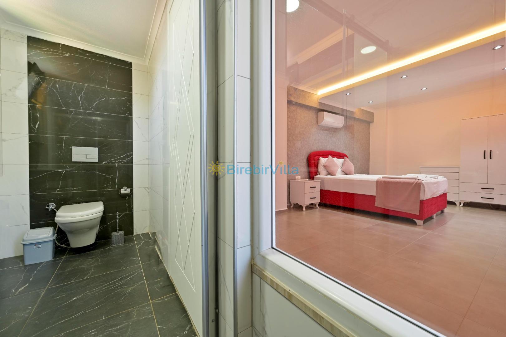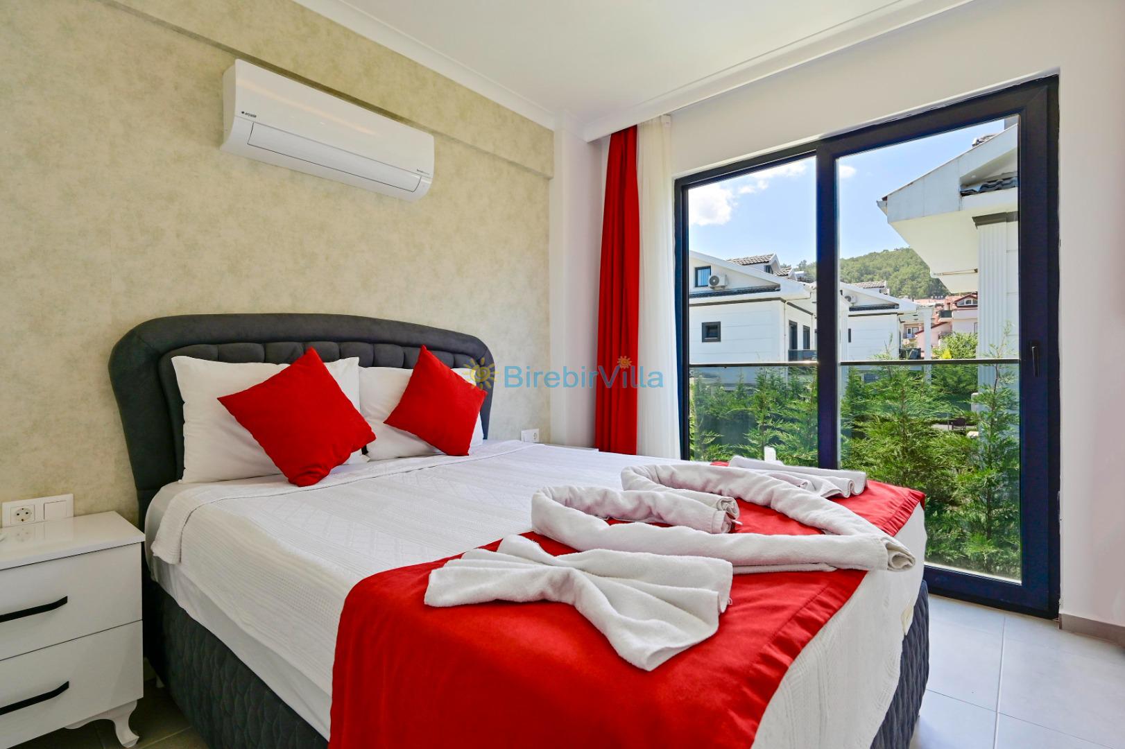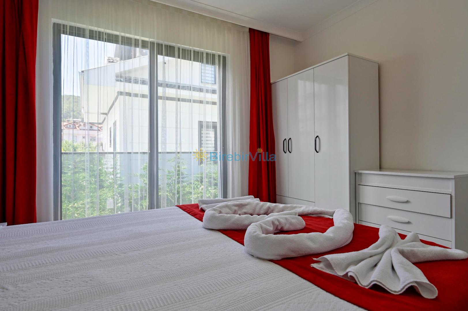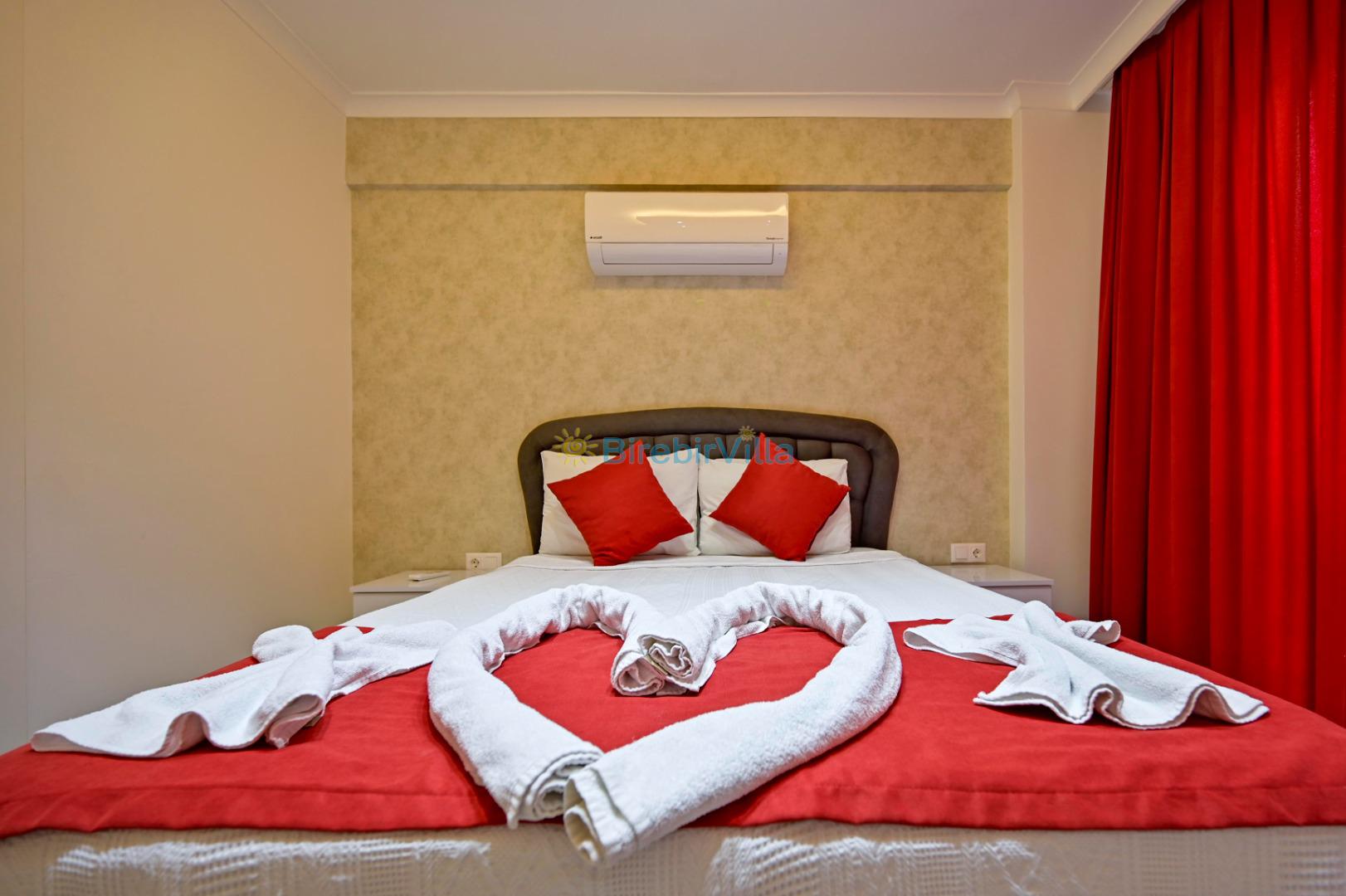 1. Yatak odası: Çift kişilik yatak, ebeveyn banyo, klima, elbise dolabı bulunmaktadır.