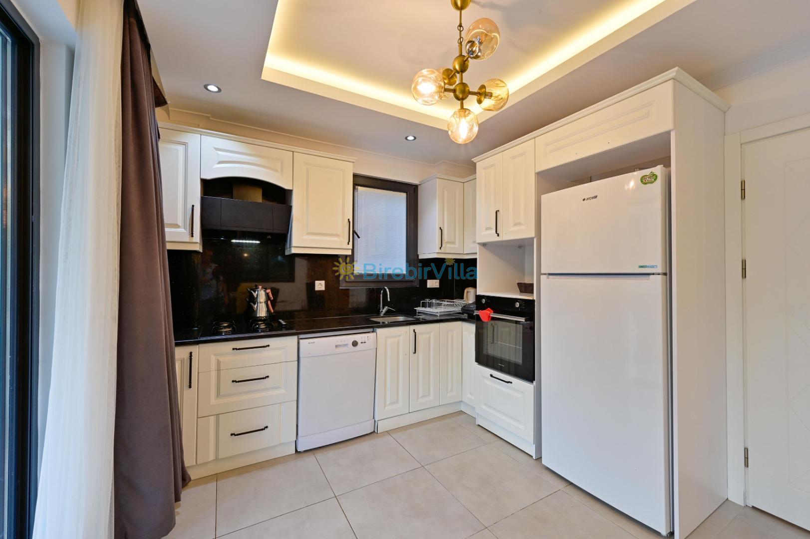 Mutfak: Açık planlı modern mutfak, 8 kişi ve daha fazla kişiye yetecek kadar mutfak malzemeleri, bulaşık makinesi, çamaşır makinesi, kahve makinesi, mikrodalga fırın, fırın, ocak, buzdolabı, çaydanlık ve ketle bulunmaktadır.