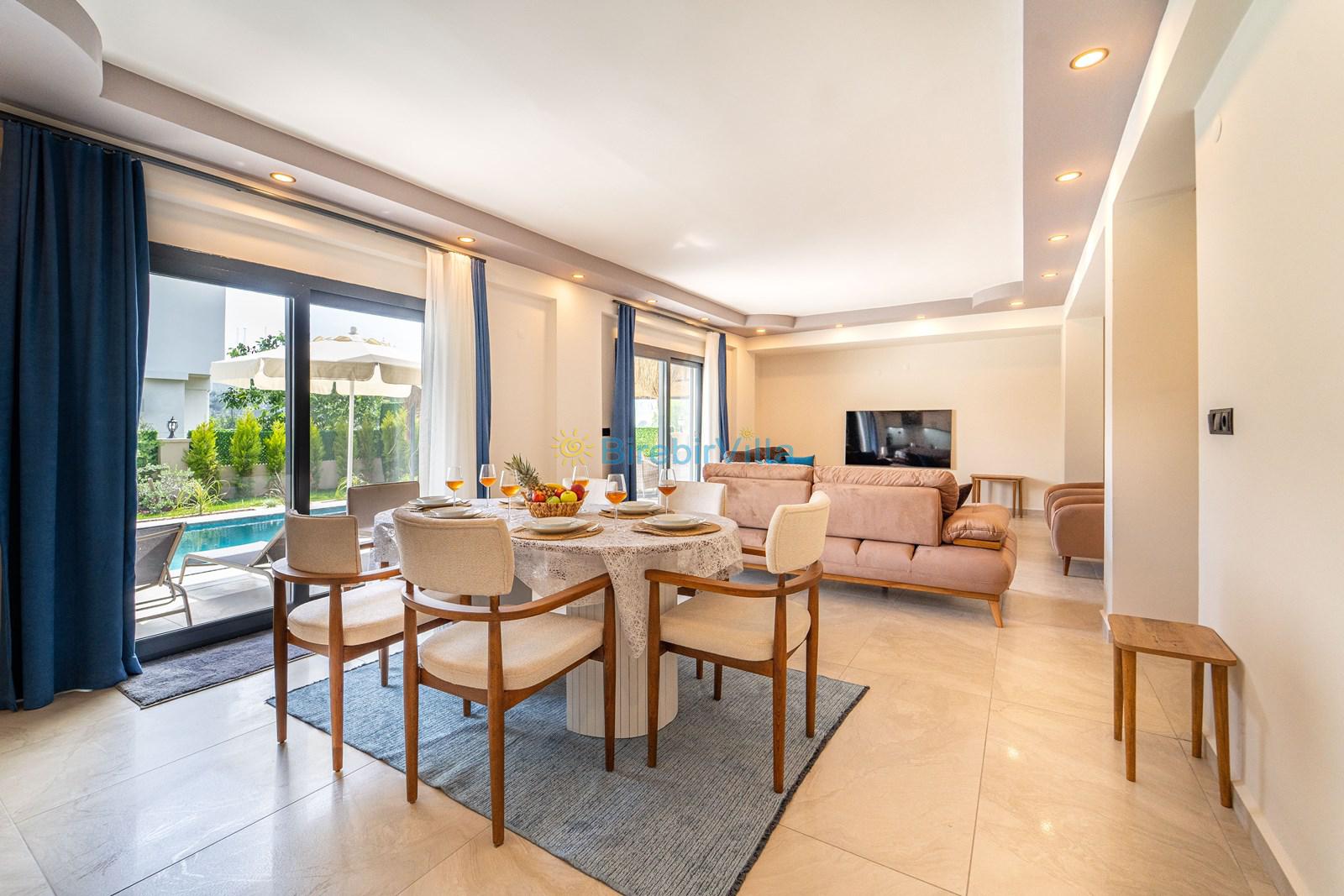 Salon: Özenle döşenmiş açık mutfaklı salon, modern koltuklar, 6 kişilik yemek masası, Lcd tv, uydu alıcısı ve klima bulunmaktadır. Salondan havuz ve bahçeye açılan kapısı mevcuttur.