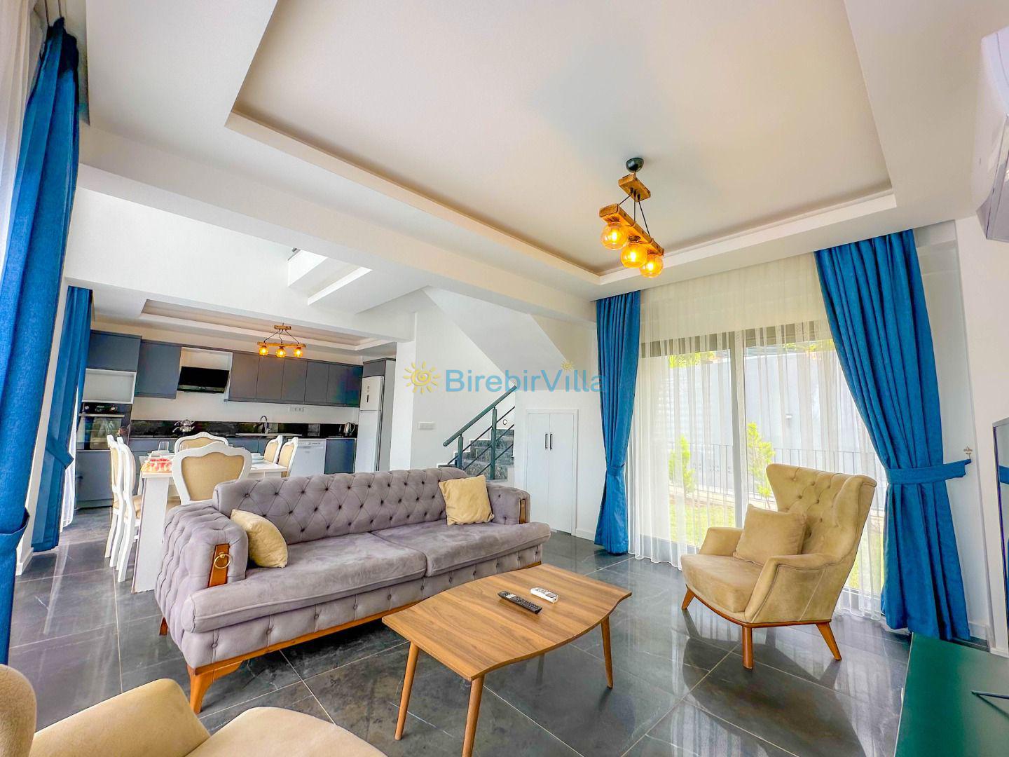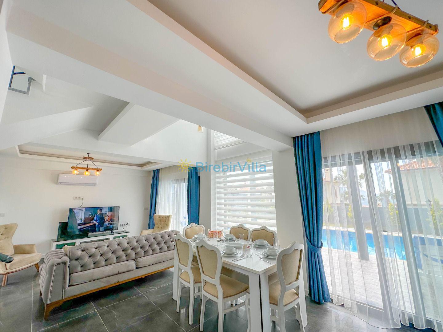 Salon: Oturma grubu, uydu alıcı, Lcd tv, internet, klima, yemek masası, sandalyeler ve havuza çıkış bulunmaktadır.