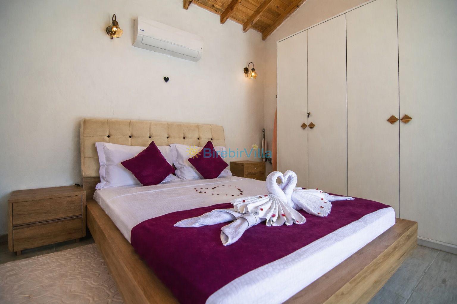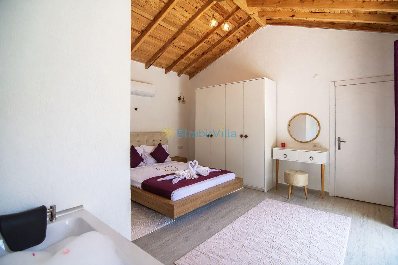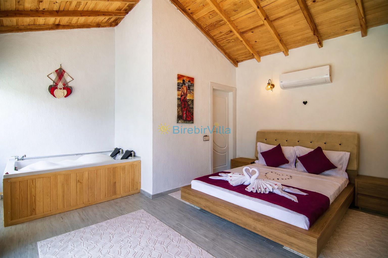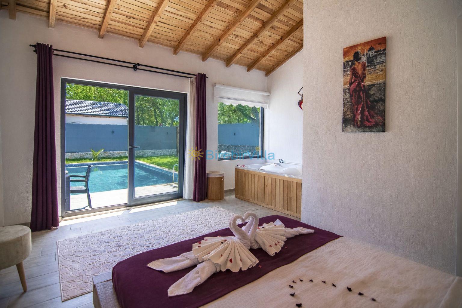 1.Yatak odası: Çift kişilik yatak, klima, jakuzi, ebeveyn banyo, elbise dolabı ve havuza açılan kapısı bulunmaktadır.