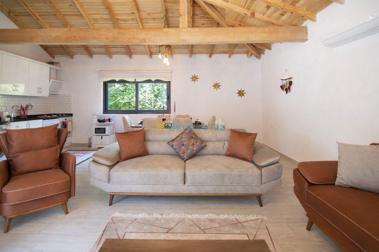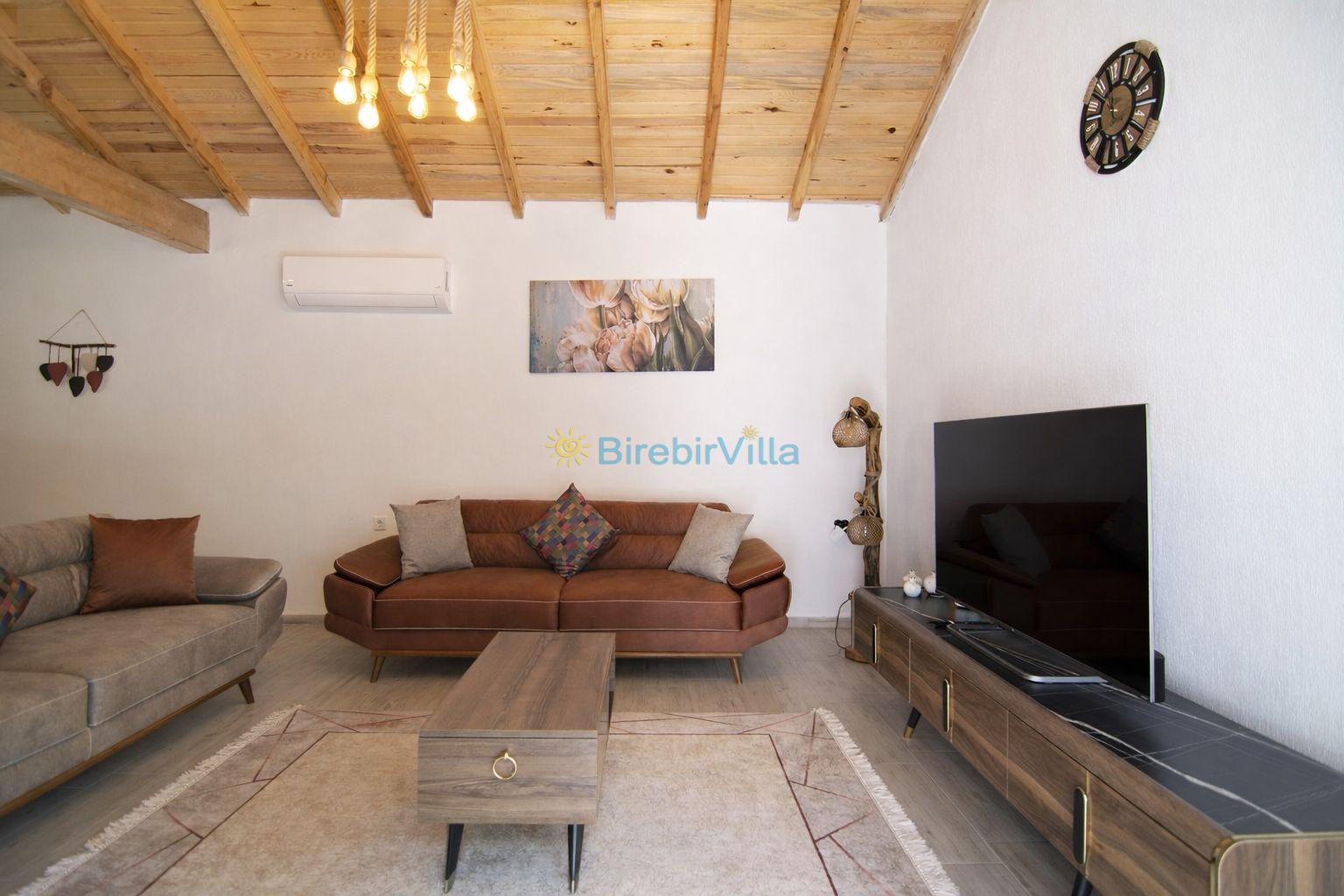 Salon: Özenle döşenmiş açık mutfaklı salon, modern koltuklar, 6 kişilik yemek masası, Lcd tv, uydu alıcısı ve klima bulunmaktadır. Salondan havuz ve bahçeye açılan kapısı mevcuttur.