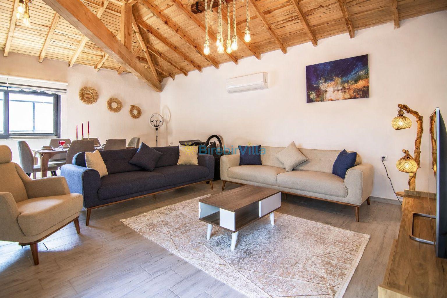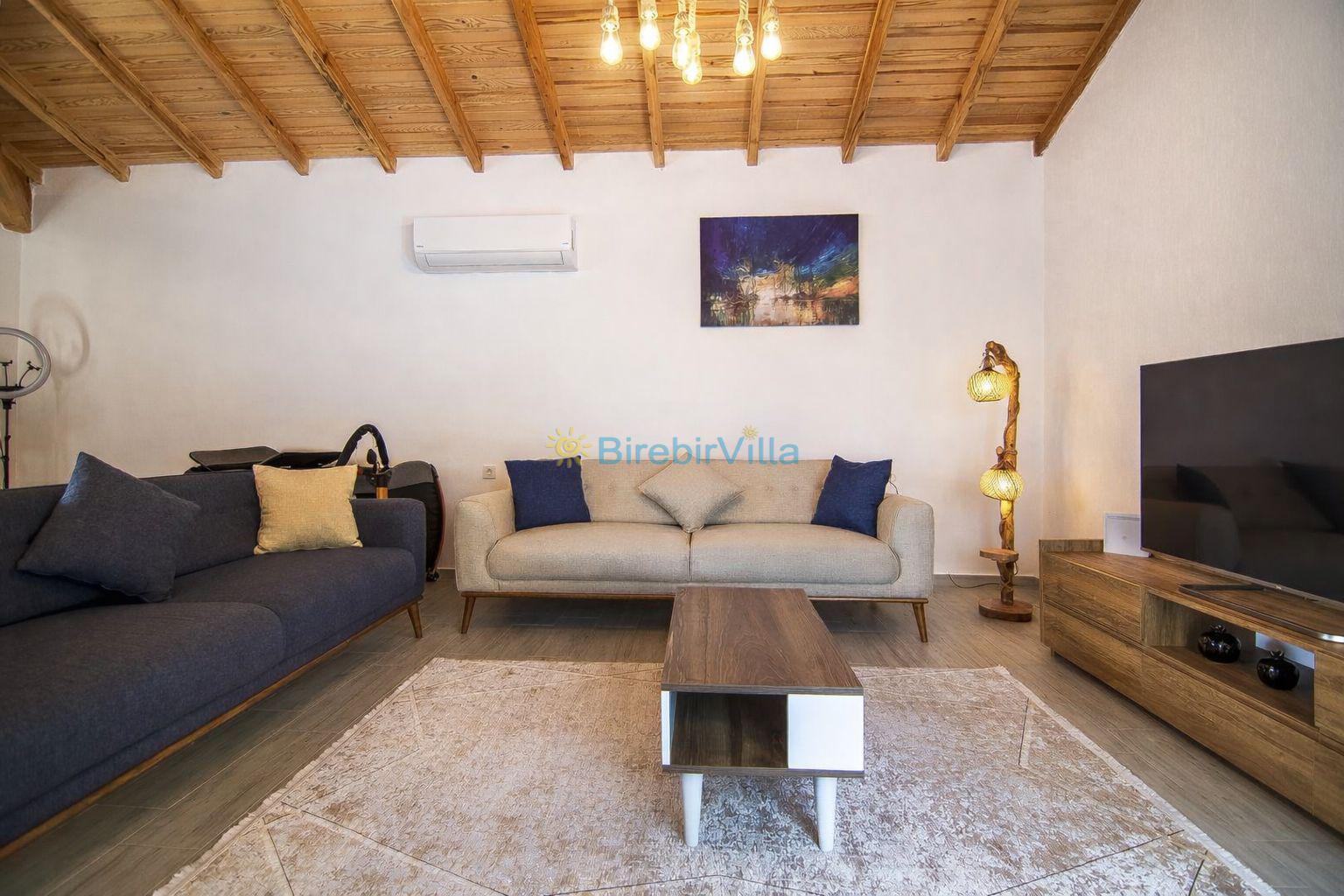 Salon: Özenle döşenmiş açık mutfaklı salon, modern koltuklar, 6 kişilik yemek masası, Lcd tv, uydu alıcısı ve klima bulunmaktadır. Salondan havuz ve bahçeye açılan kapısı mevcuttur.