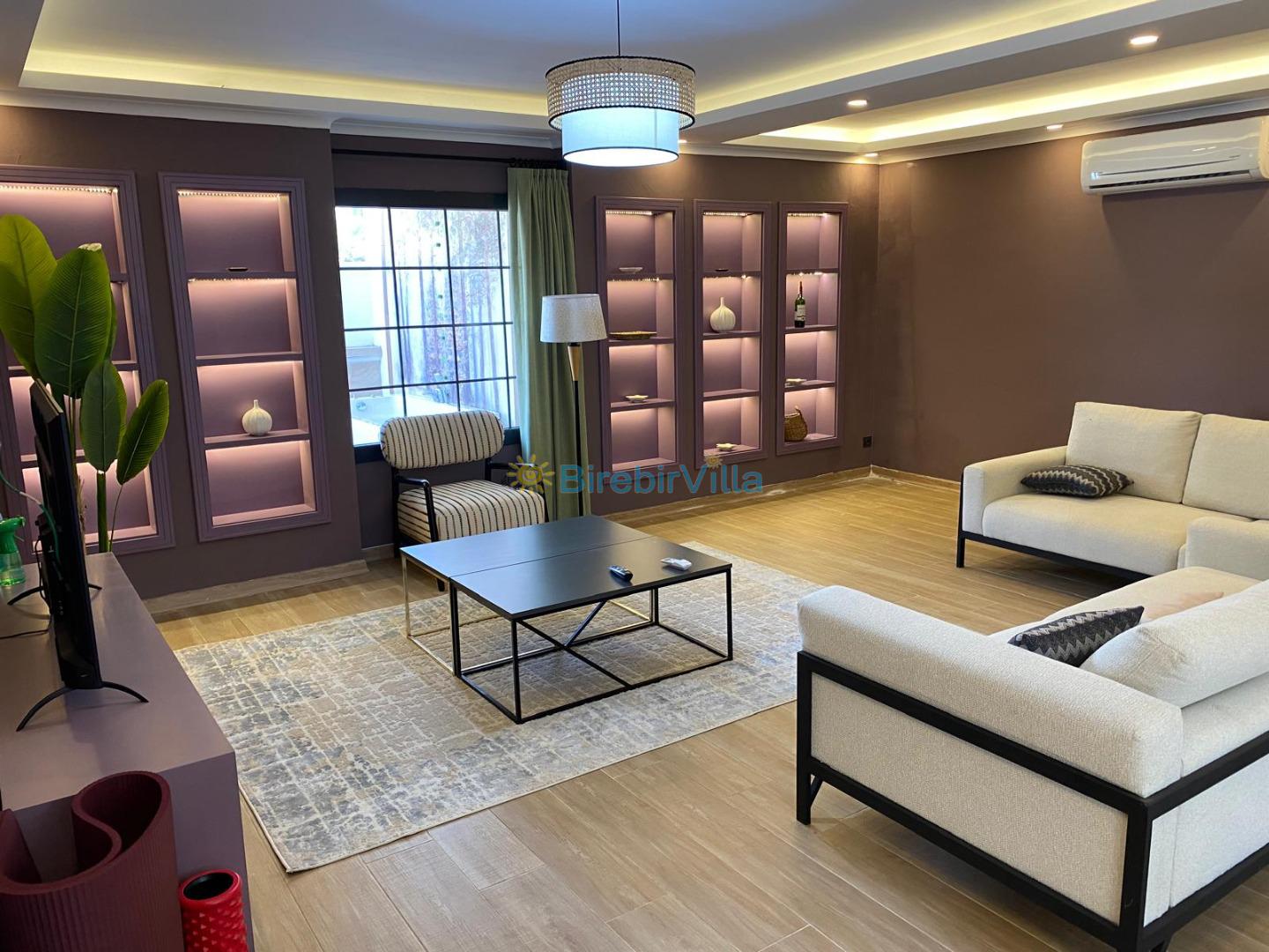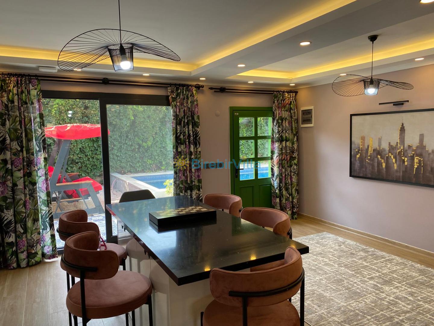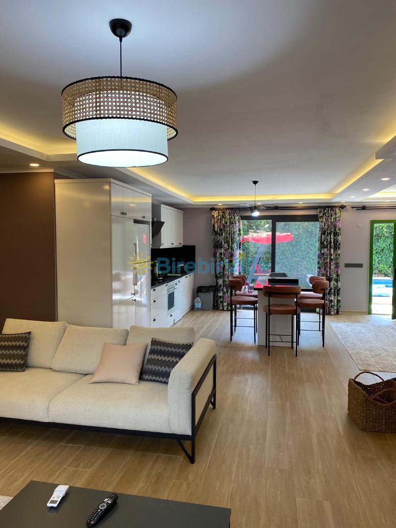 Salon: Açık mutfaklı salon, oturma grubu, Lcd tv, uydu alıcısı, klima bulunmaktadır. Salondan havuz ve bahçeye açılan kapısı mevcuttur.