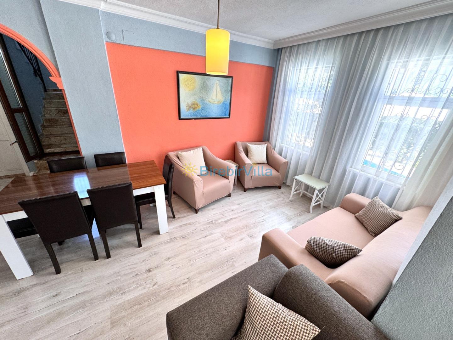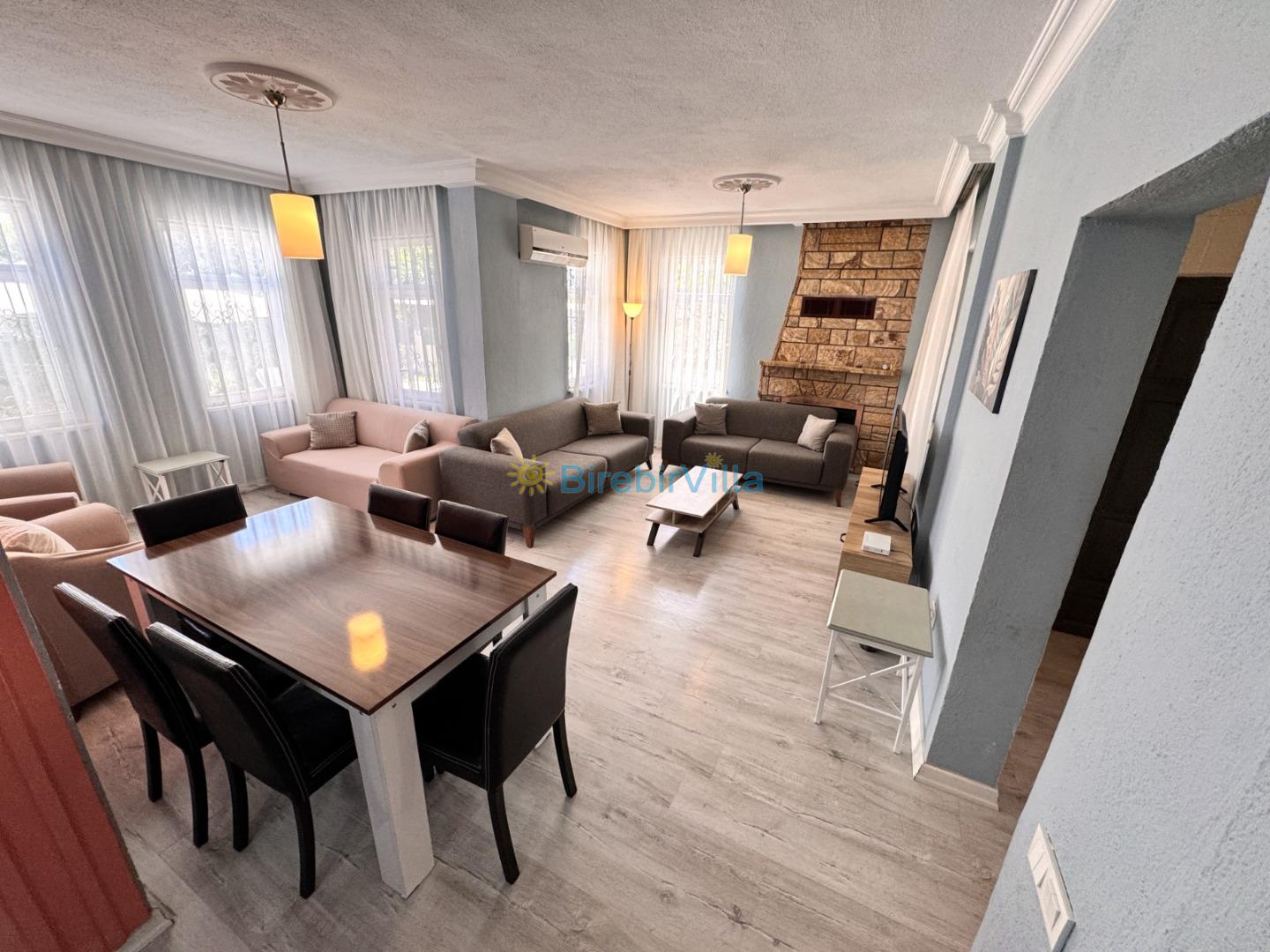 Salon: Modern koltuklar, Lcd tv, uydu alıcısı, 6 kişilik yemek masası, şömine ve klima bulunmaktadır.