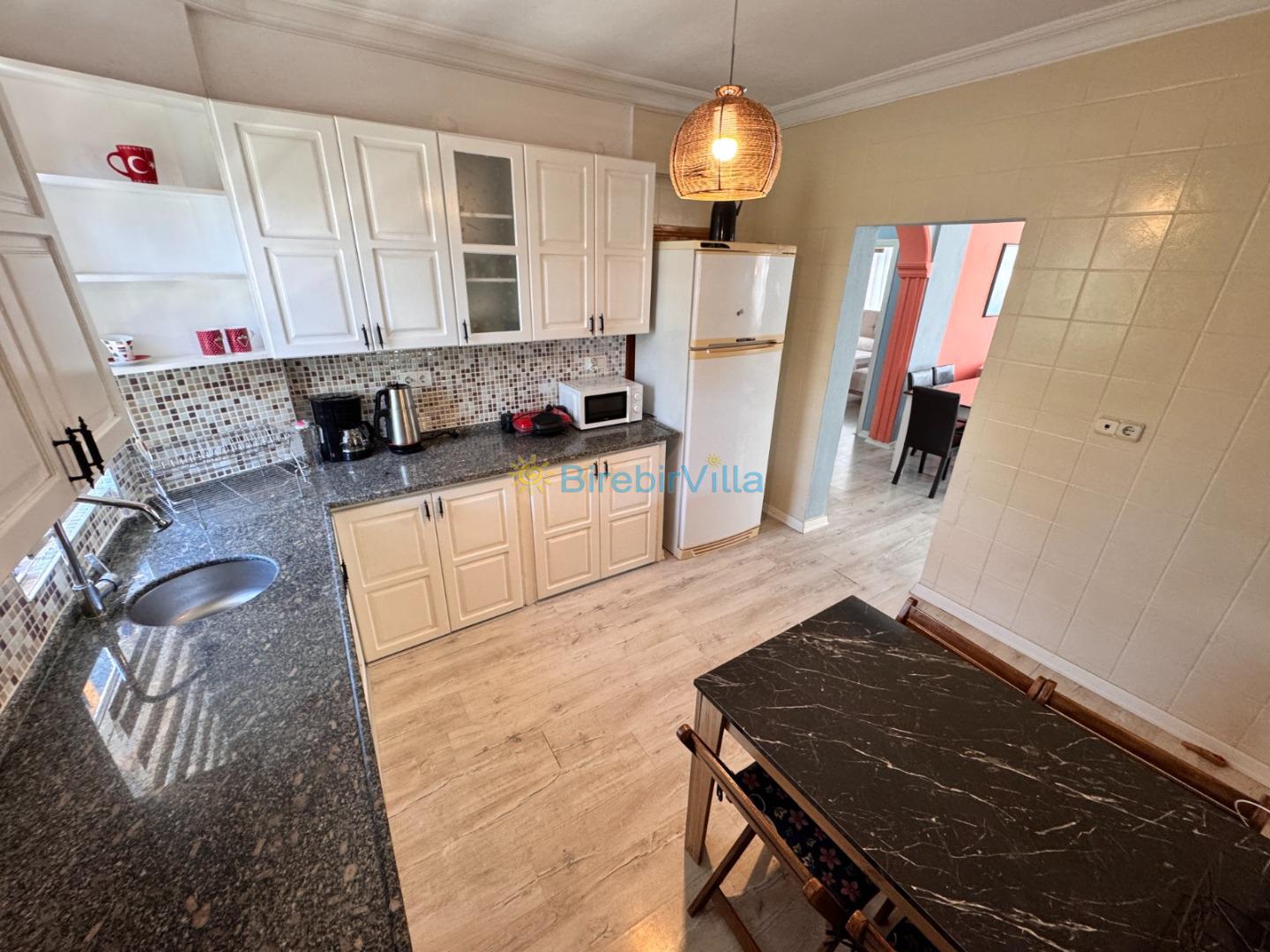 Mutfak : Açık planlı modern mutfak, 12 kişi ve daha fazla kişiye yetecek kadar mutfak malzemeleri, bulaşık makinesi, çamaşır makinesi, fırın, mikrodalga fırın, ocak, buzdolabı tost makinesi, filtre kahve makinesi, çaycı ve kettle bulunmaktadır.