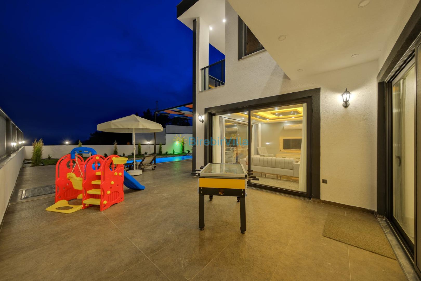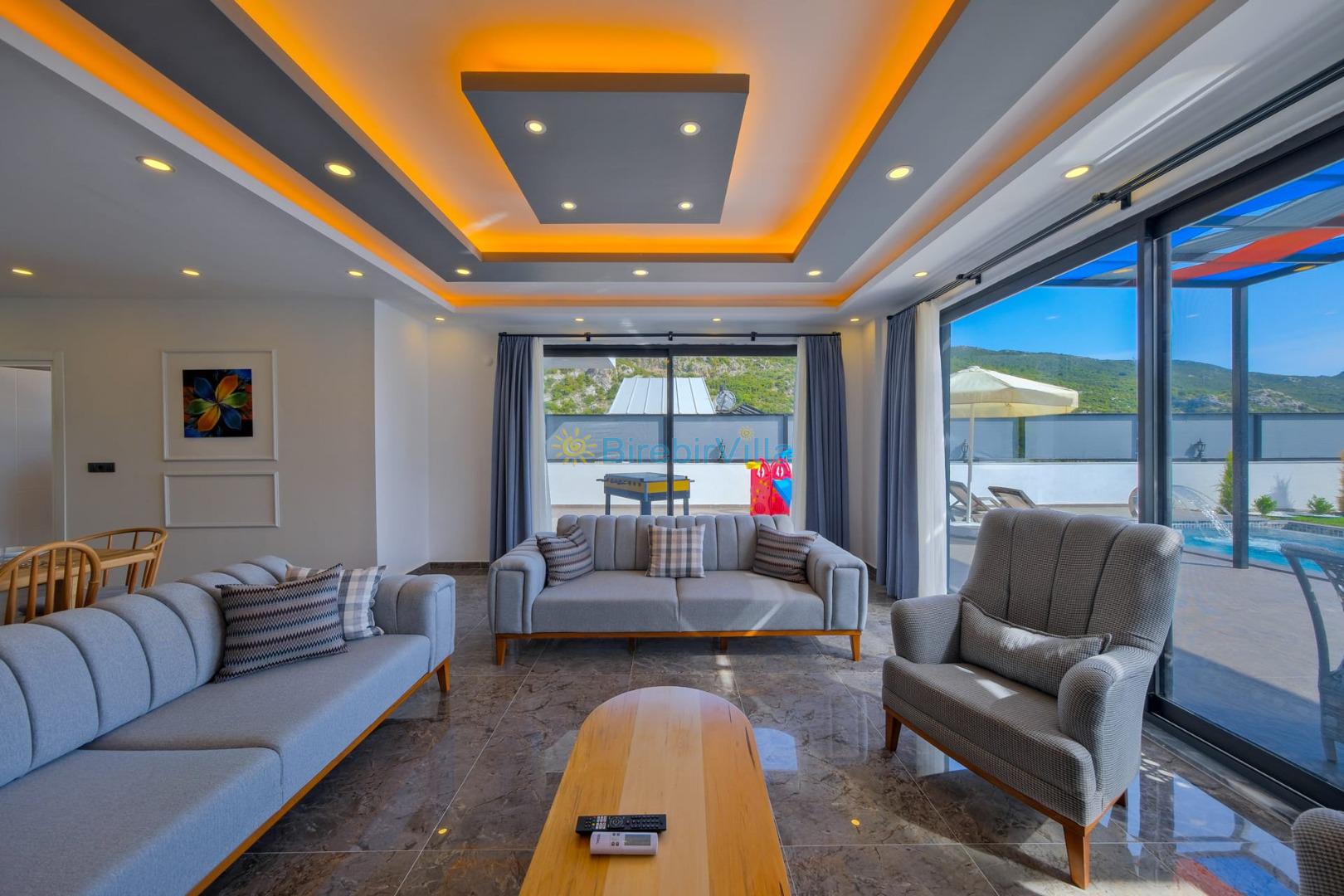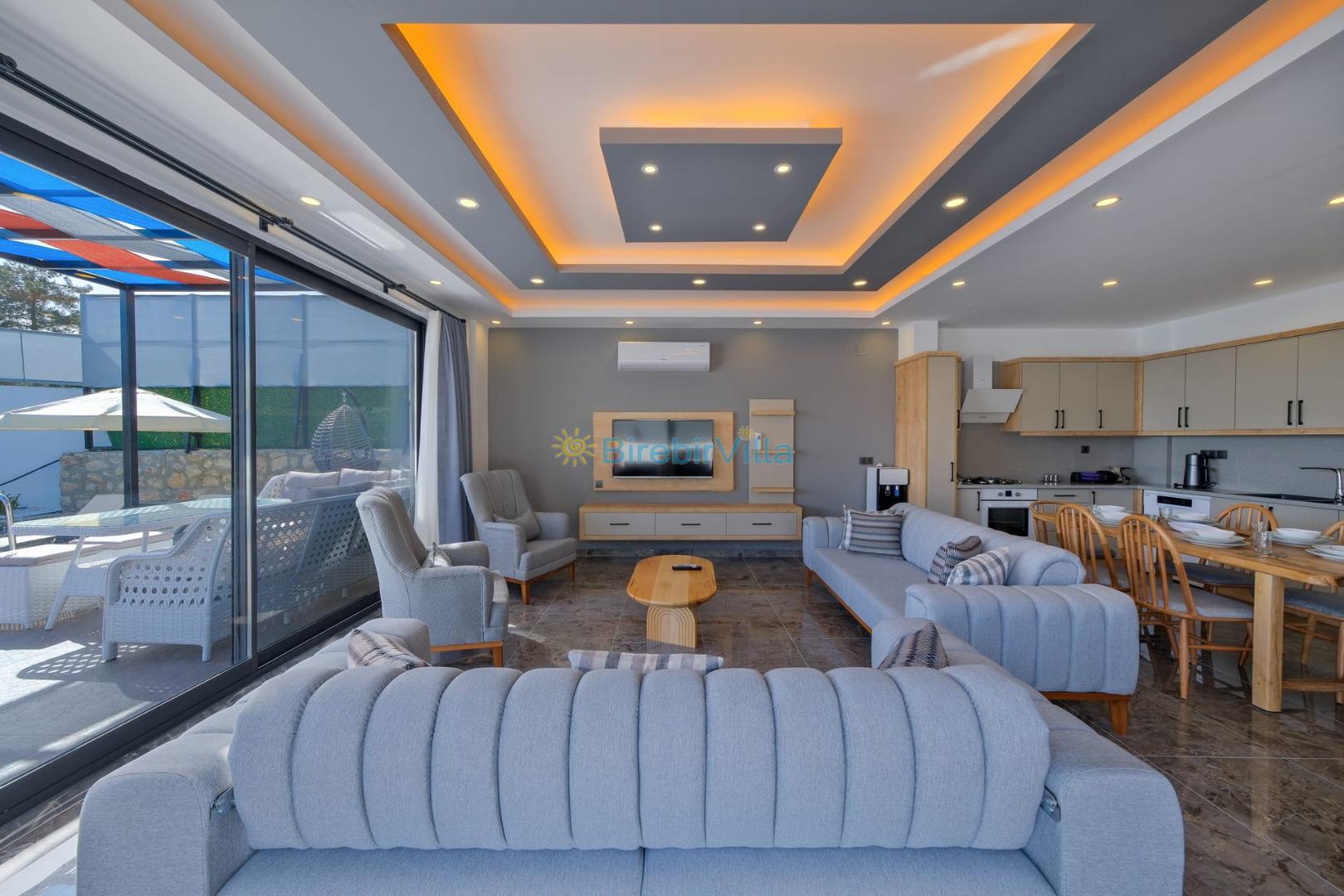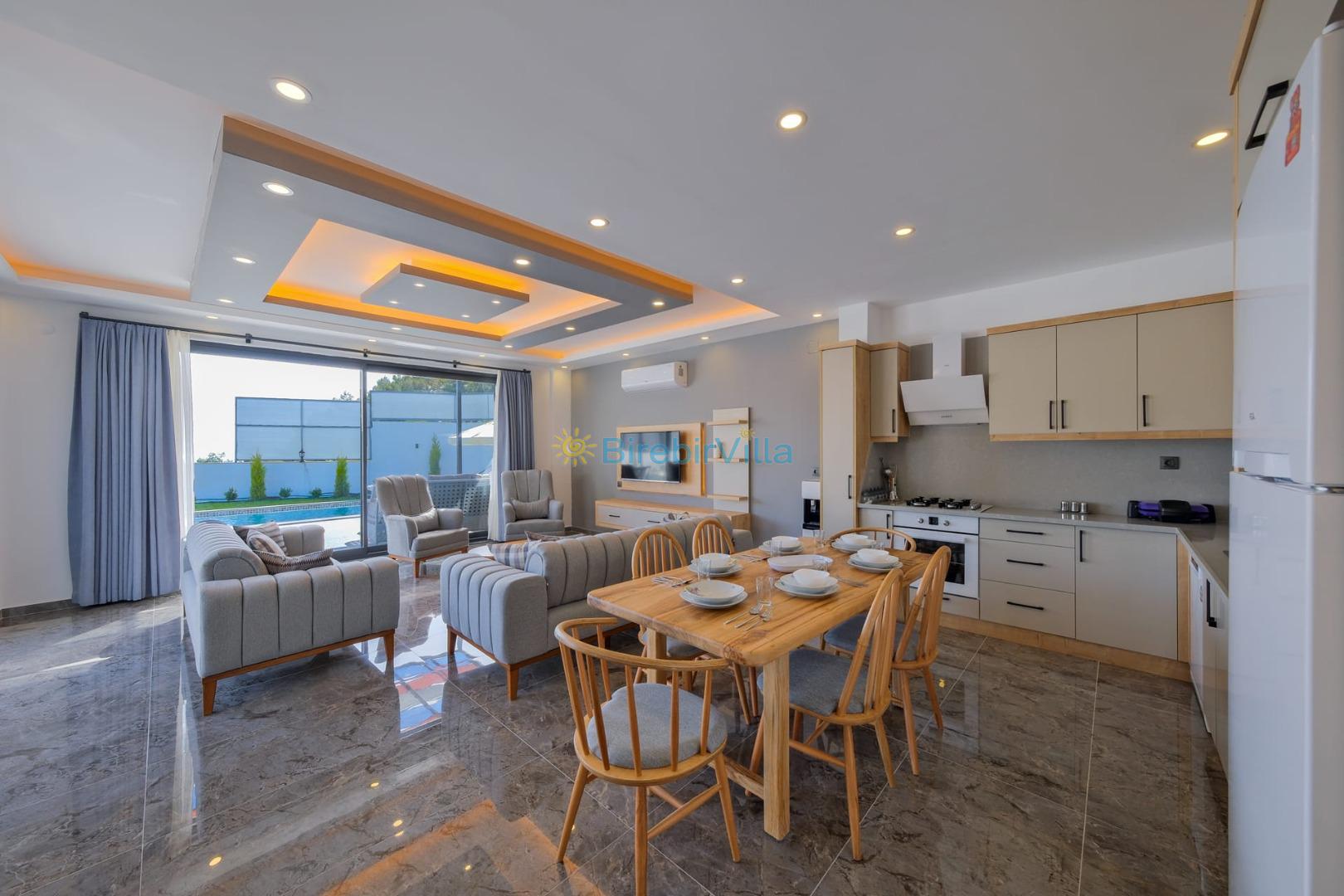 Salon: Klima, televizyon, internet, uydu cihazı, oturma grubu ve yemek masası bulunmaktadır.Salondan havuza açılan balkon kapısı mevcuttur.