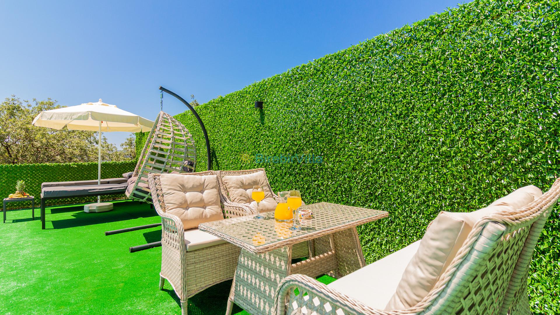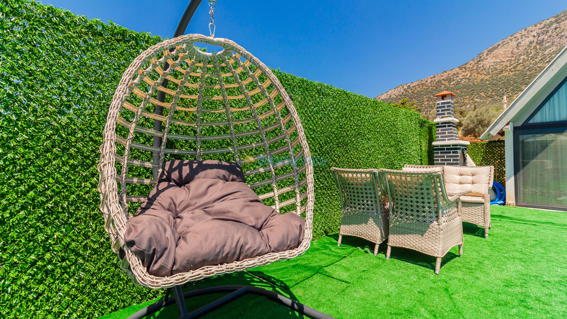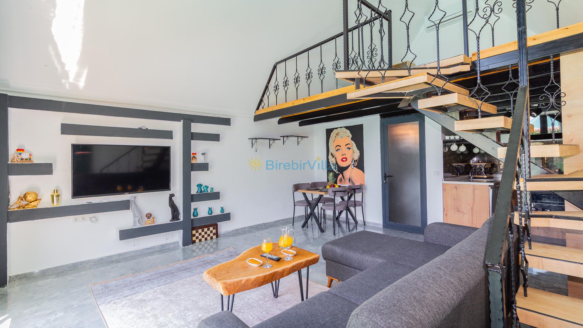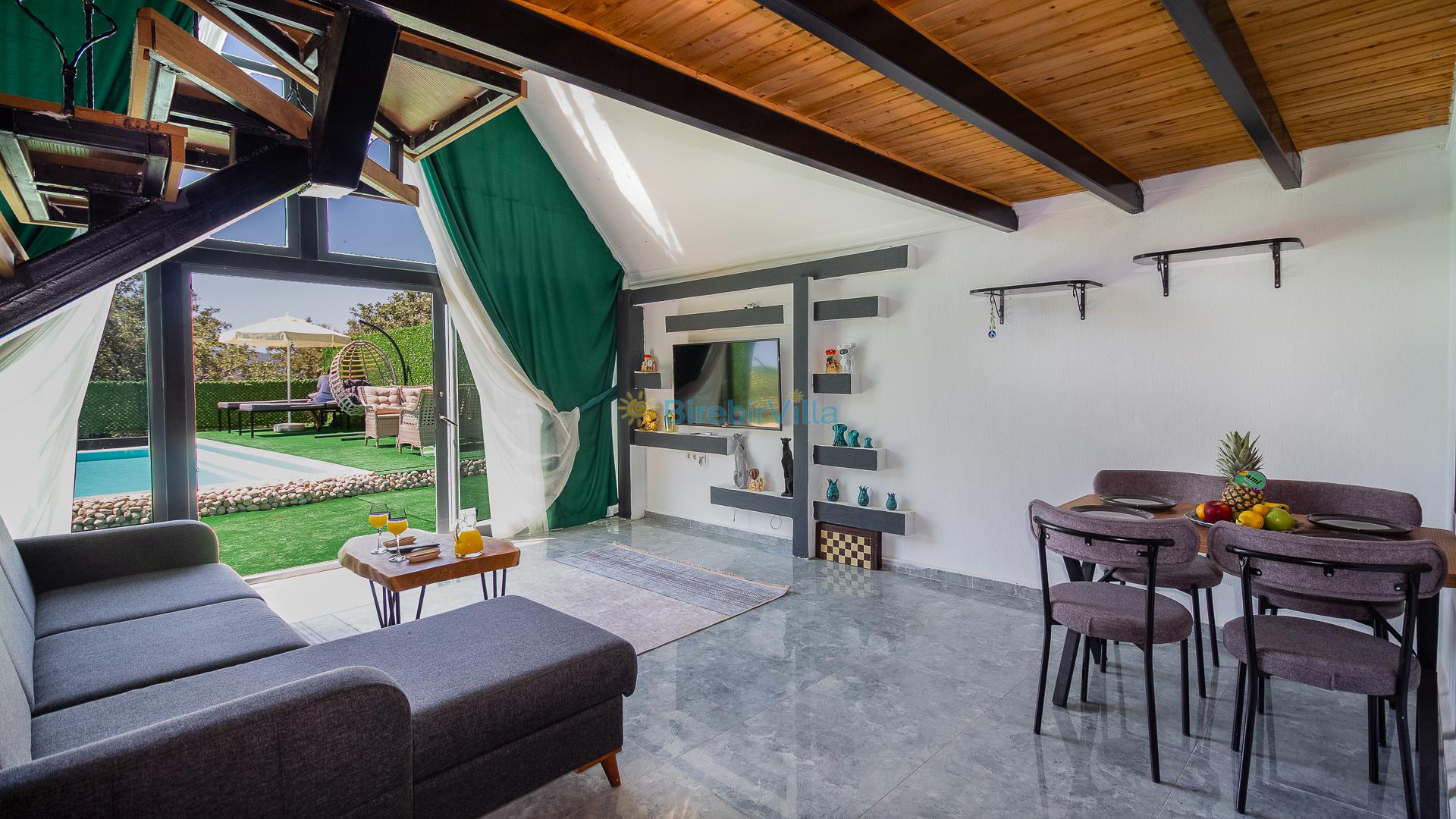 Salon: Özenle döşenmiş açık mutfaklı salon, modern koltuklar, 2 kişilik yemek masası, Lcd tv, uydu alıcısı ve klima bulunmaktadır. Salondan havuz ve bahçeye açılan kapısı mevcuttur.