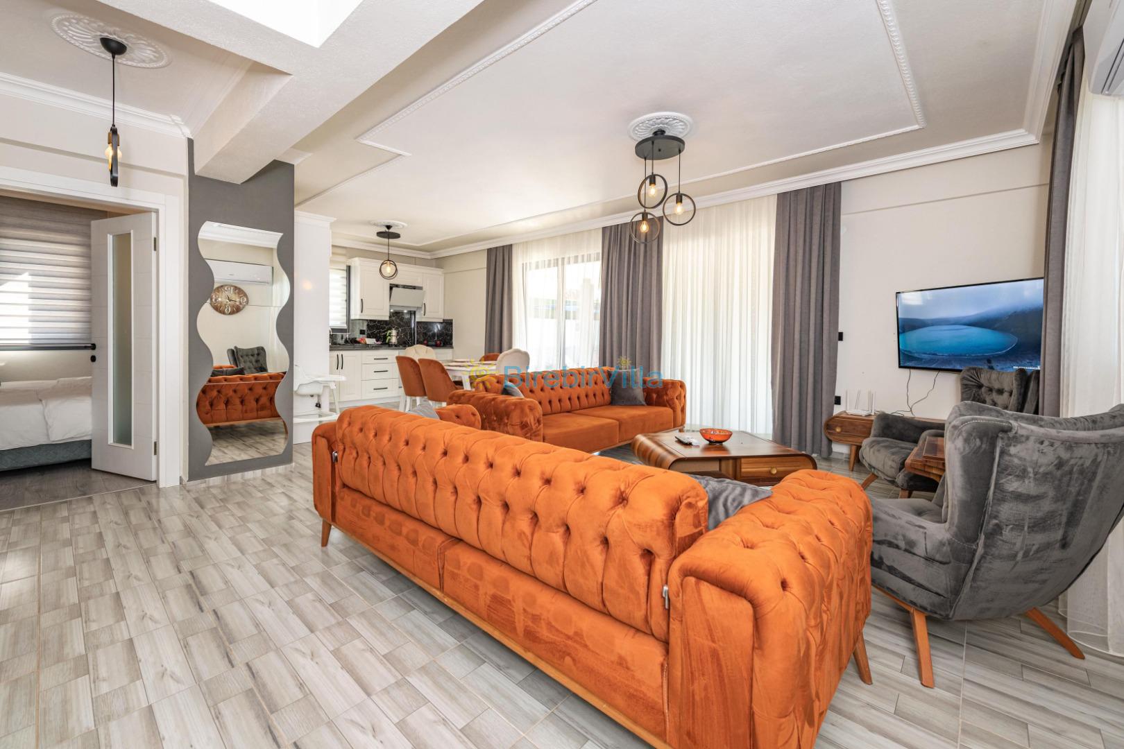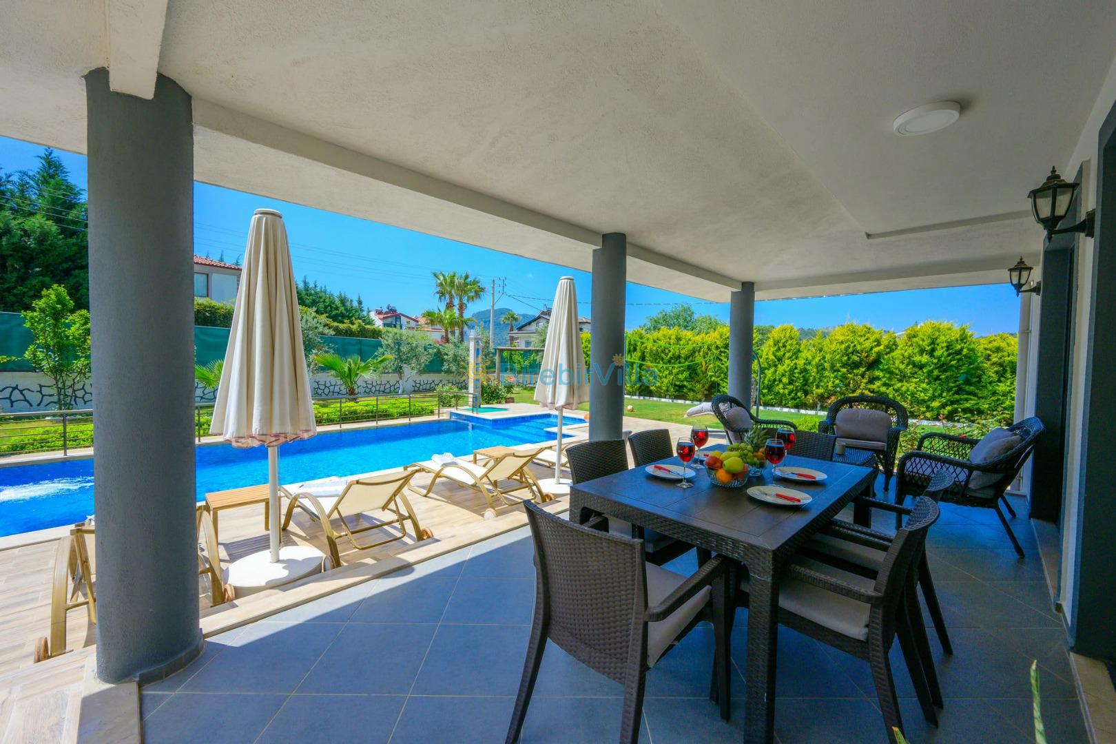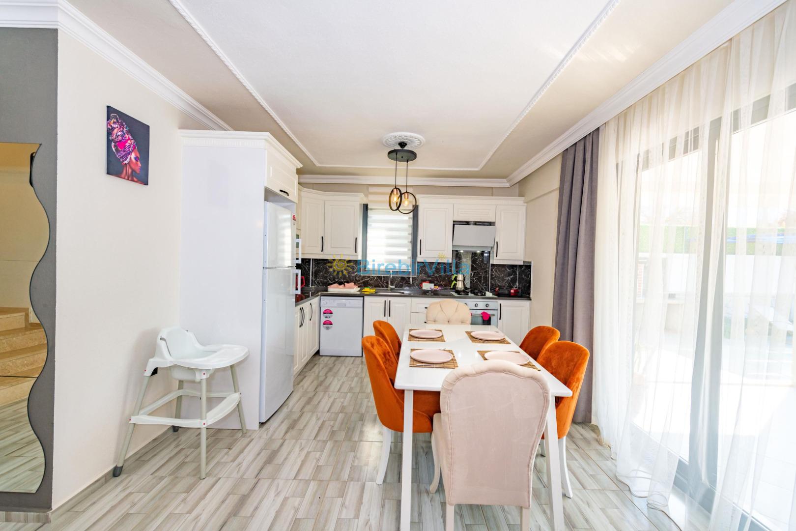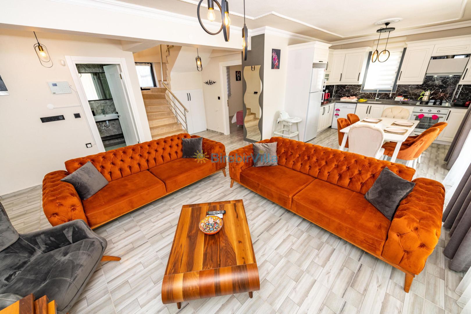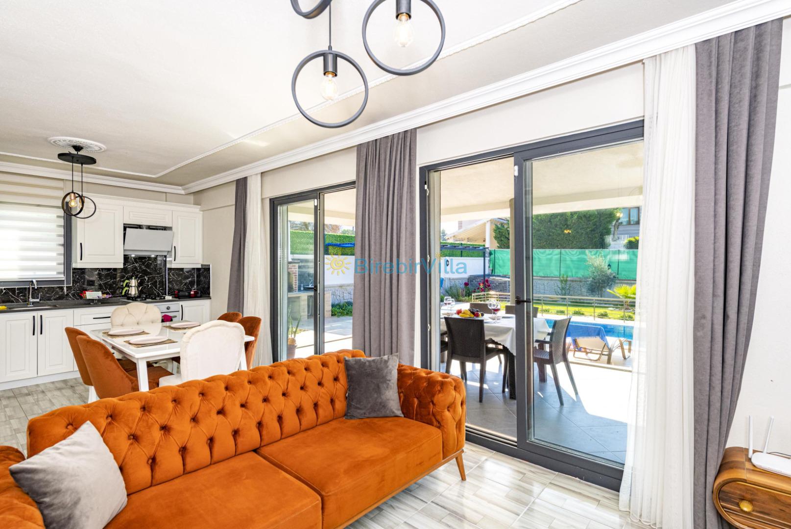 Salon: Özenle döşenmiş açık mutfaklı salon, klima, modern koltuklar, 6 kişilik yemek masası, Led tv, uydu alıcısı, mama sandalyesi ve havuza açılan kapısı bulunmaktadır.