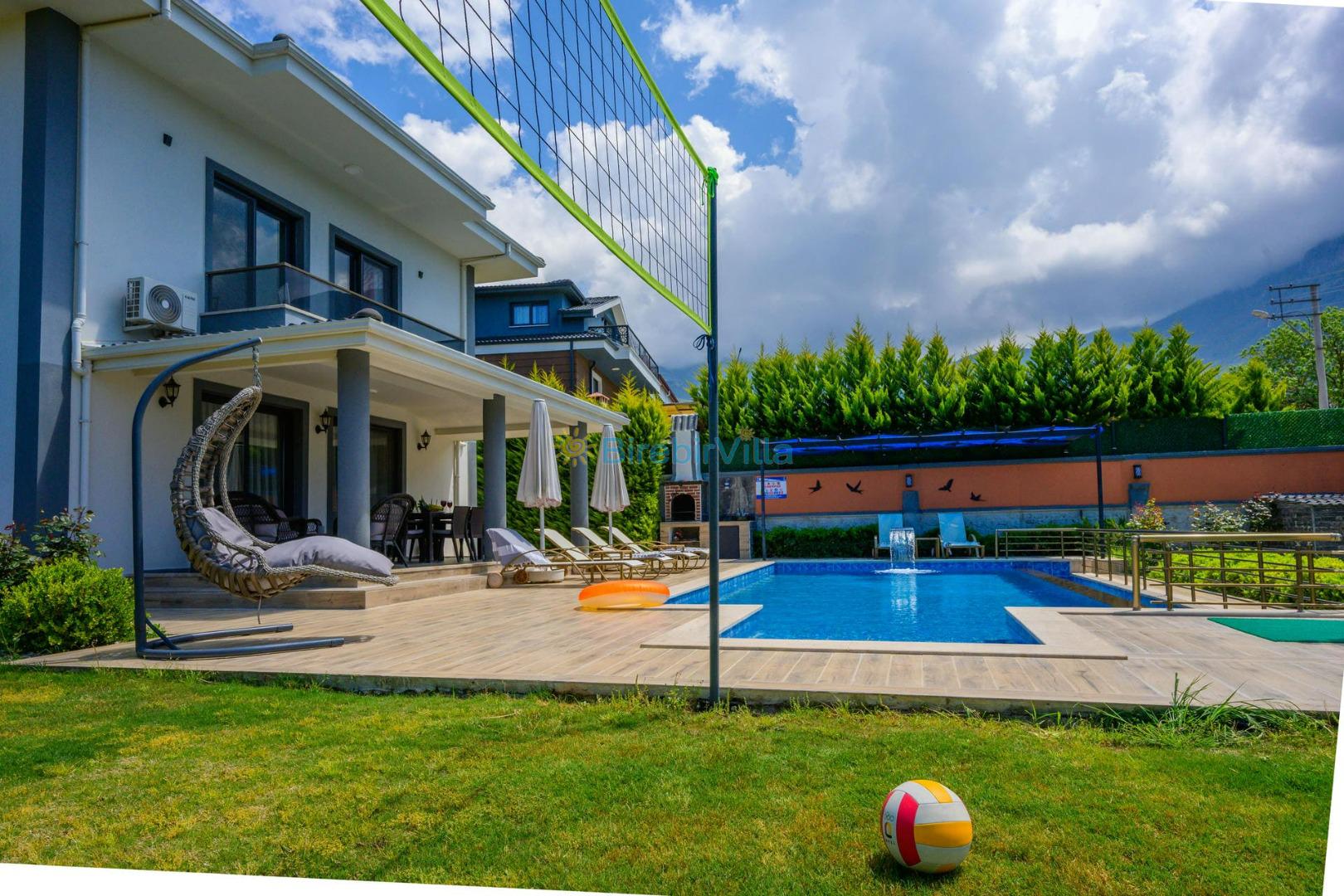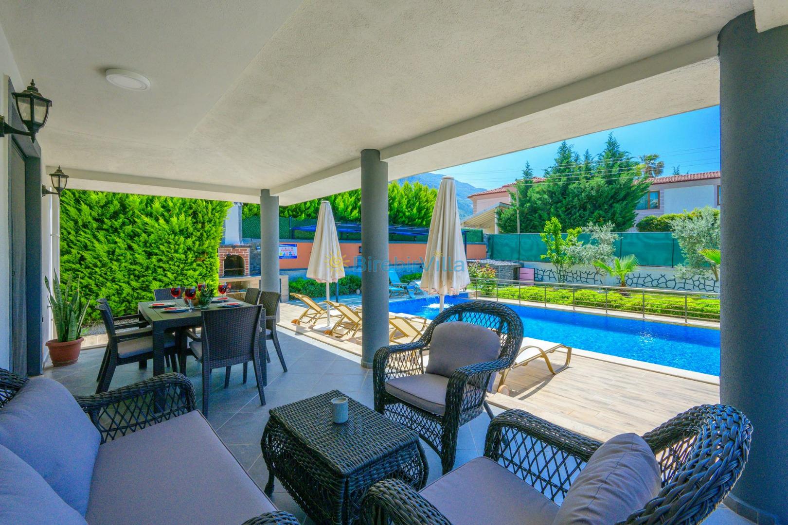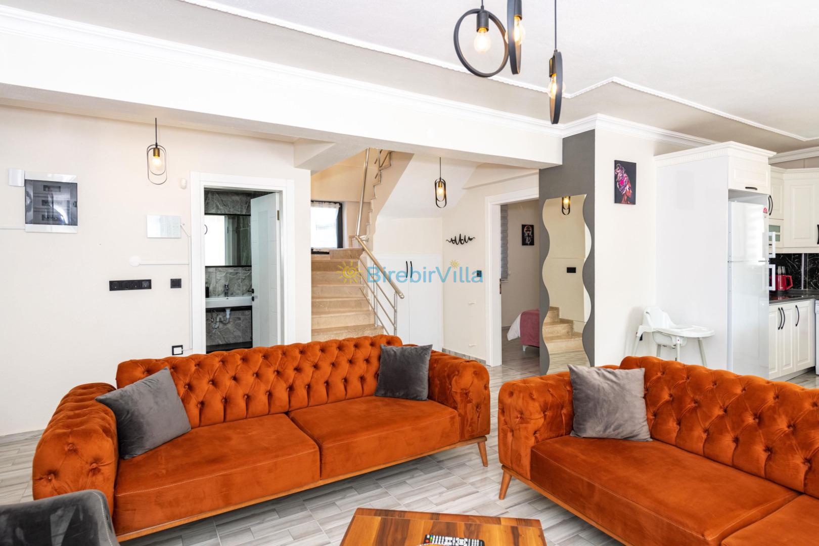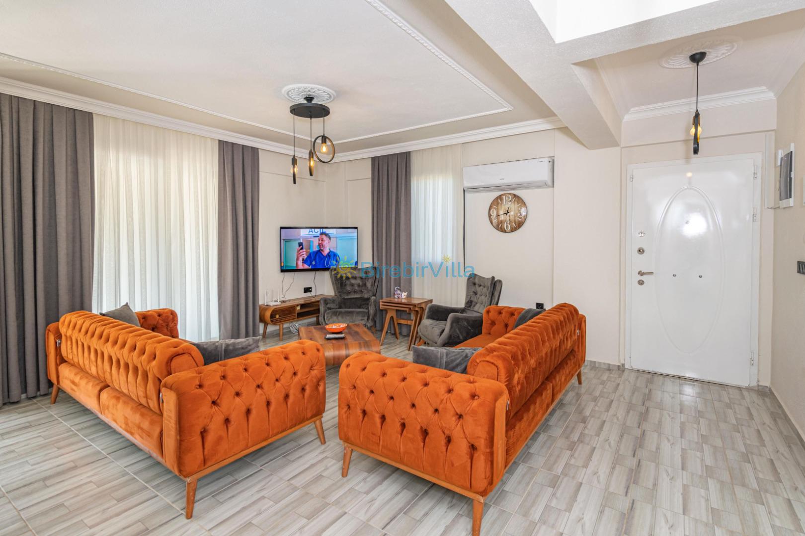 Salon: Özenle döşenmiş açık mutfaklı salon, klima, modern koltuklar, 6 kişilik yemek masası, Led tv, uydu alıcısı, mama sandalyesi ve havuza açılan kapısı bulunmaktadır.