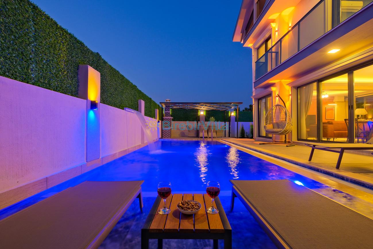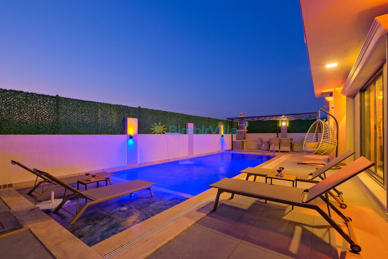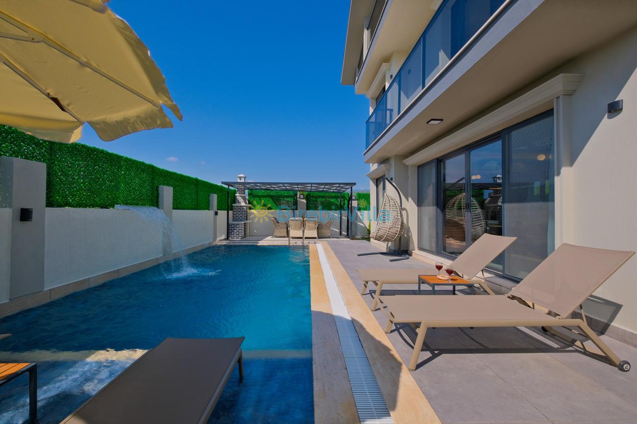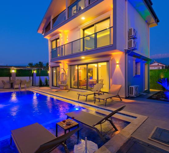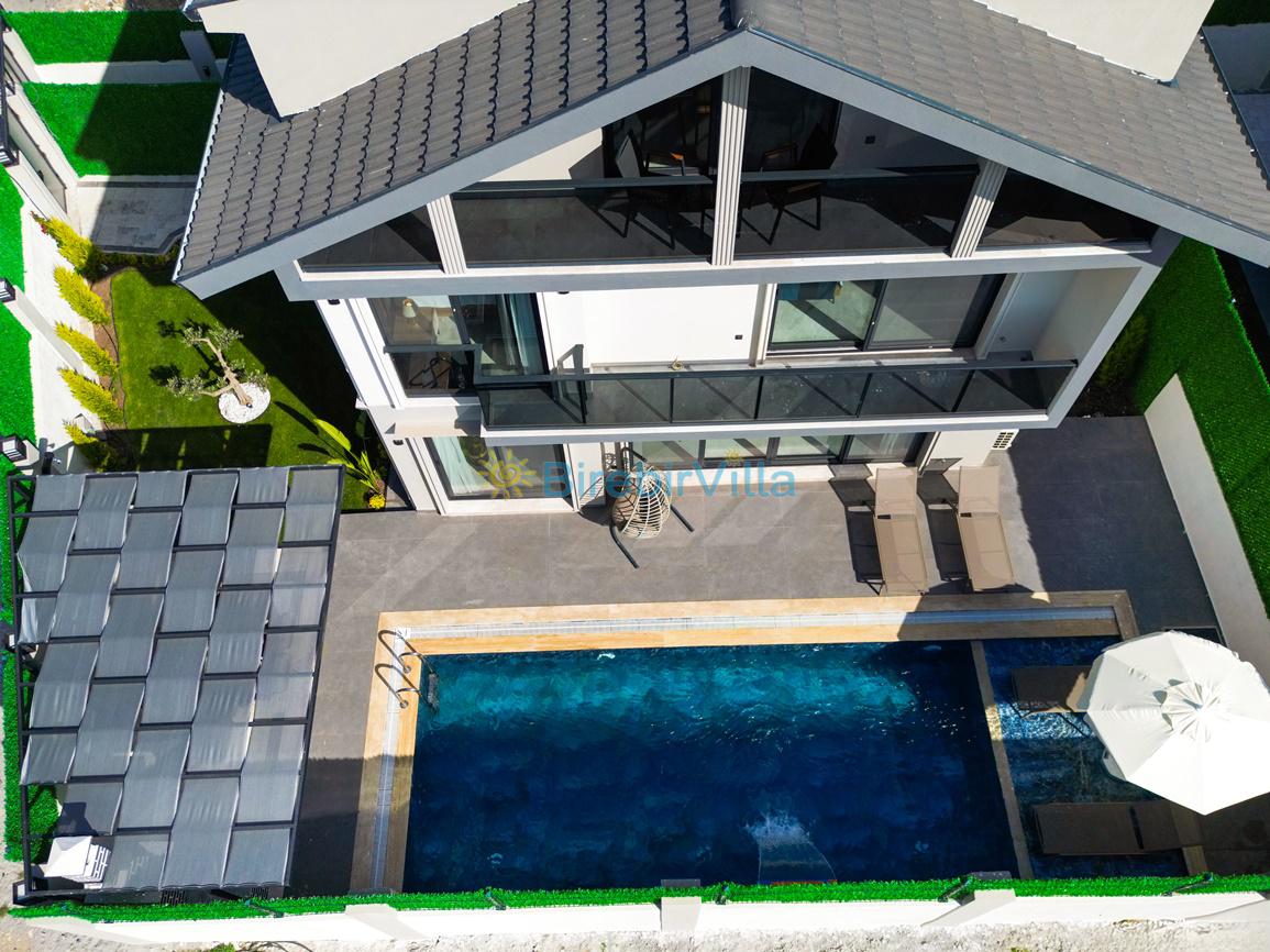 Not: Doğa ile iç içe konuma sahip olan tüm villalarımızda düzenli olarak ilaçlama yapılır. Buna rağmen çevrede haşere vb. bulunma ihtimali vardır. Havuzu korunaklı villalarımızda kesinlikle %100 görünmeme garantisi vermemekteyiz. Bu villalarımızda her zaman % 5 sakınma payı mevcuttur. Sitemizde bulunan villa fotoğraflarının, görüntüyü ekrana sığdırmak için ’Geniş Açılı Lens’ ile çekilmektedir. Bu sebeple resimlerdeki objeler, gerçek boyutlarından daha büyük veya küçük görünebilmekte.
