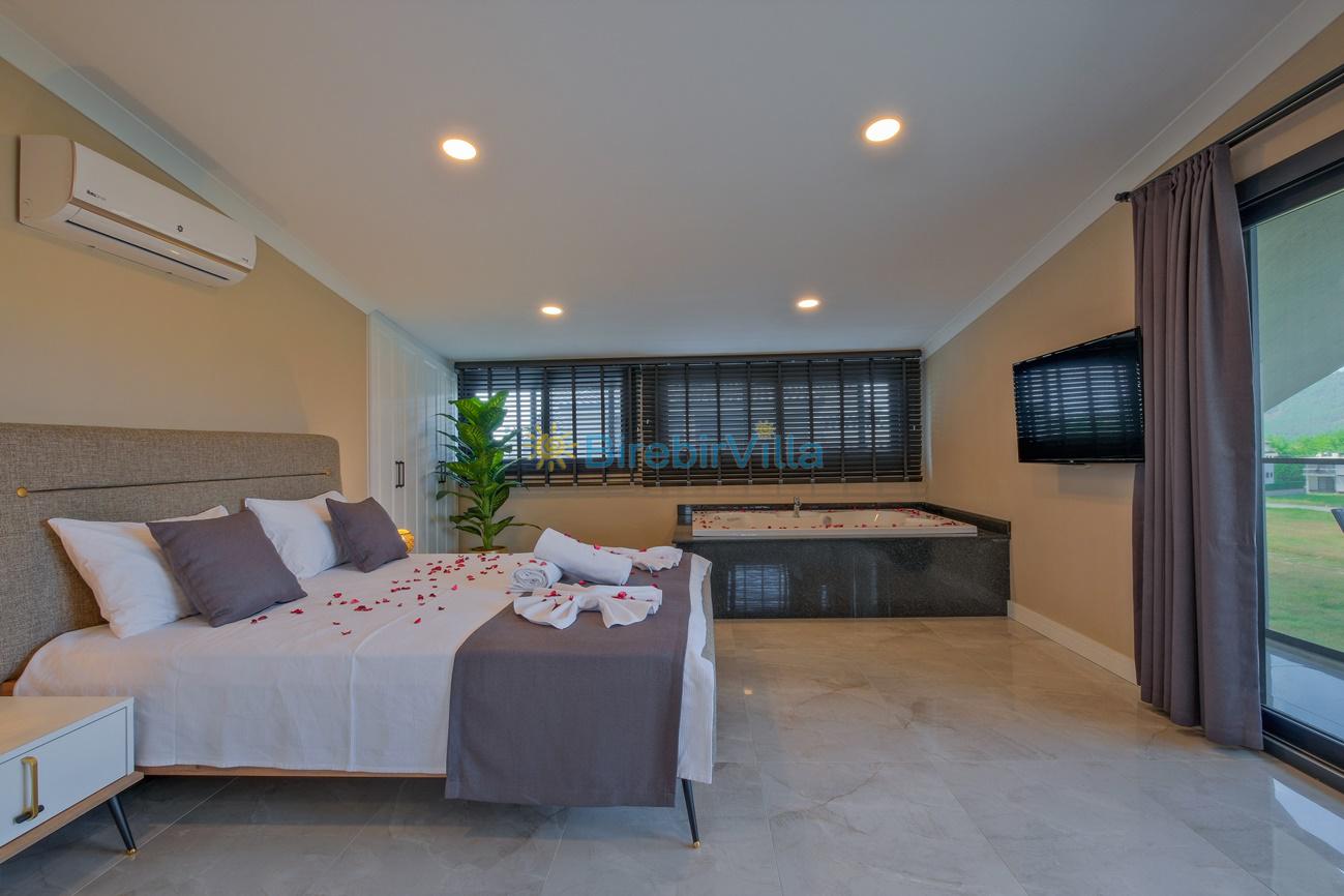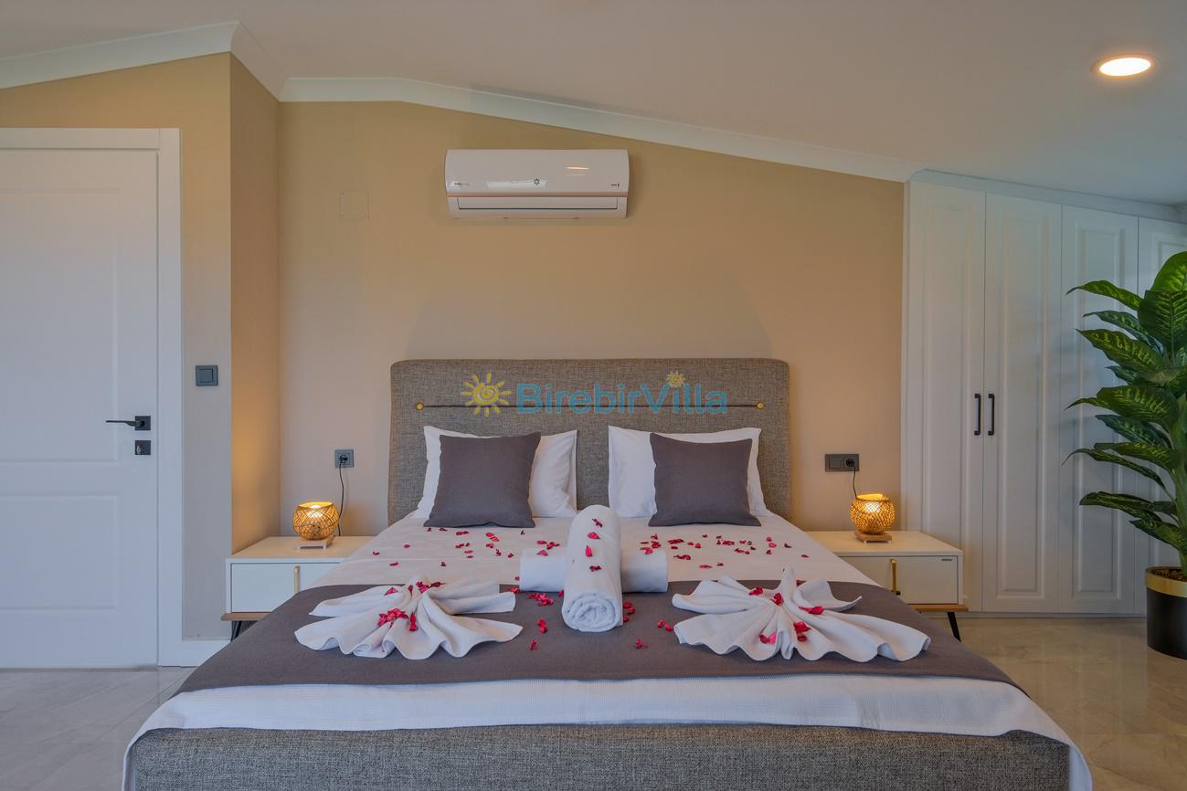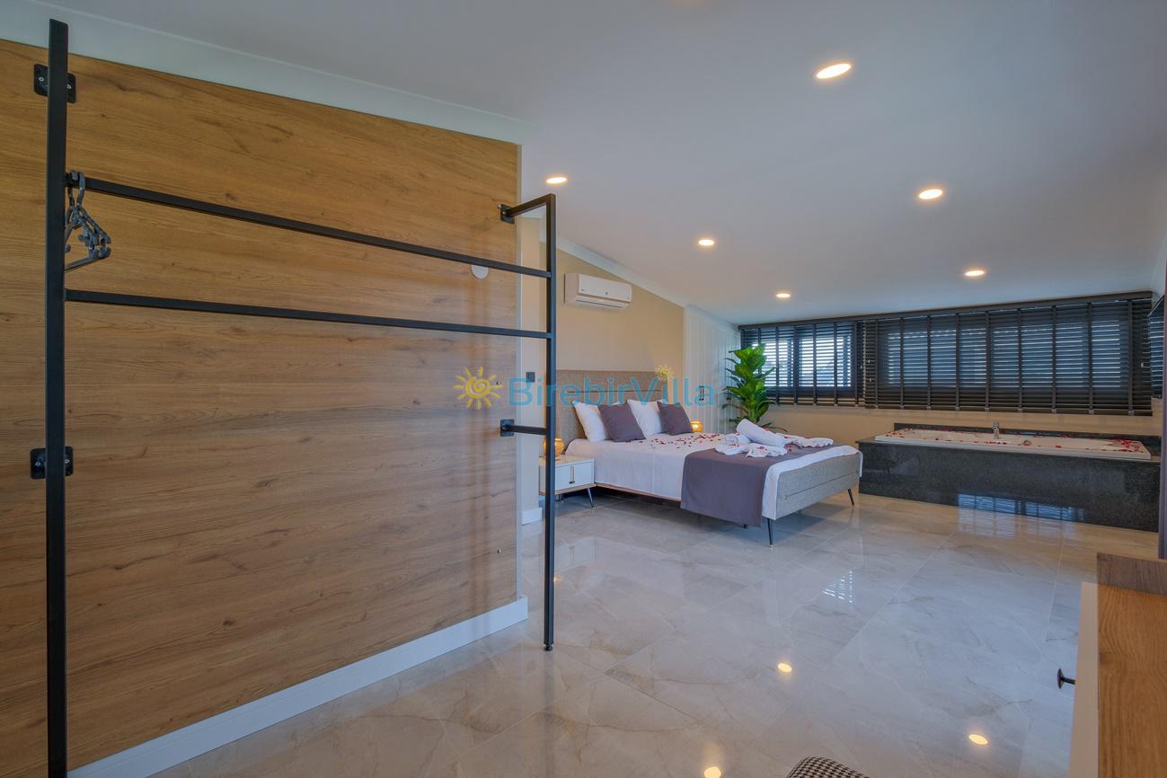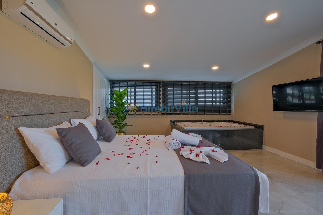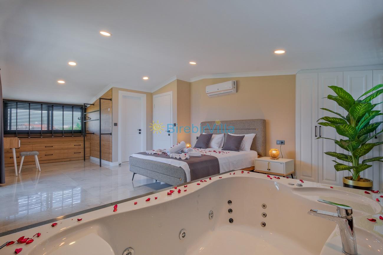 1.Yatak odası: Çift kişilik yatak, klima, jakuzi, ebeveyn banyo, komodin, makyaj masası, elbise dolabı ve televizyon bulunmaktadır.