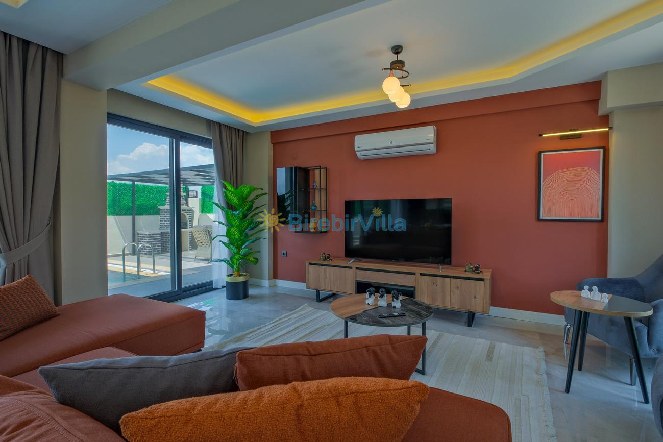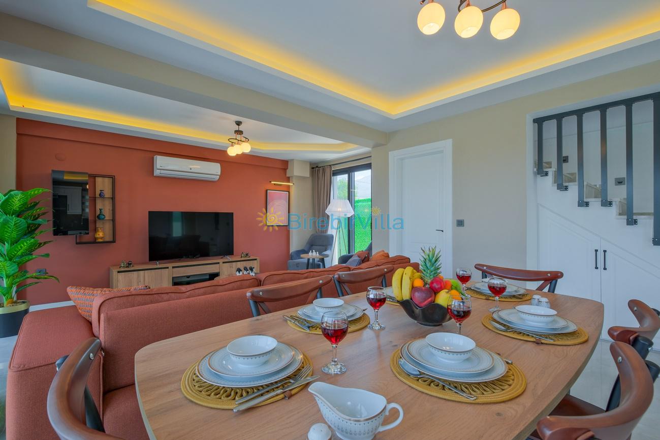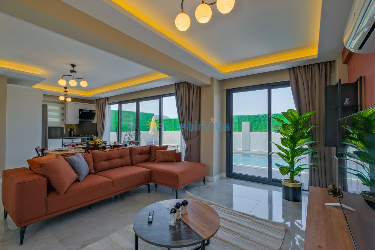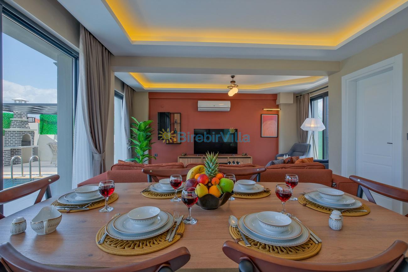 Salon: Özenle döşenmiş açık mutfaklı salon, klima, modern koltuklar, 6 kişilik yemek masası, Led tv, uydu alıcısı, havuz ve bahçeye açılan kapısı bulunmaktadır.
