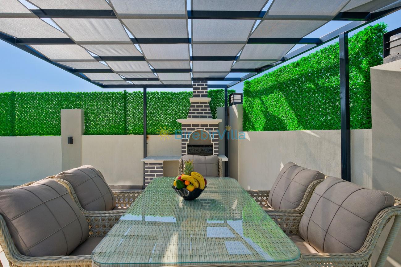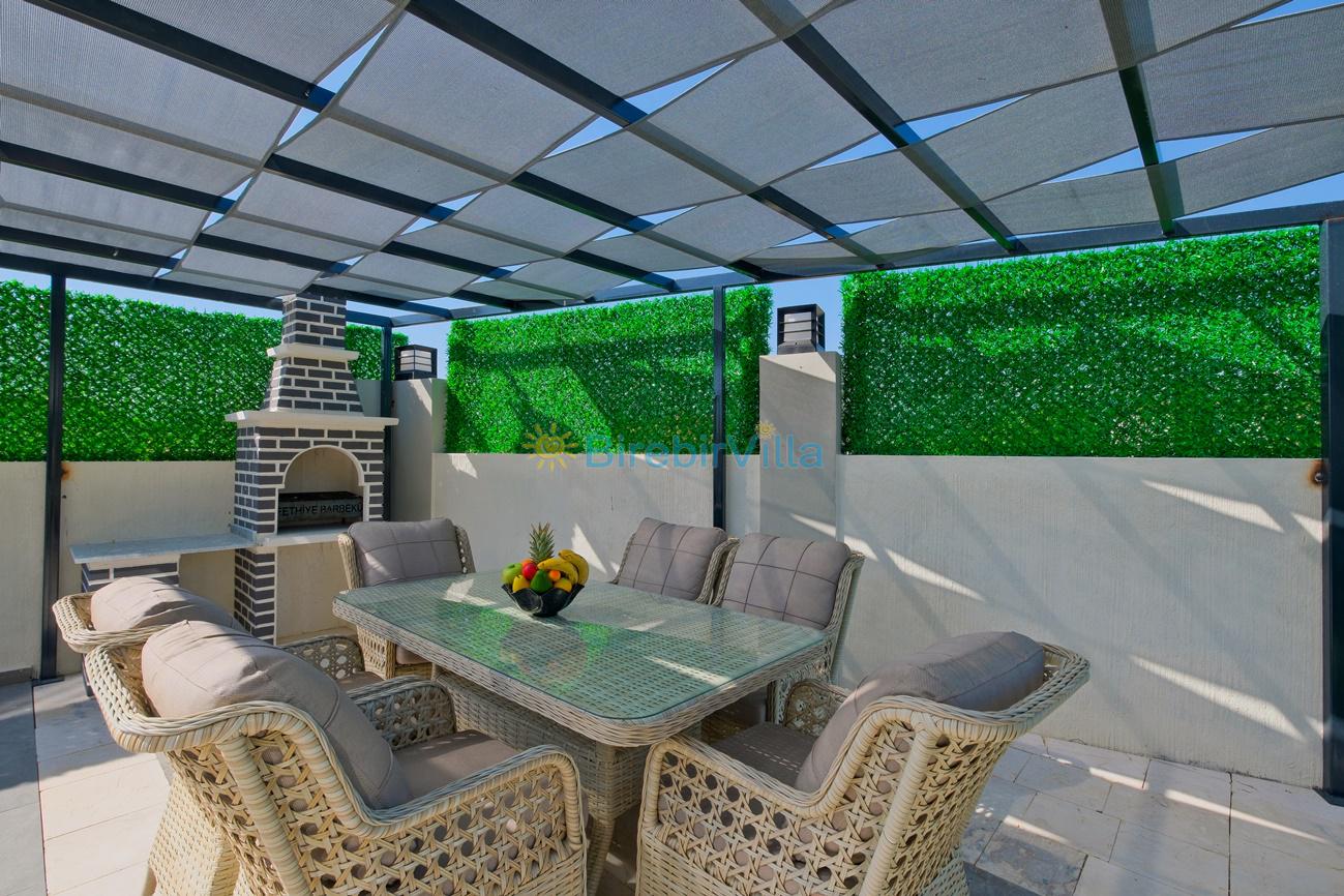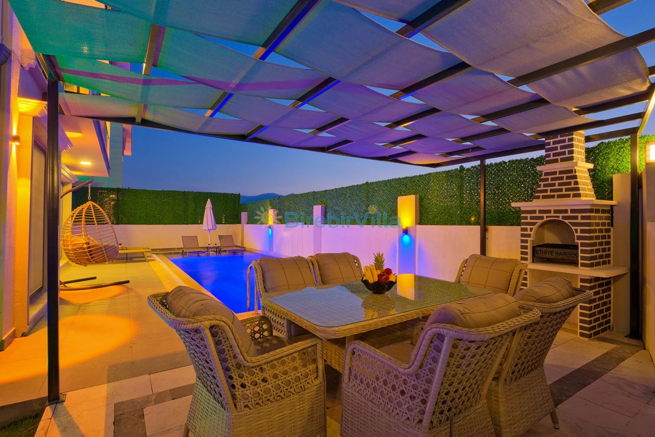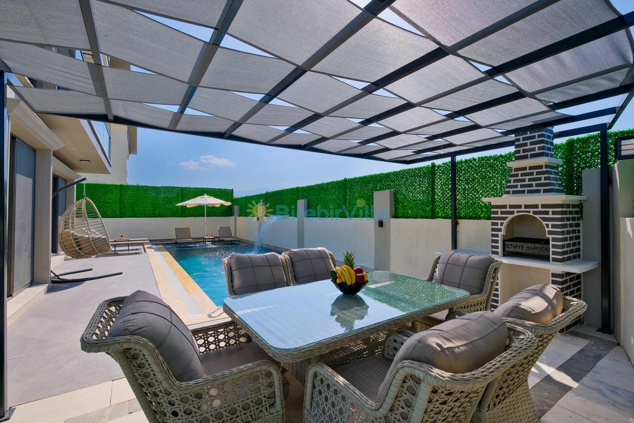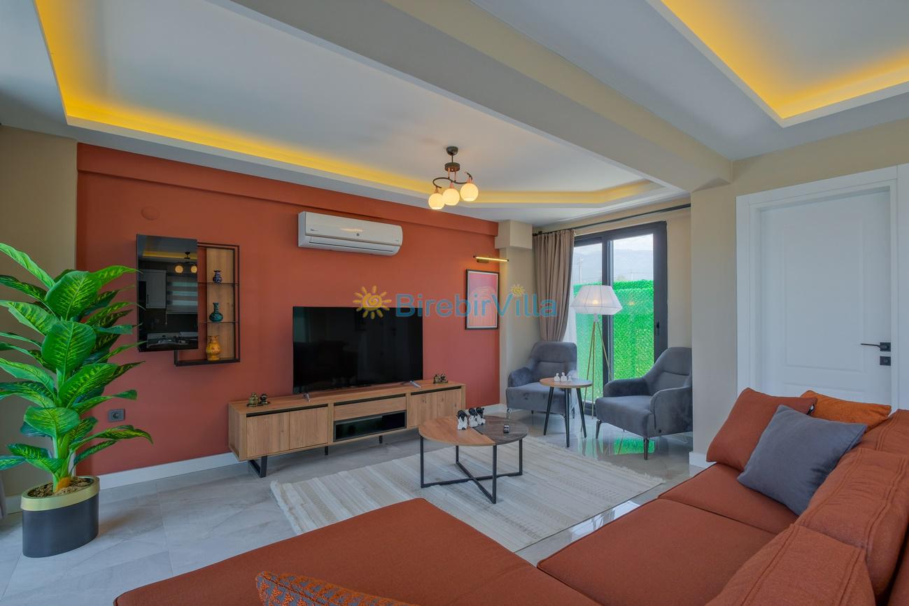 Salon: Özenle döşenmiş açık mutfaklı salon, klima, modern koltuklar, 6 kişilik yemek masası, Led tv, uydu alıcısı, havuz ve bahçeye açılan kapısı bulunmaktadır.