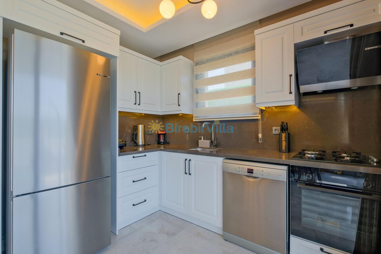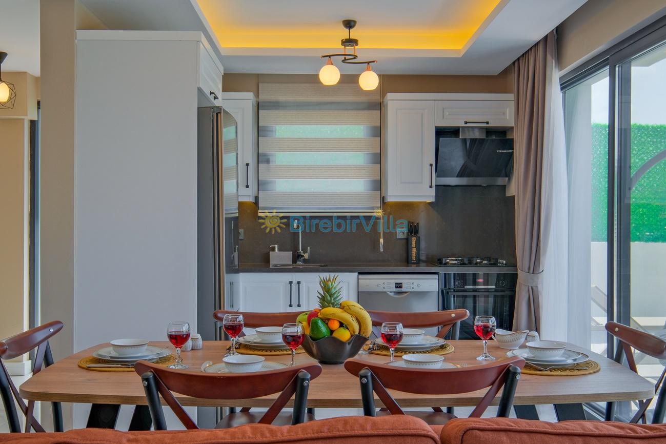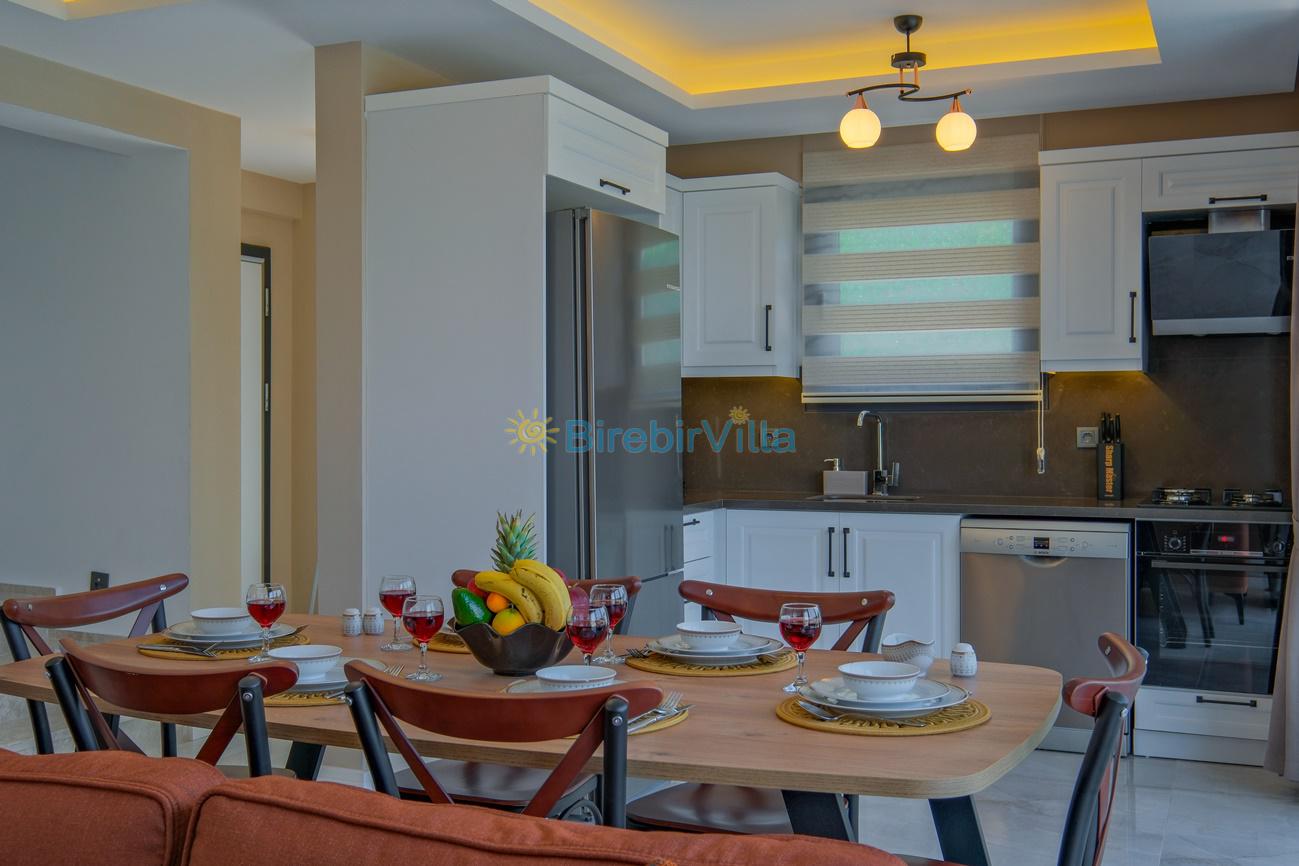 Mutfak: Açık planlı mutfak, 6 kişi ve daha fazla kişiye yetecek kadar mutfak malzemeleri, bulaşık makinesi, çamaşır makinesi, fırın, ocak, buzdolabı, tost makinesi, kahve makinesi, çaydanlık ve çaycı bulunmaktadır.