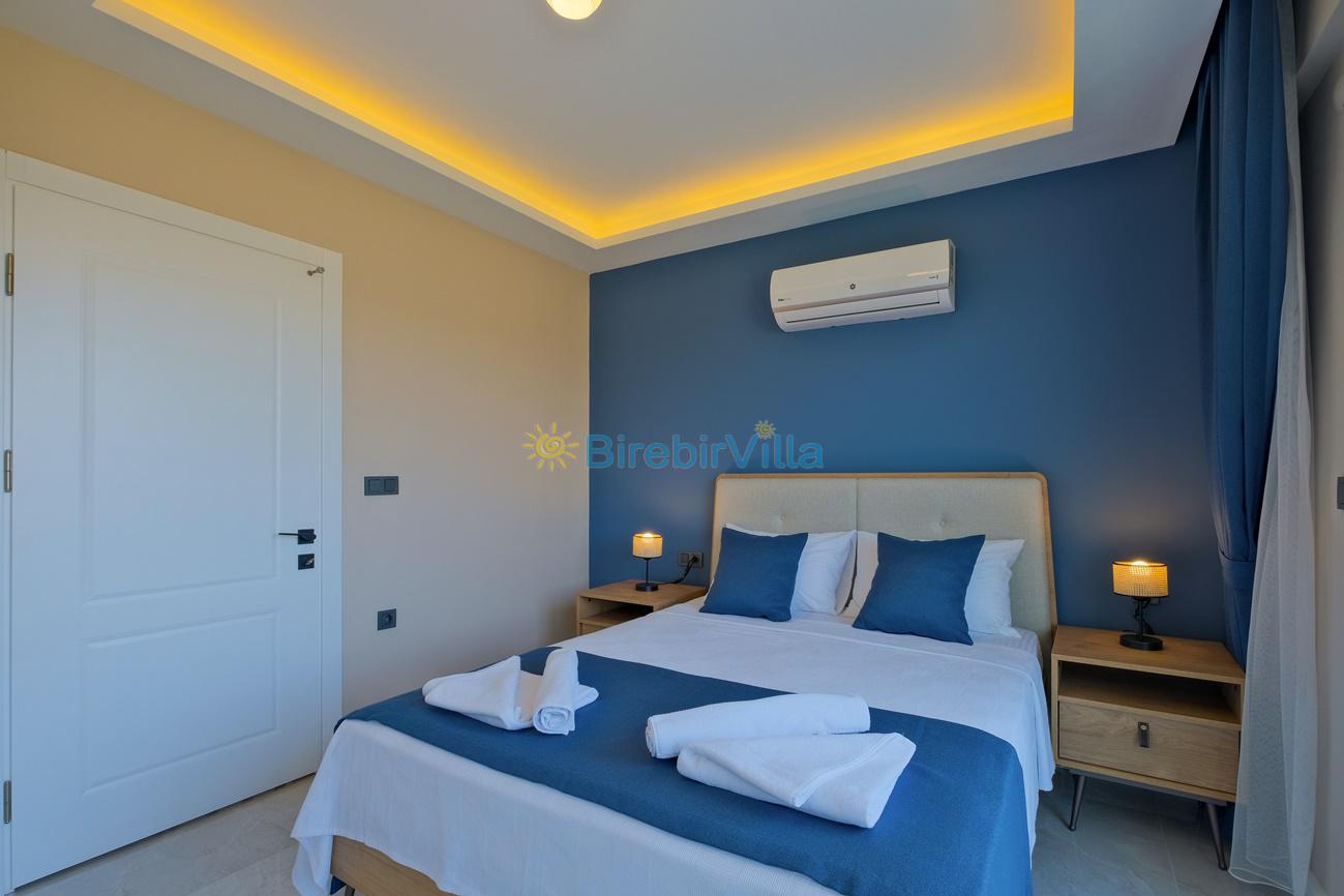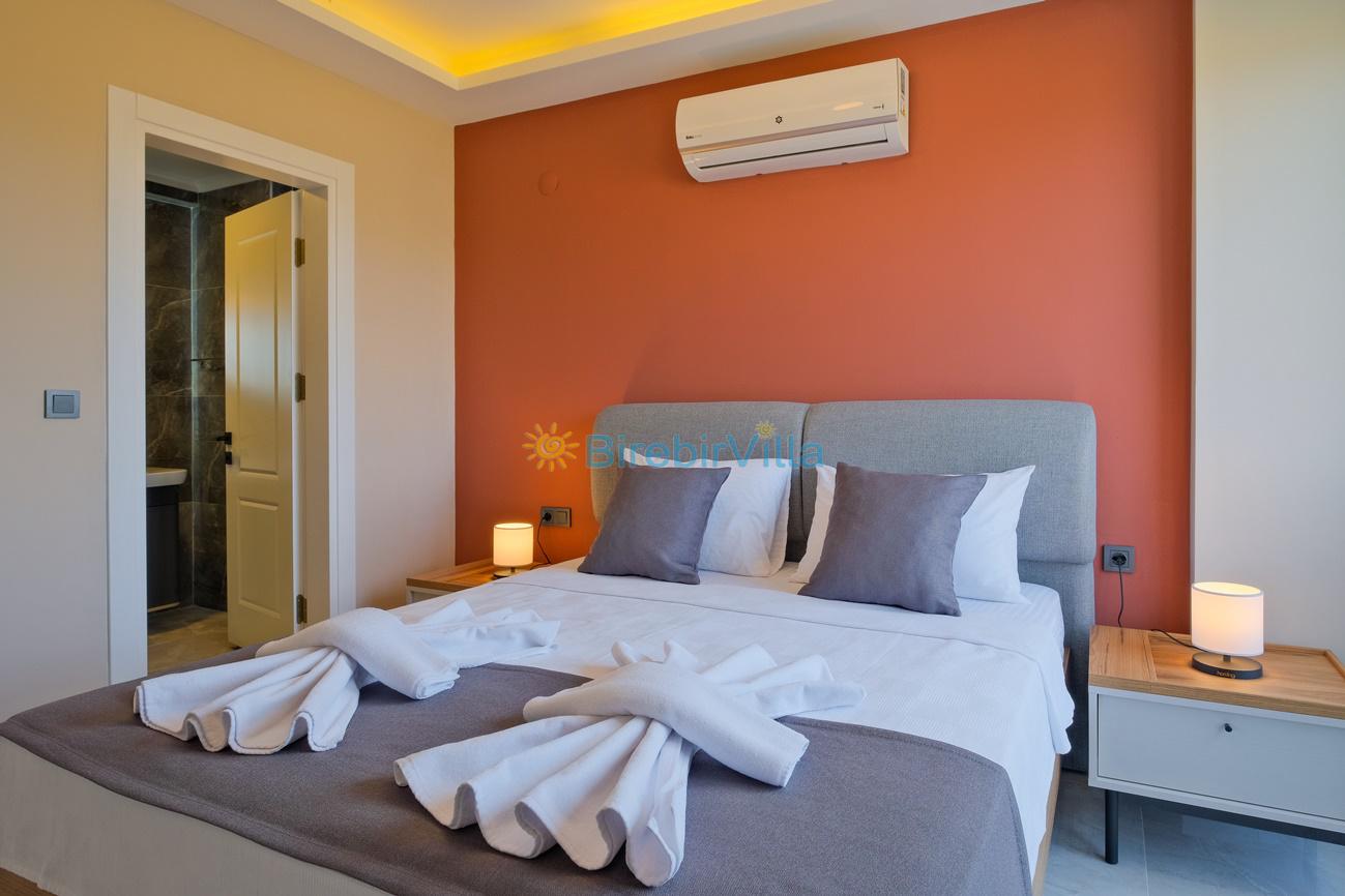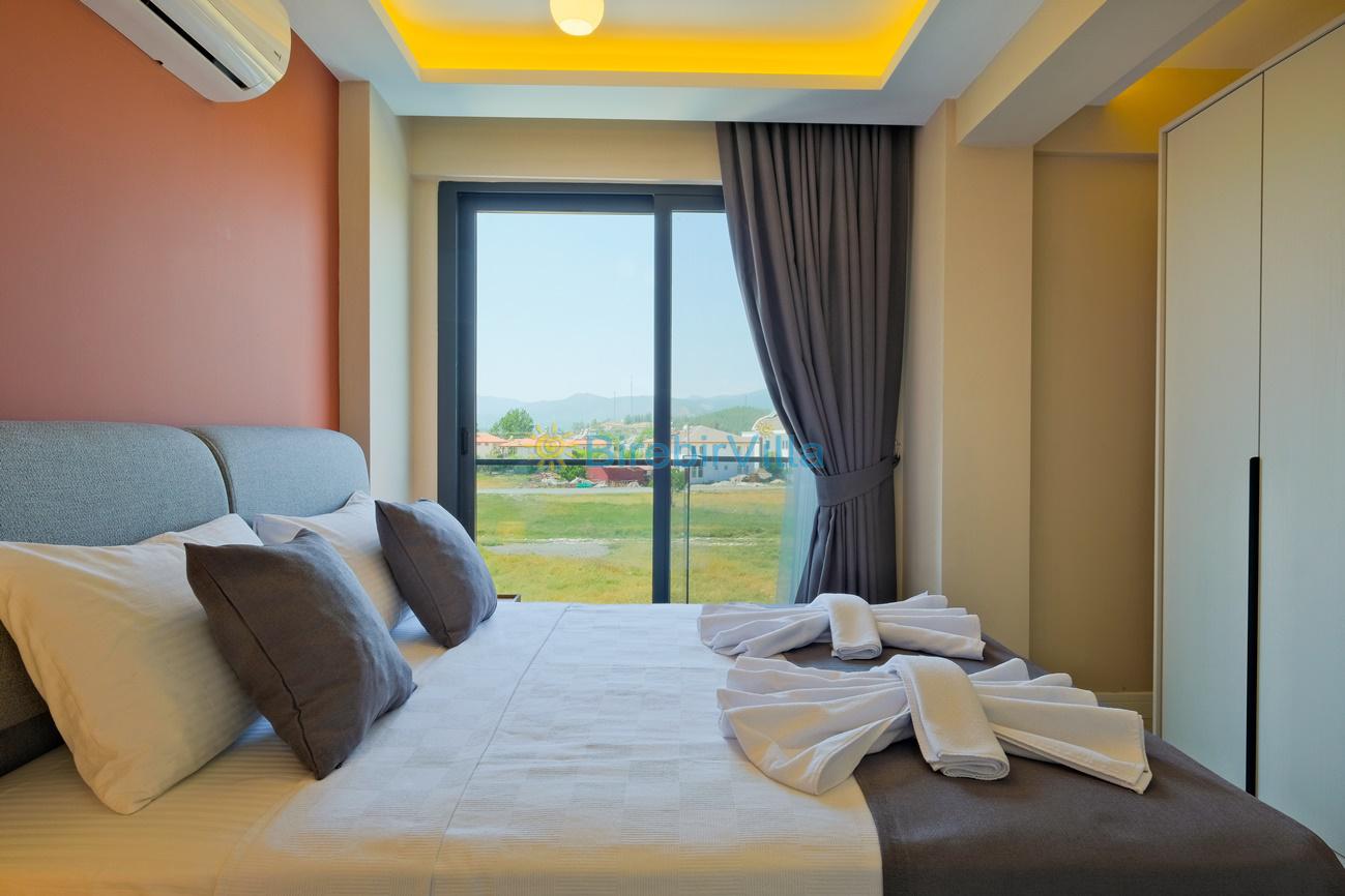 2.Yatak odası: Çift kişilik yatak, klima, ebeveyn banyo, komodin, elbise dolabı ve balkon bulunmaktadır.