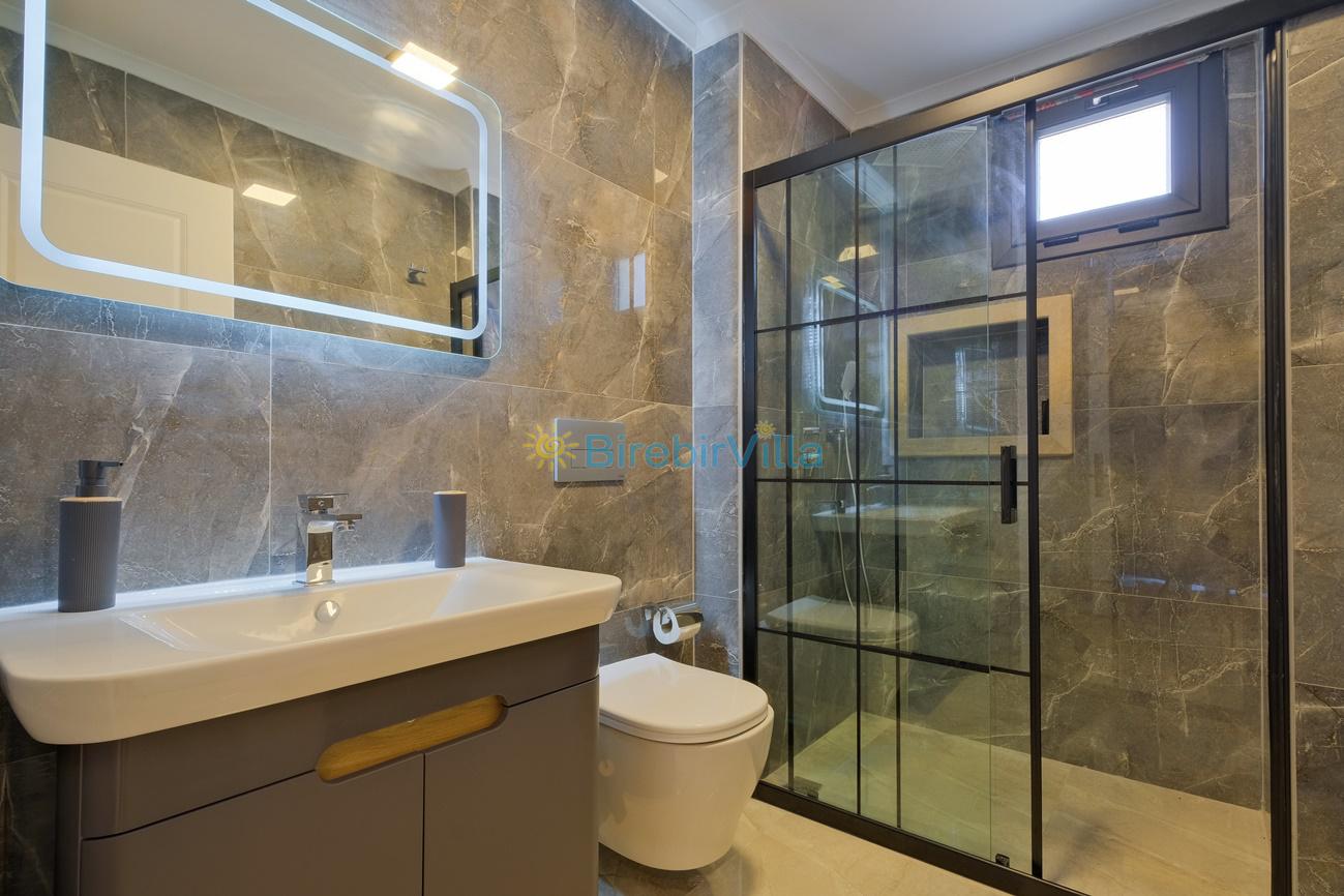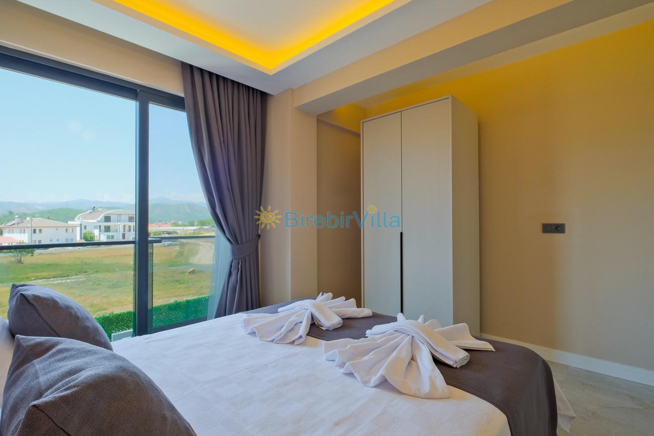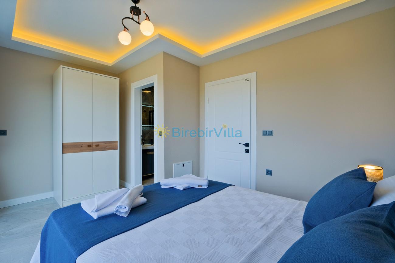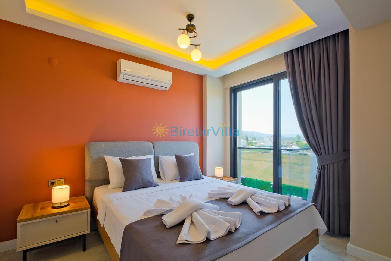 2.Yatak odası: Çift kişilik yatak, klima, ebeveyn banyo, komodin, elbise dolabı ve balkon bulunmaktadır.