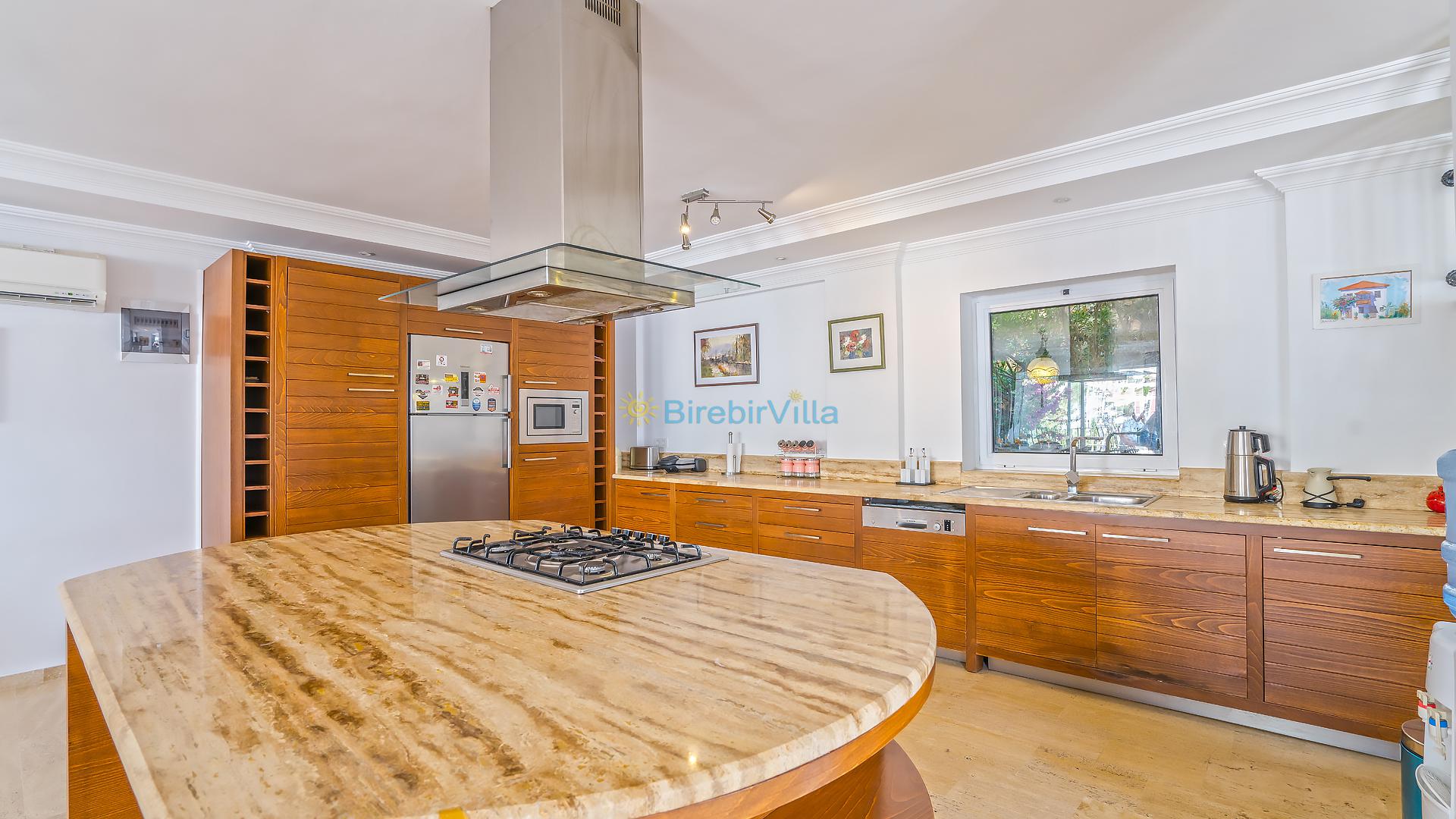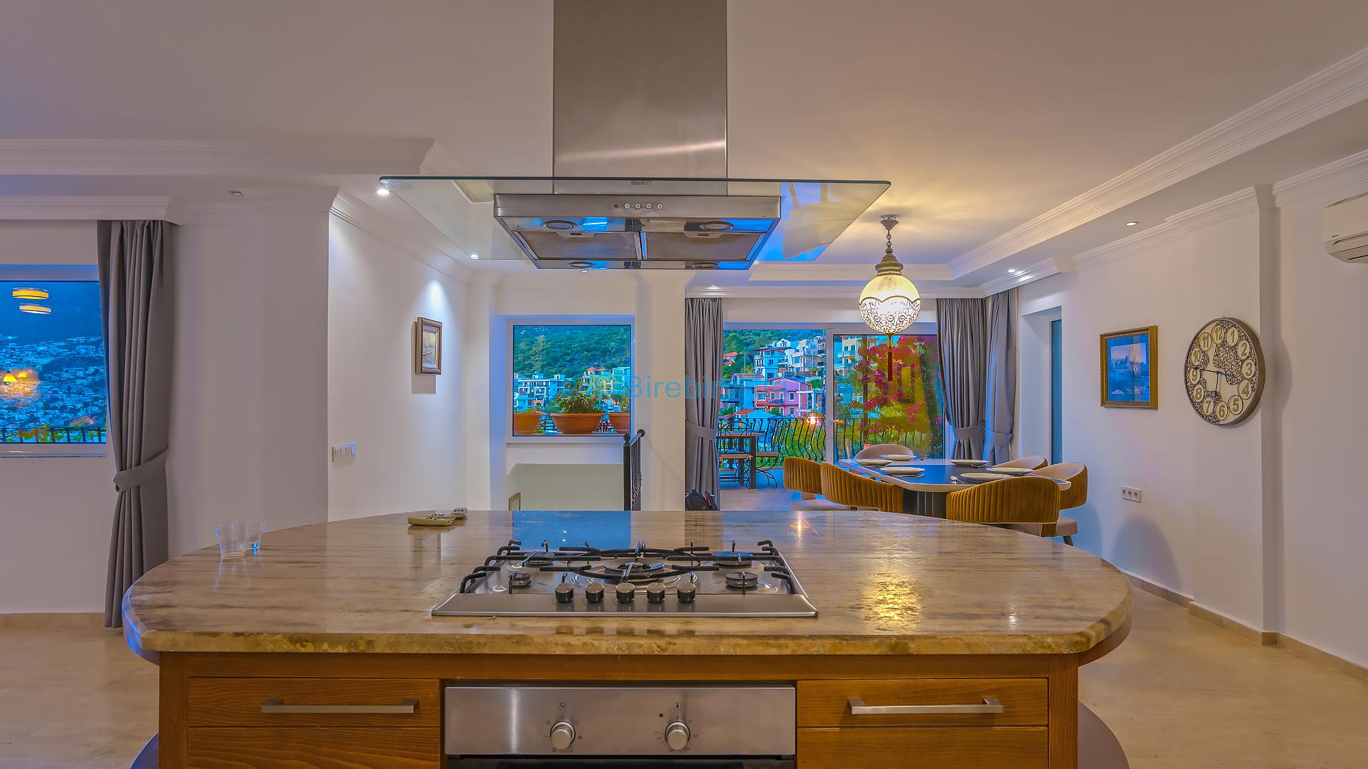Mutfak: Açık planlı ada mutfak, 10 kişi ve daha fazla kişiye yetecek kadar mutfak malzemeleri, bulaşık makinesi, çamaşır makinesi, fırın, ocak, buzdolabı, mikrodalga fırın, çaycı, tost makinesi, kahve makinesi ve kızartma makinesi bulunmaktadır.